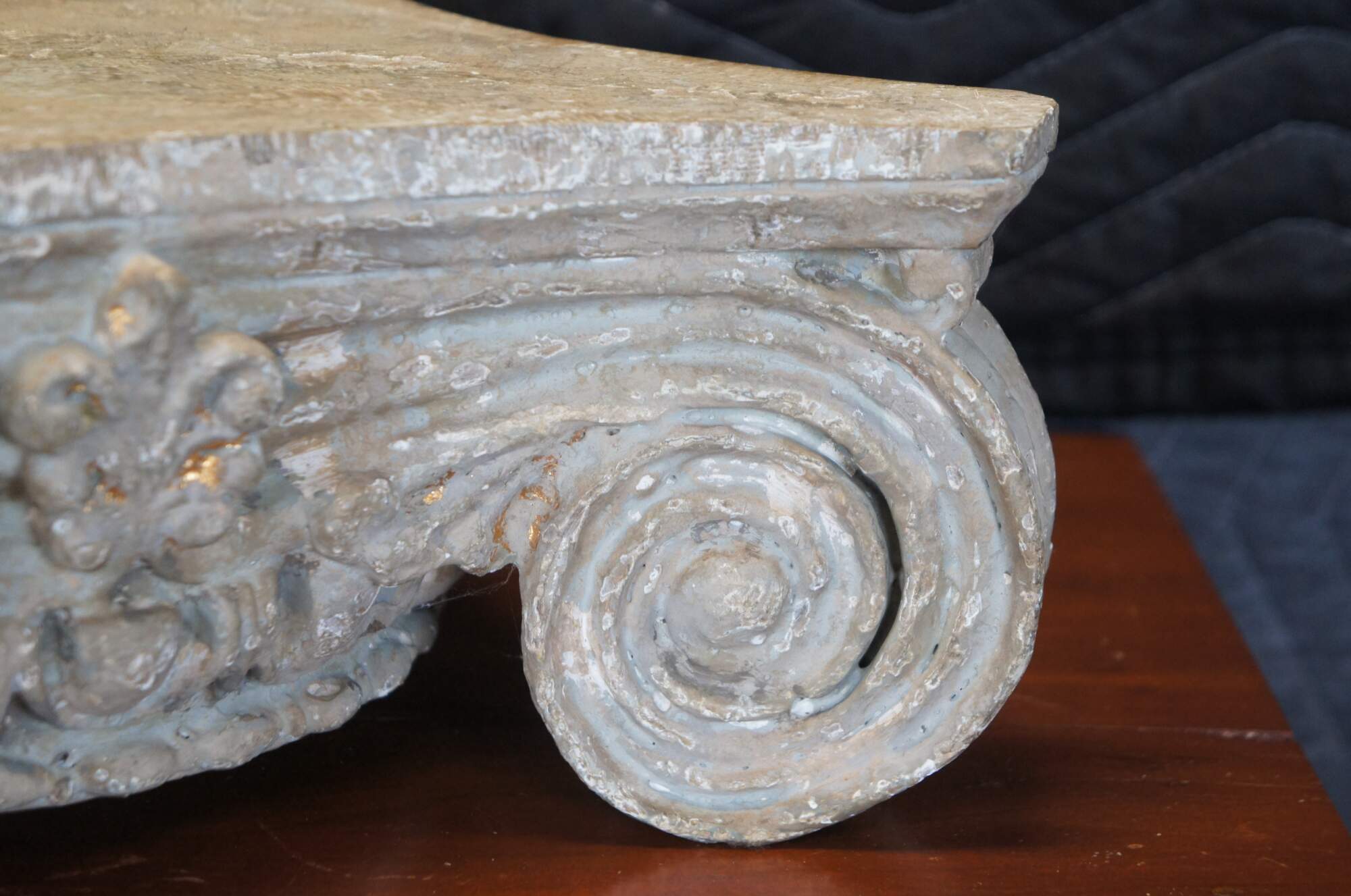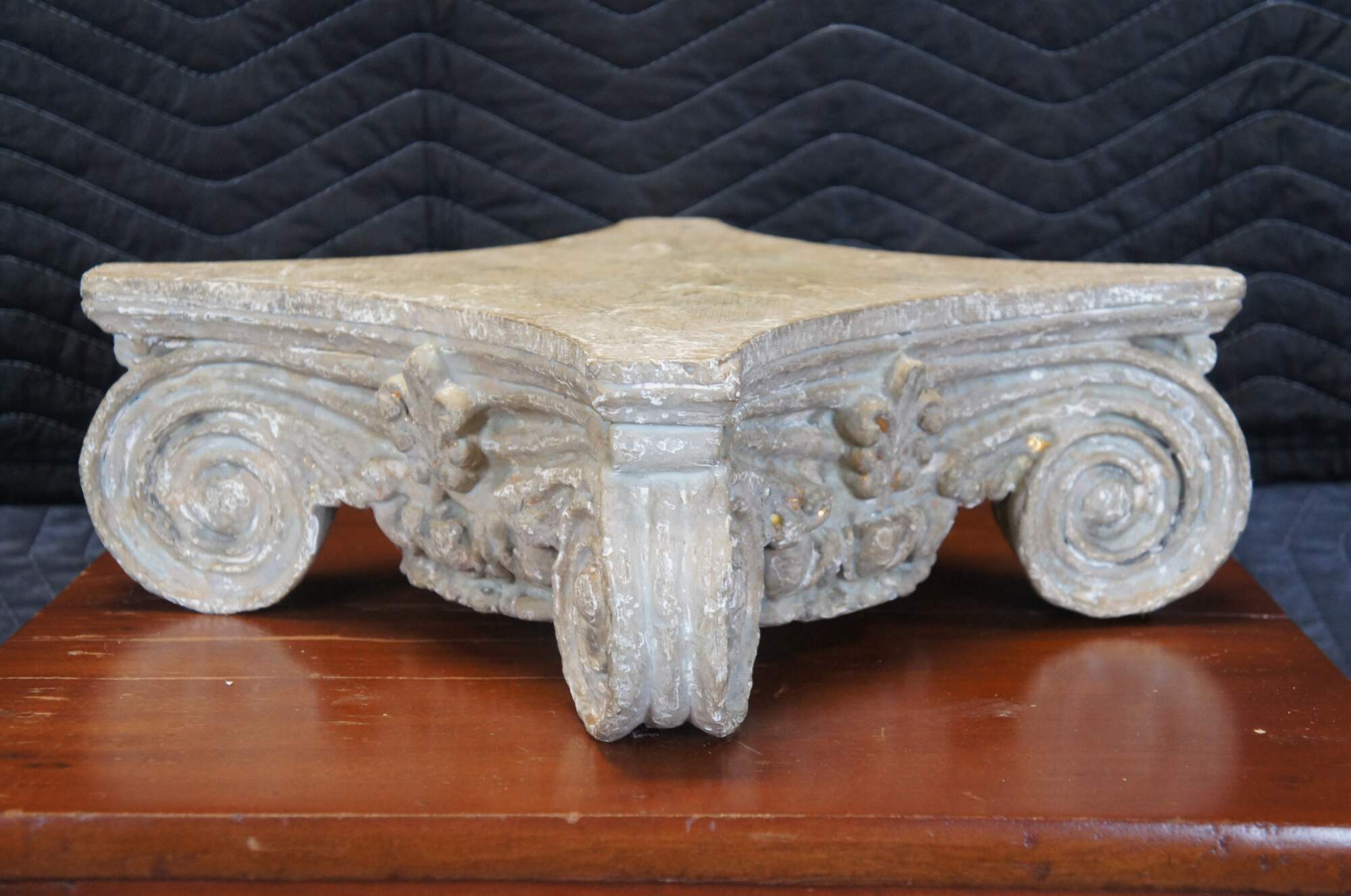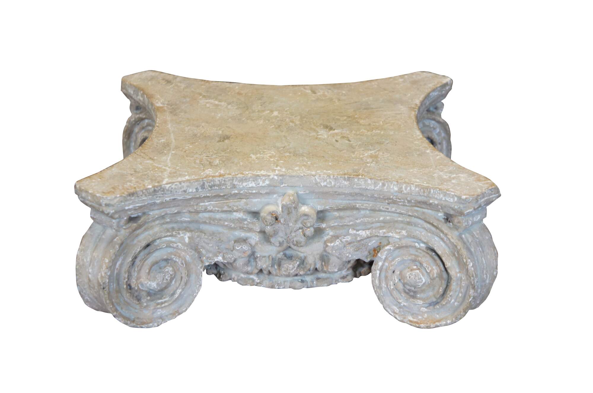 Pair of late 20th century heavy, faux marble / concrete low pedestals / risers in the shape of the carved achitectural capitals of a Greek / Roman ionic column with fleur de lis accents. Composit material with painted stone finish flecked with gilt accents.