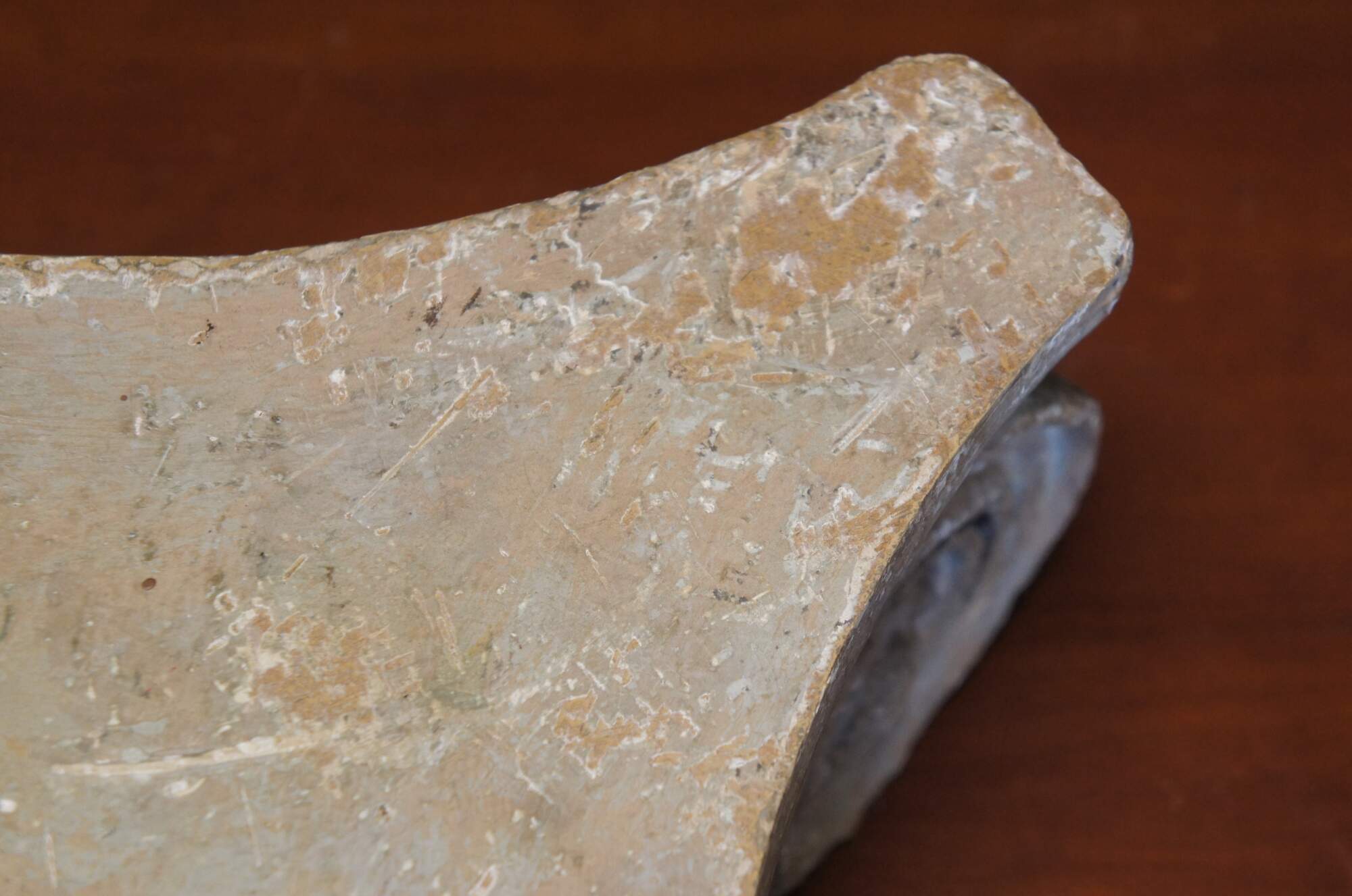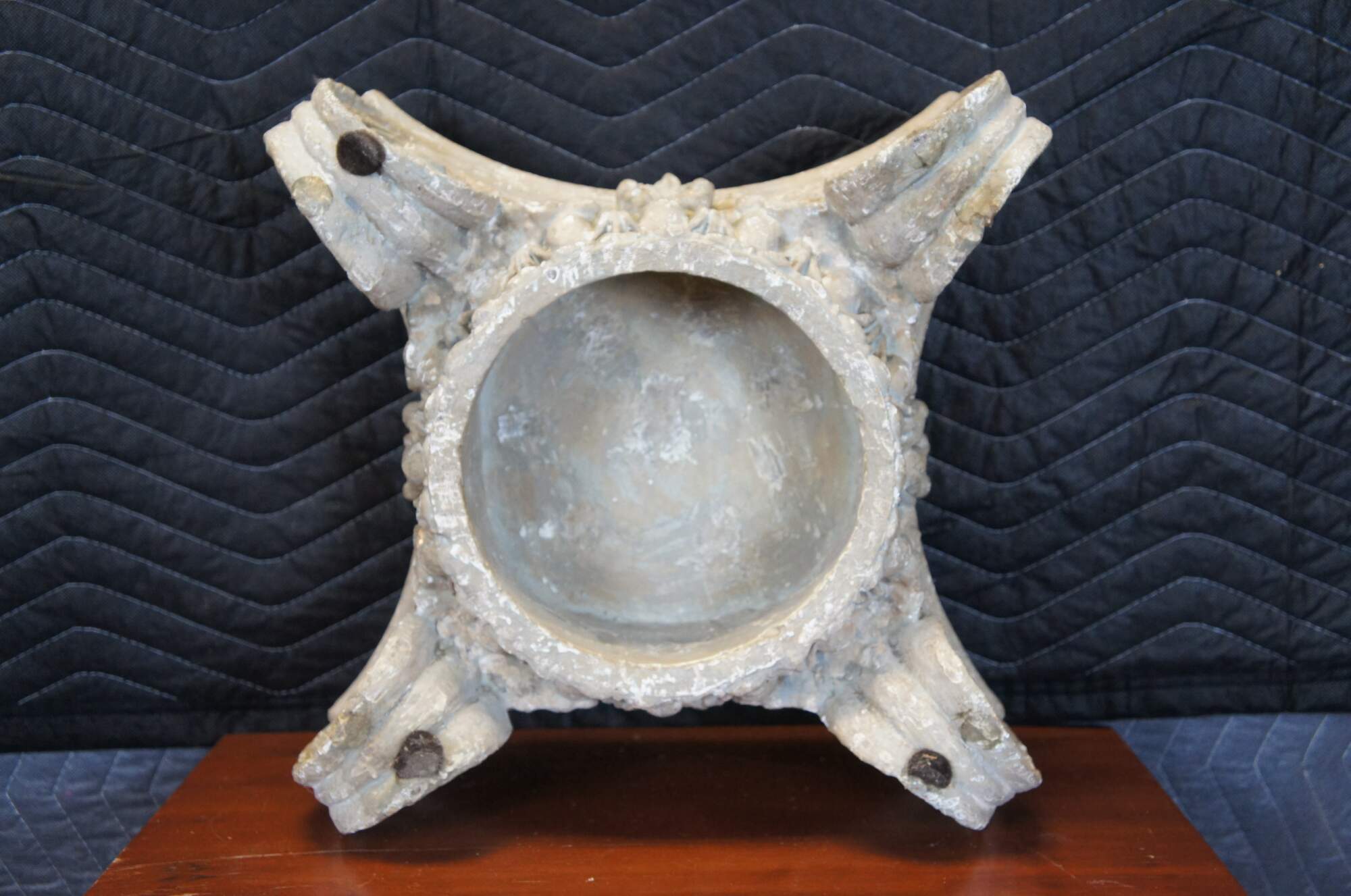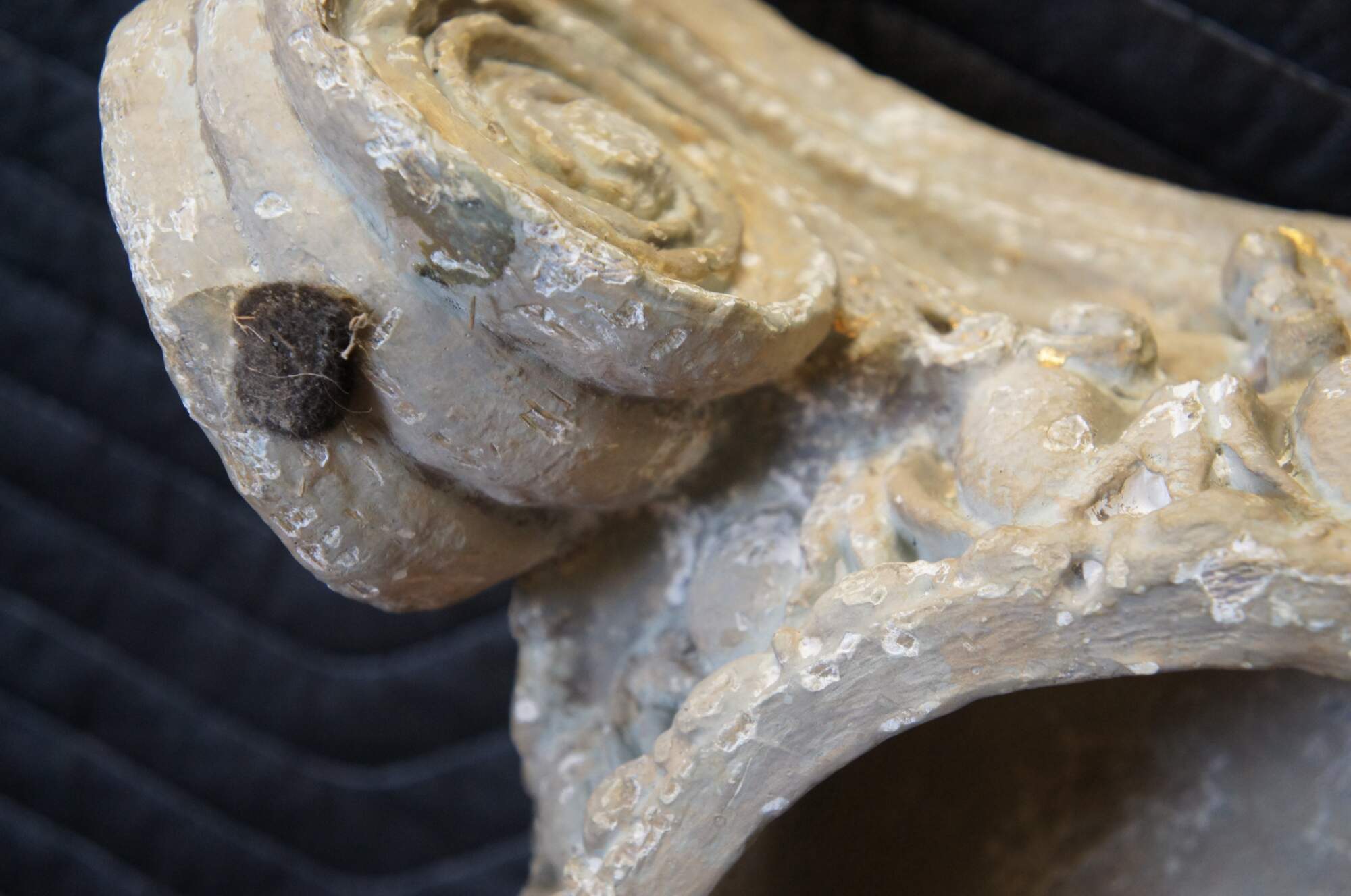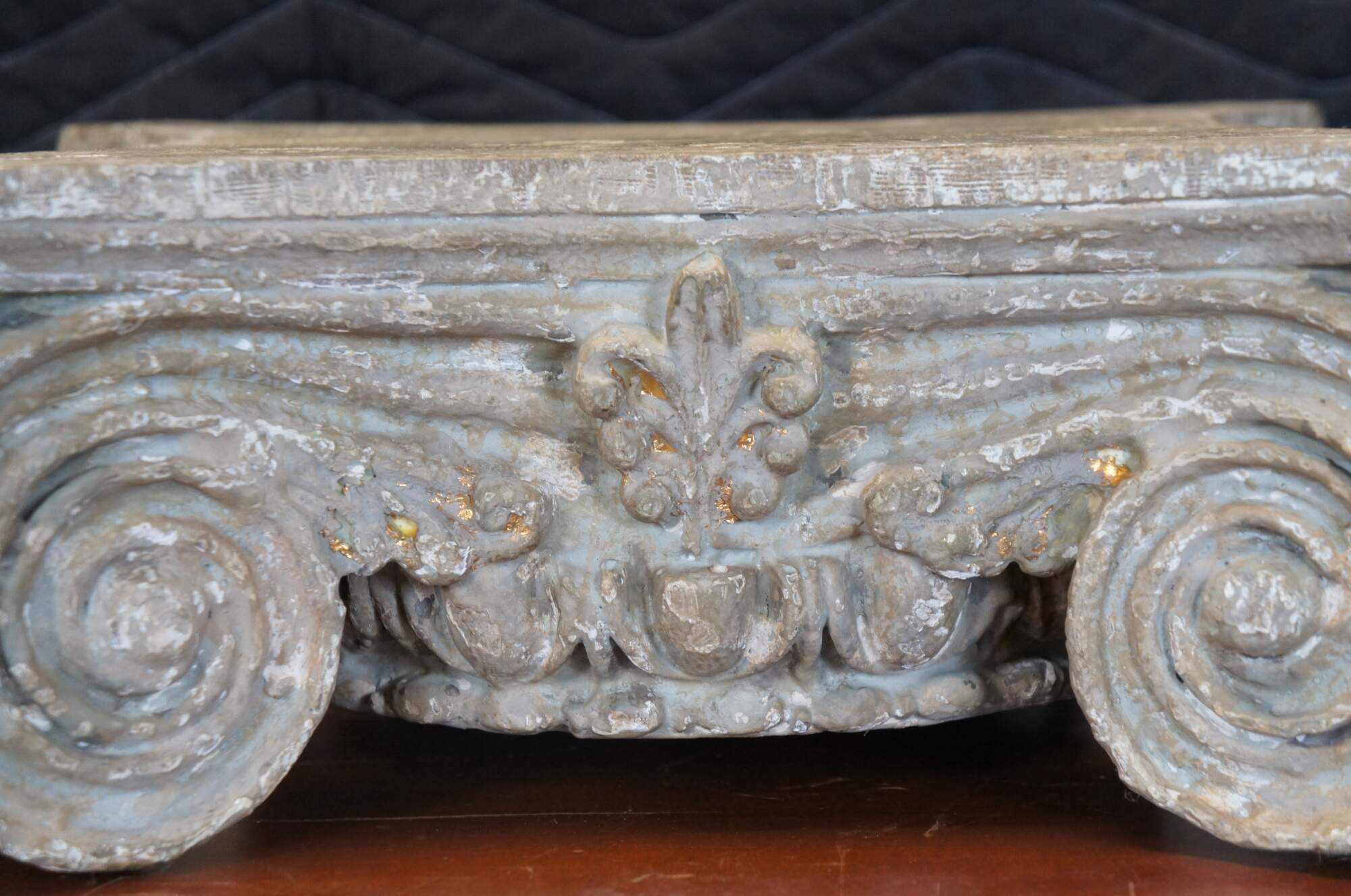 Pair of late 20th century heavy, faux marble / concrete low pedestals / risers in the shape of the carved achitectural capitals of a Greek / Roman ionic column with fleur de lis accents. Composit material with painted stone finish flecked with gilt accents.