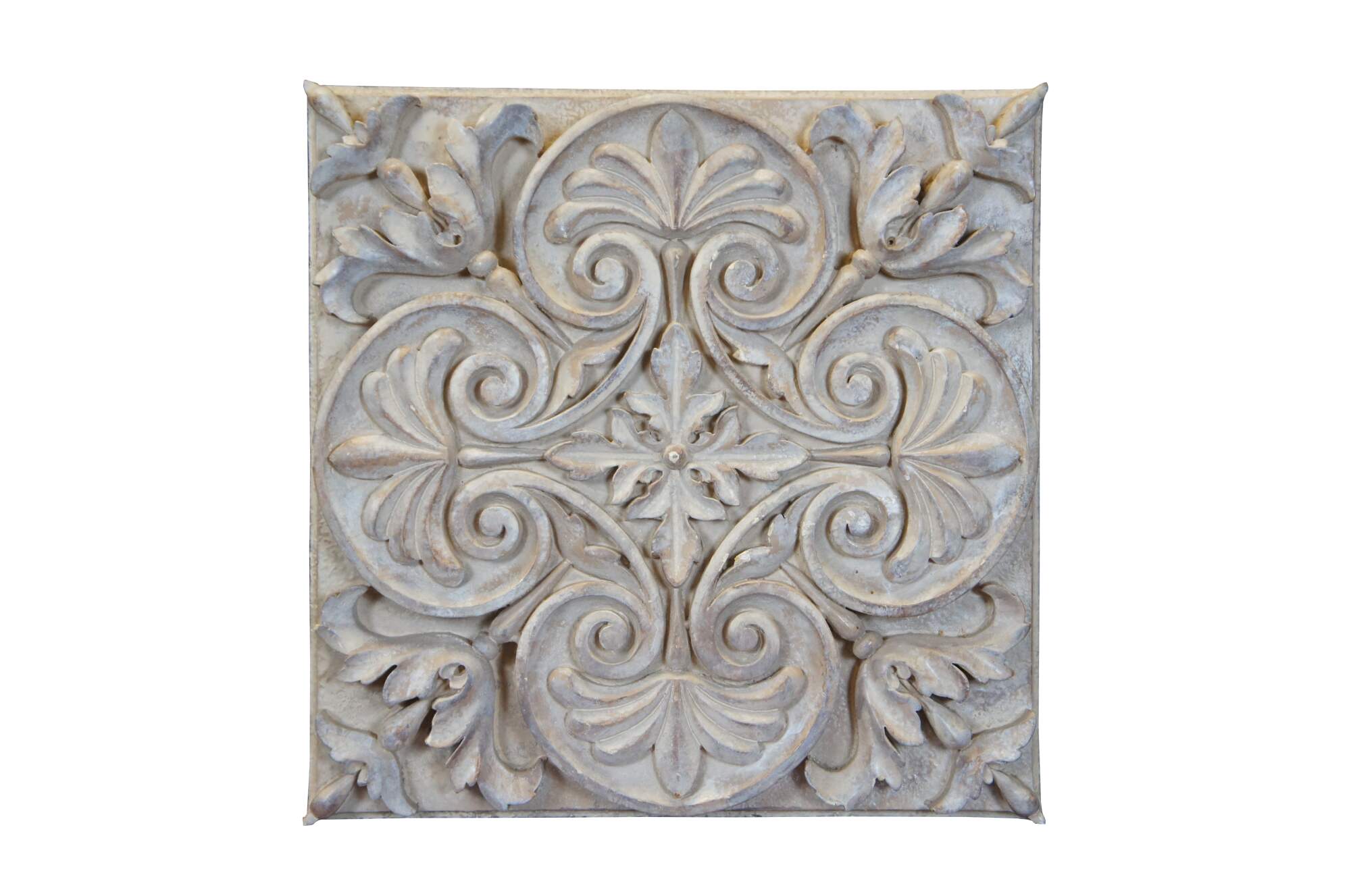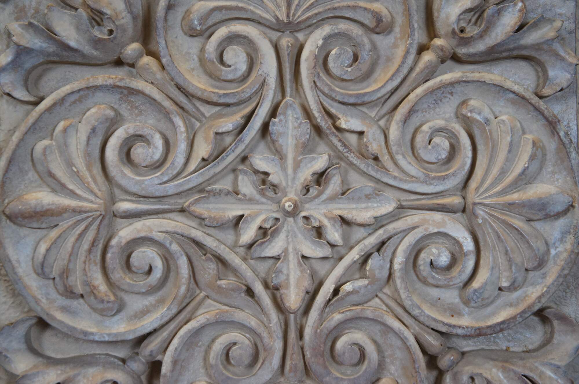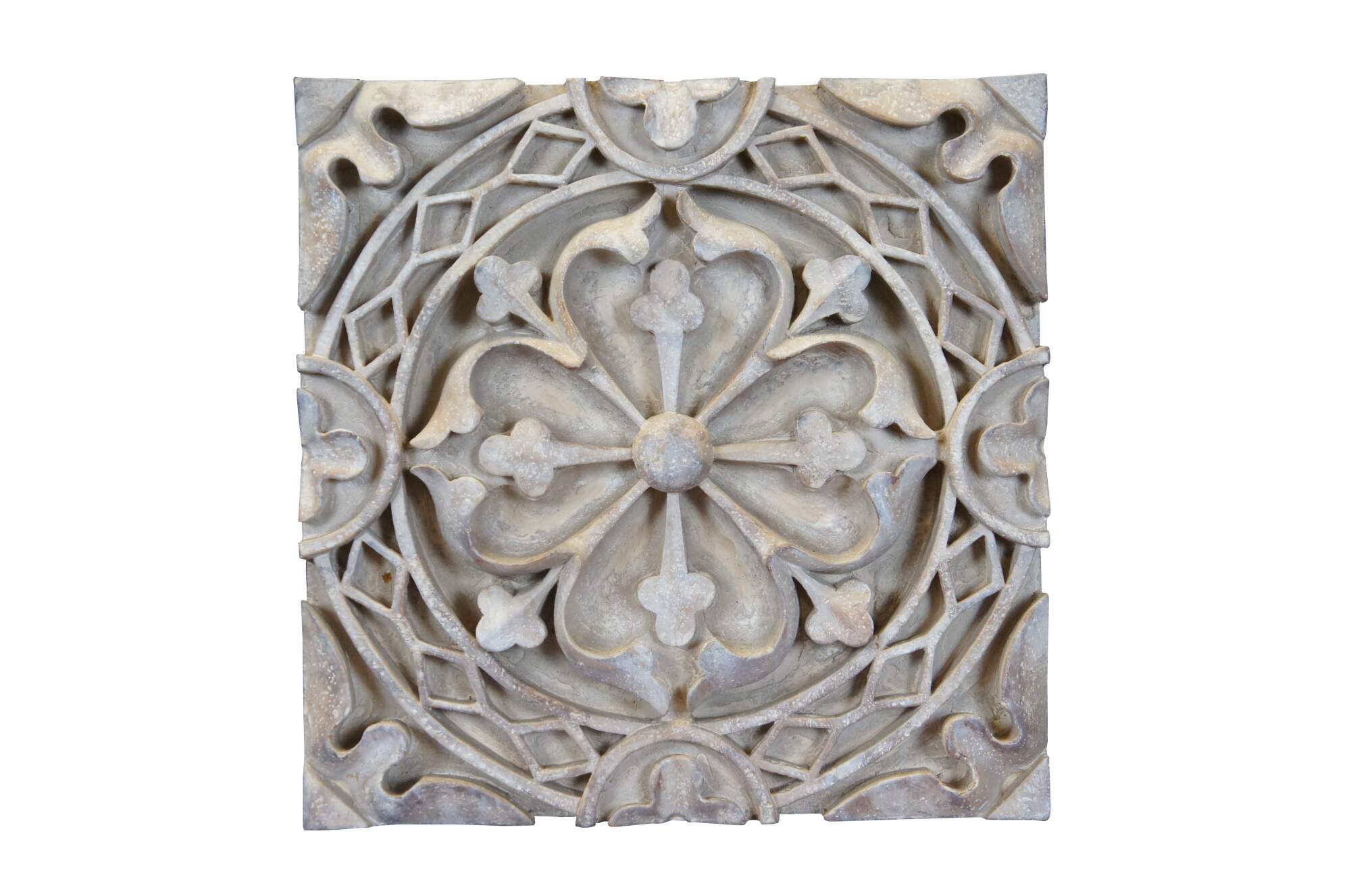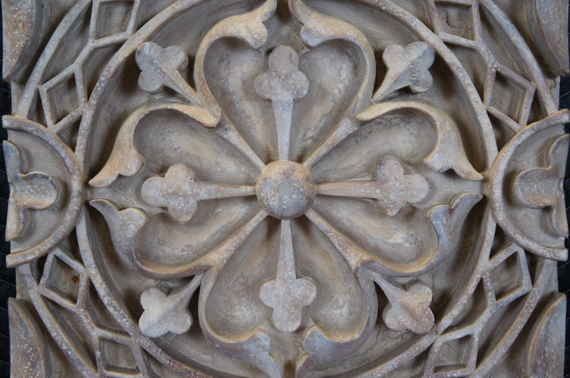 Pair of large late 20th century faux stone wall decor tiles depicting Gothic / Neoclassical floral / acanthus leaf designs in bas relief, after neoclassical architectural carvings.