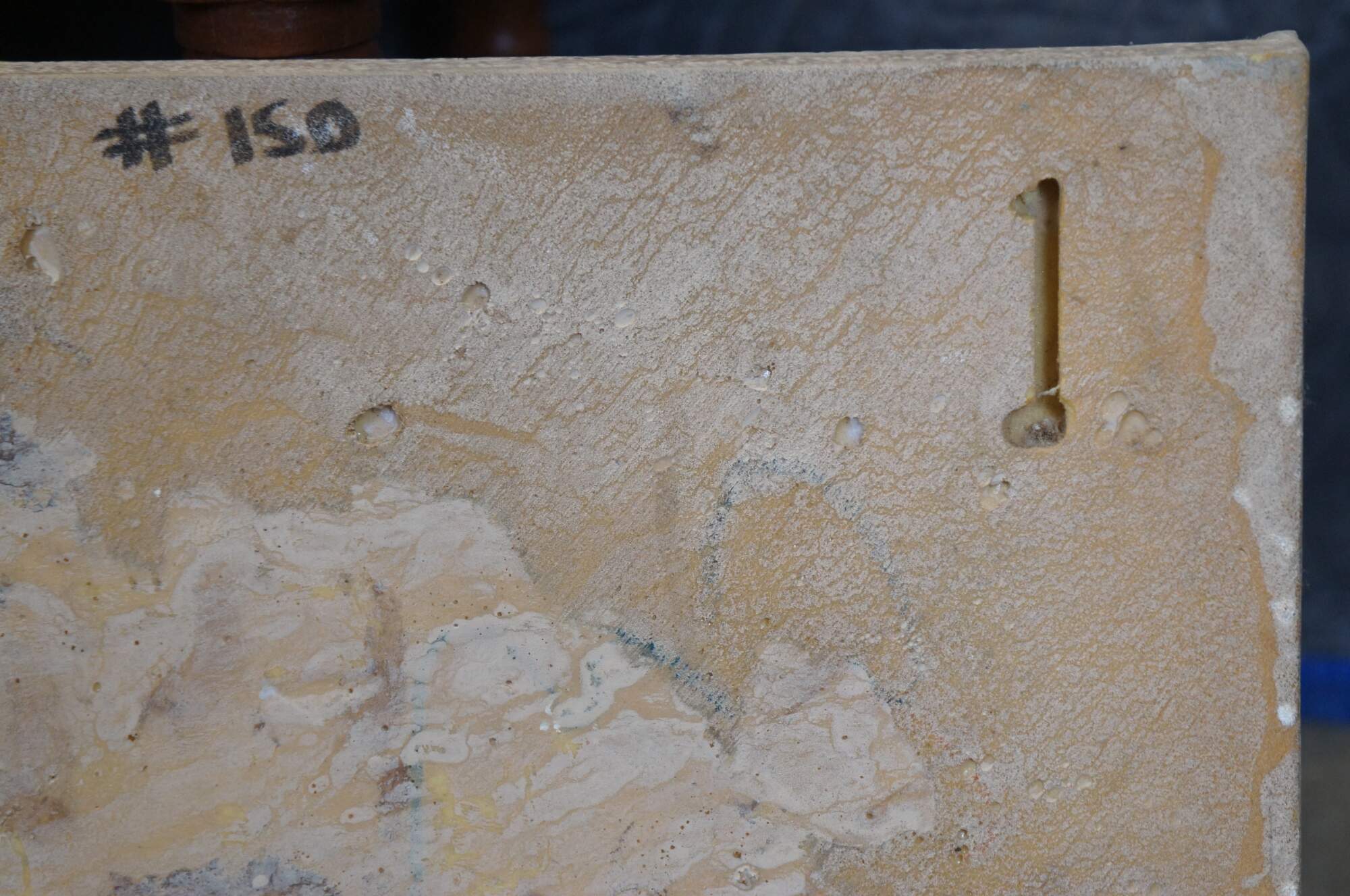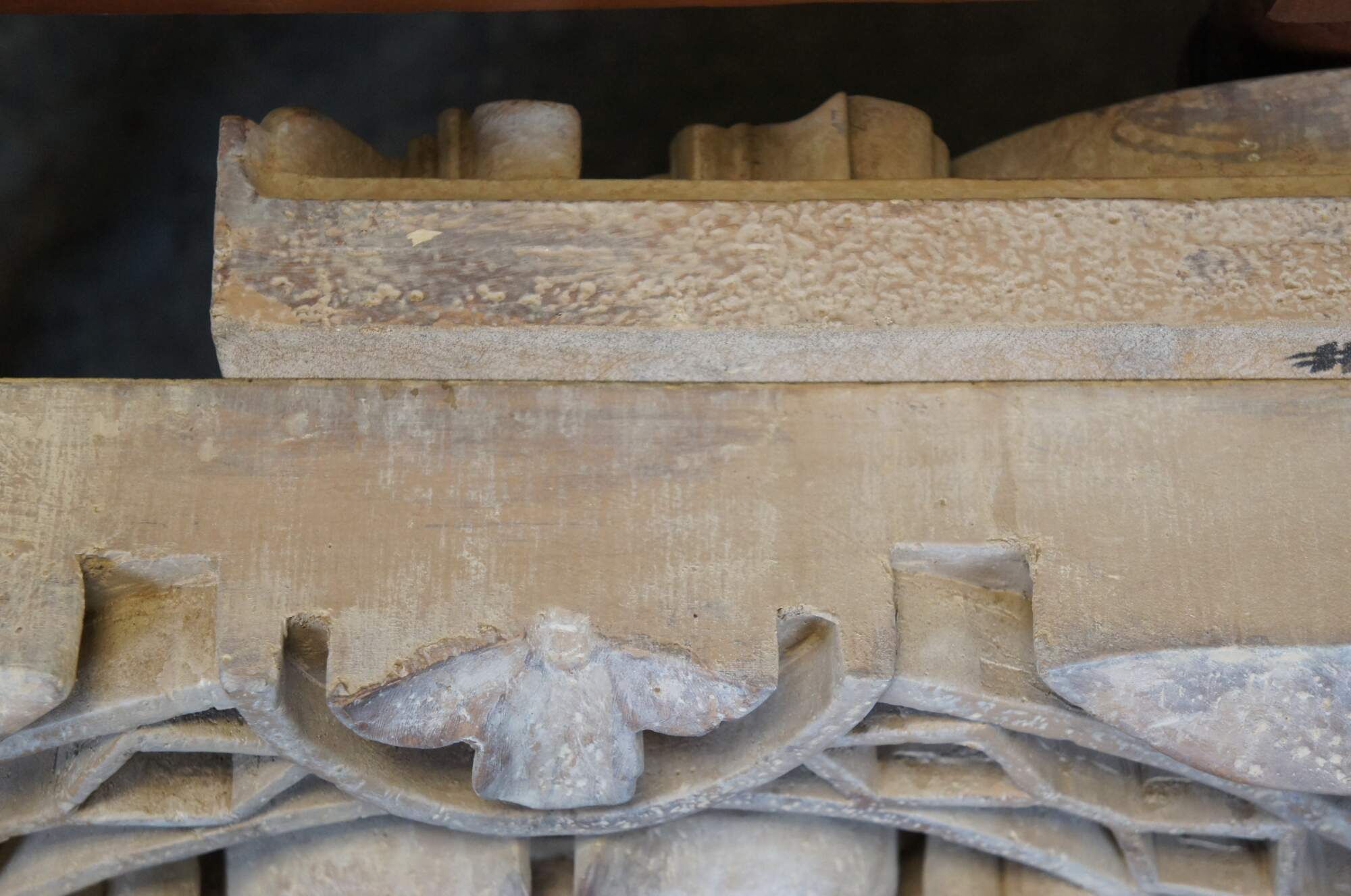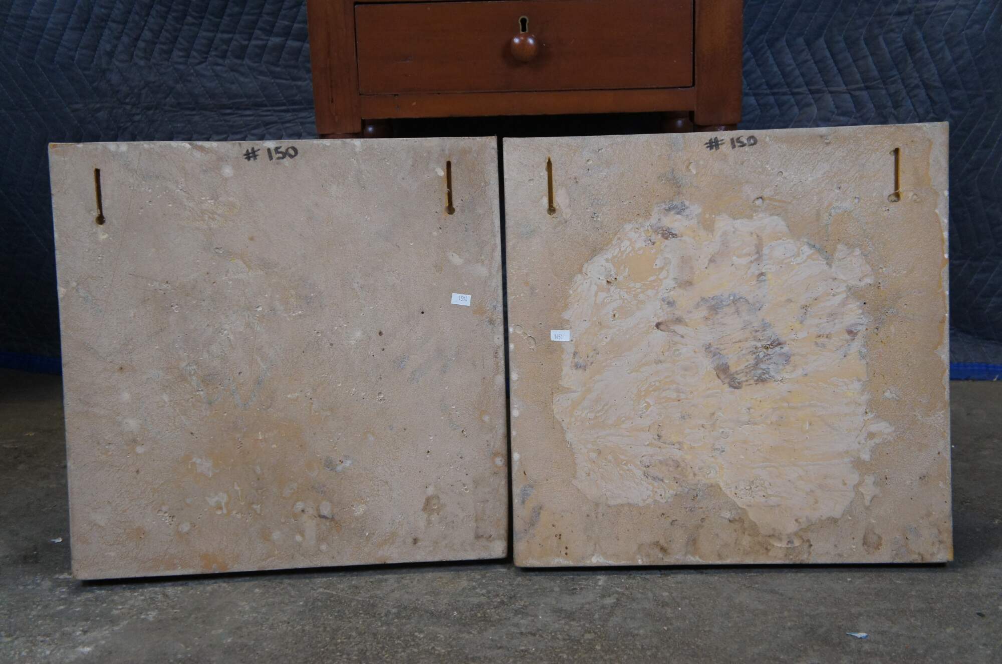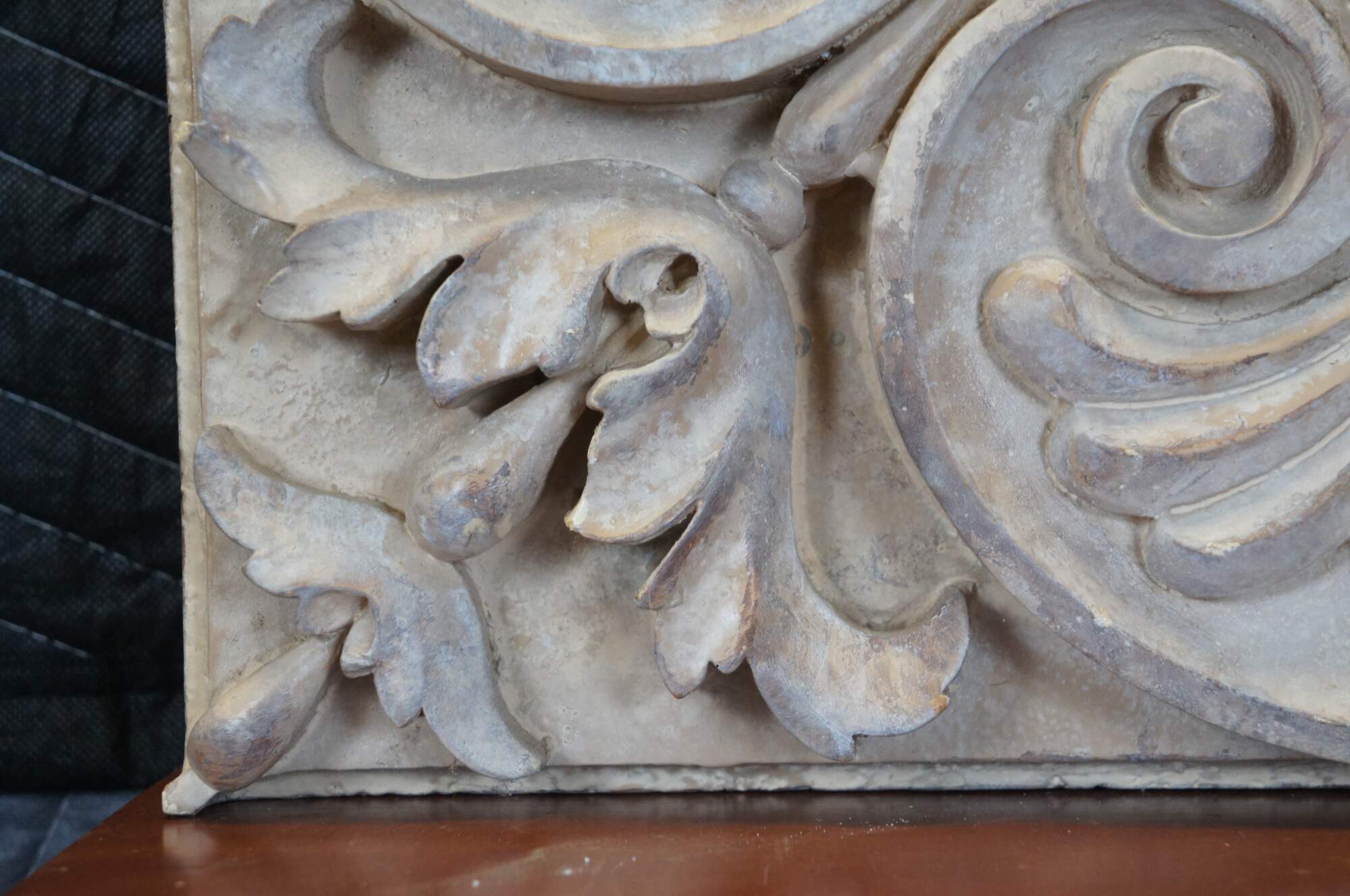 Pair of large late 20th century faux stone wall decor tiles depicting Gothic / Neoclassical floral / acanthus leaf designs in bas relief, after neoclassical architectural carvings.