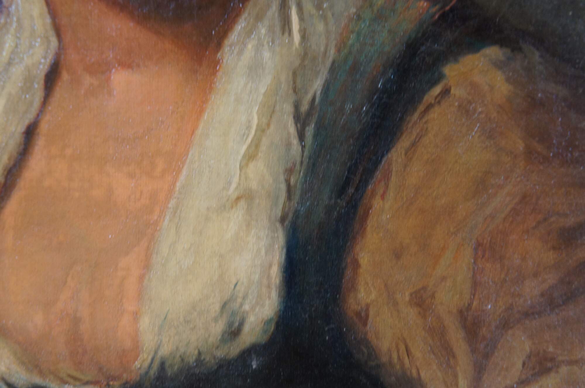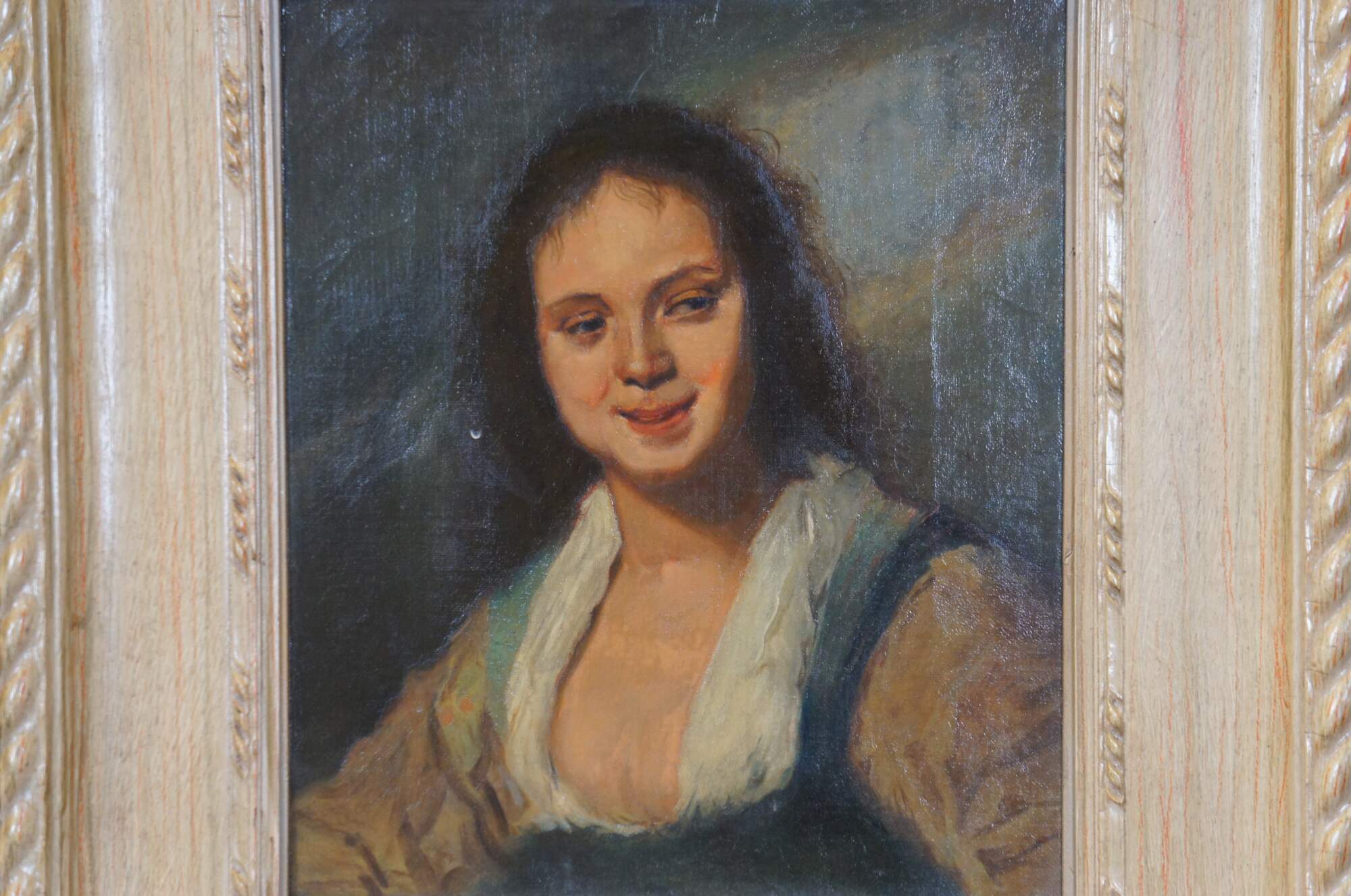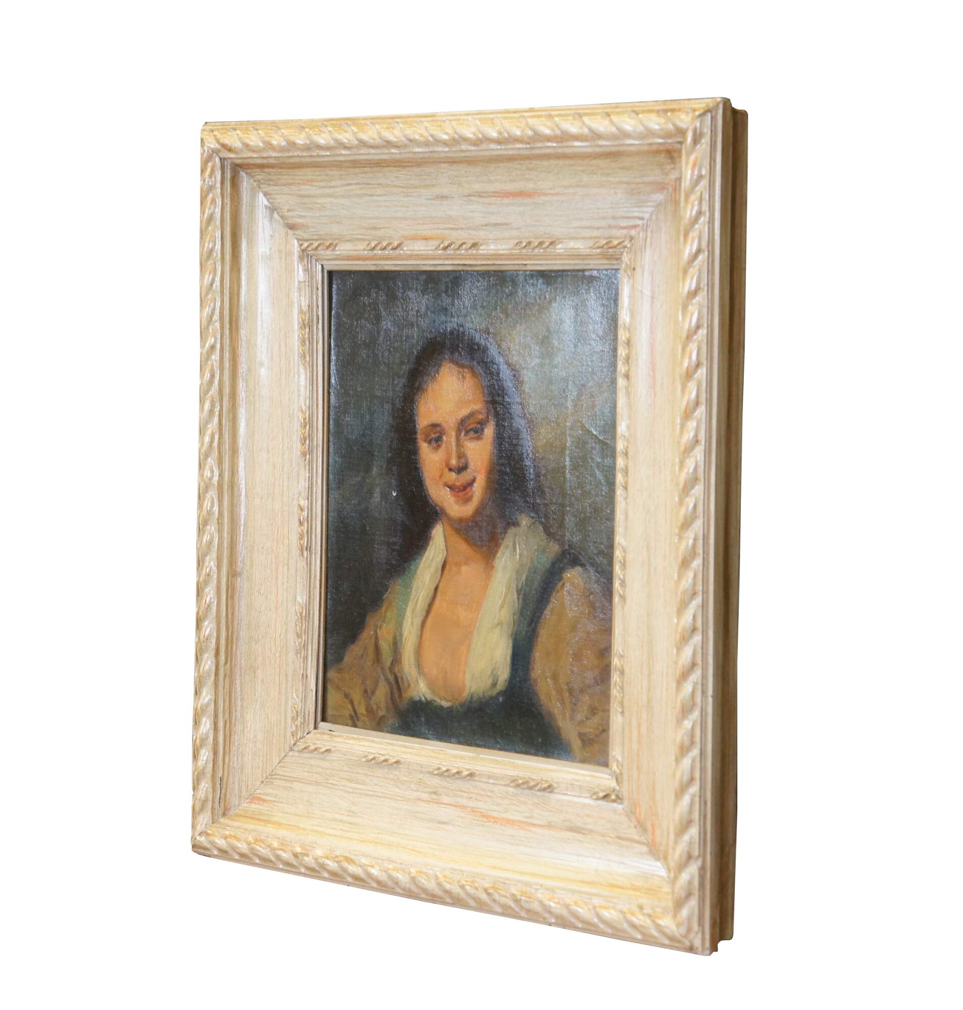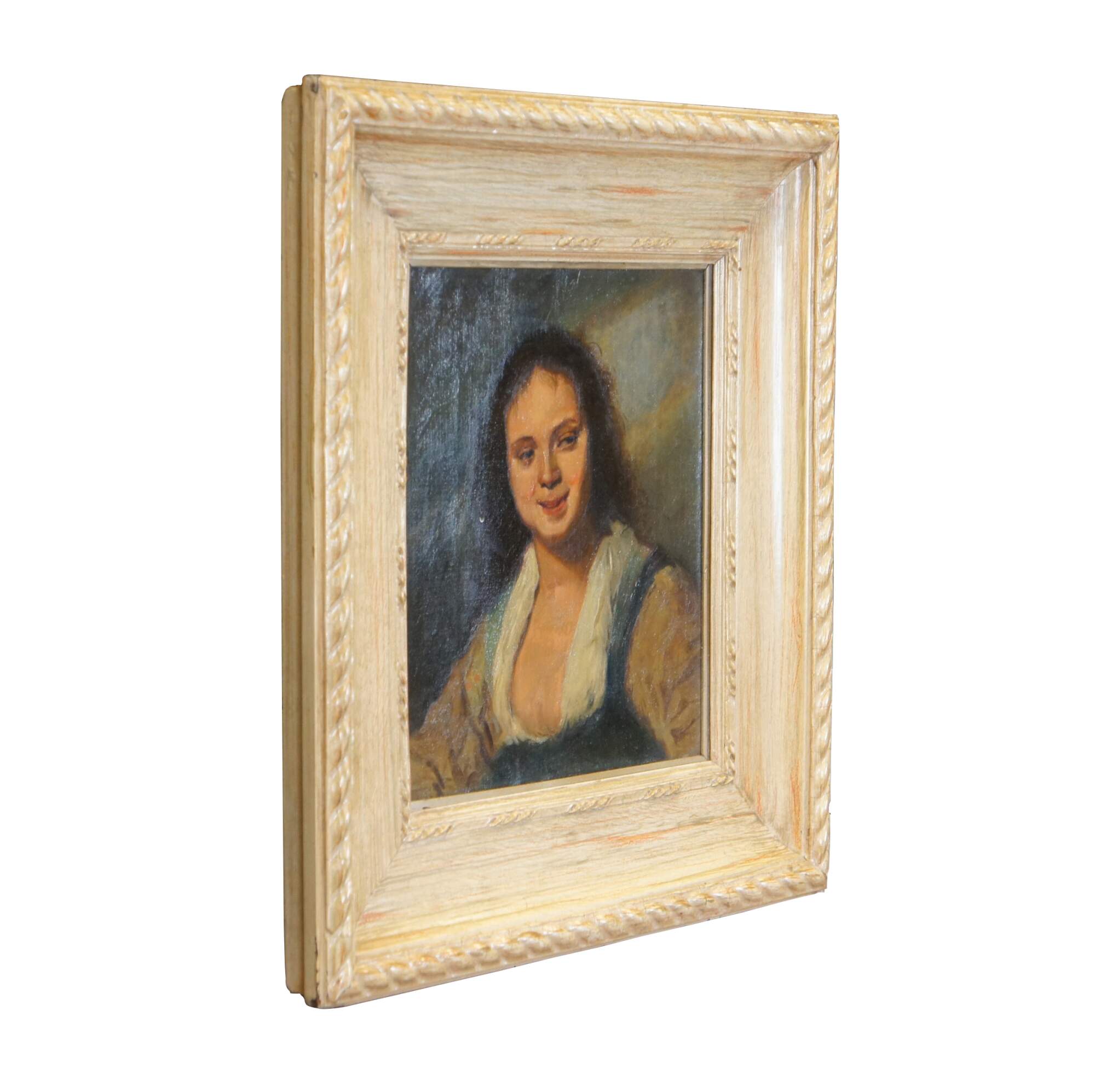 Early 20th century oil on canvas painting after Frans Hals' work known as "The Gypsy Girl." Depicts a young peasant woman with brown hair and lowf fronted blue bodice (as opposed to the original reddish orange). Beveled wood frame, painted to remeble pickled oak, with rope twist carved details. Gallery sticker from Harley L. Bickmore art collector / dealer to verso; Bickmore was long associated with the Closson Gallery Company, and owner of a gallery on 413 Race Street in Cincinnati.