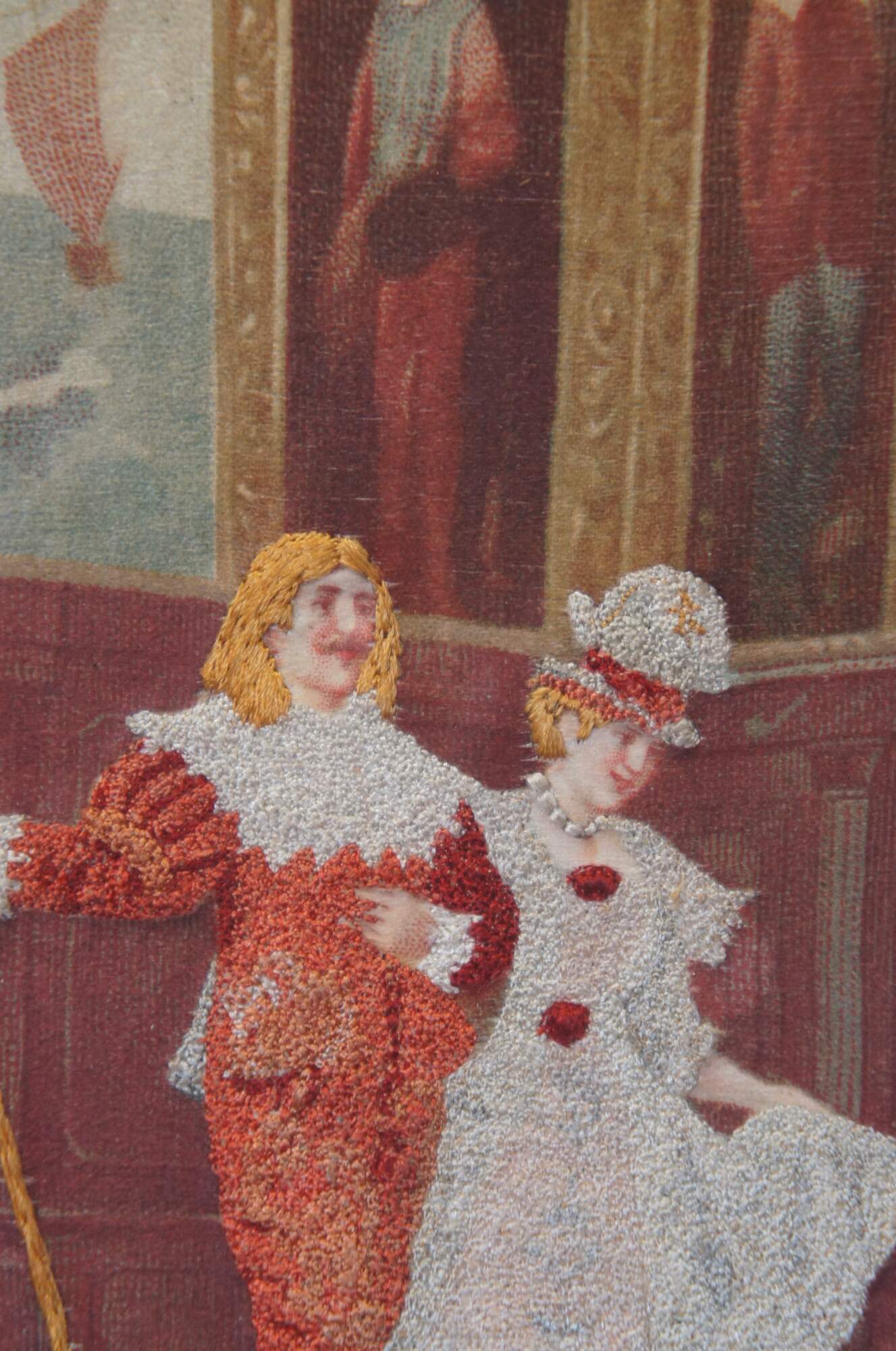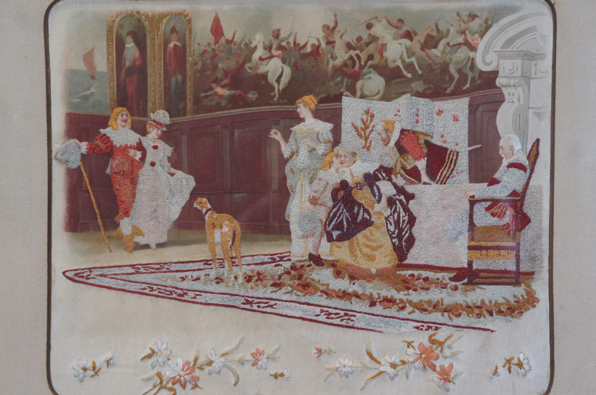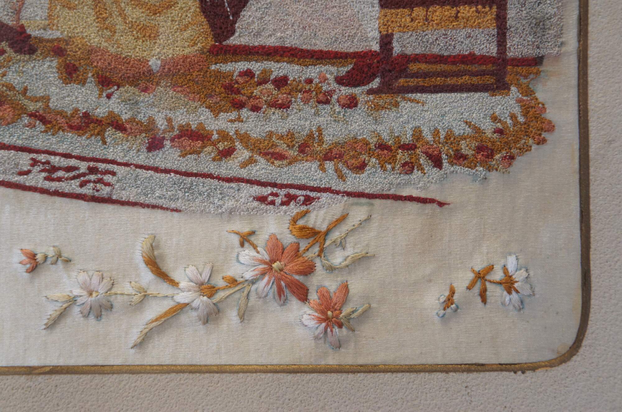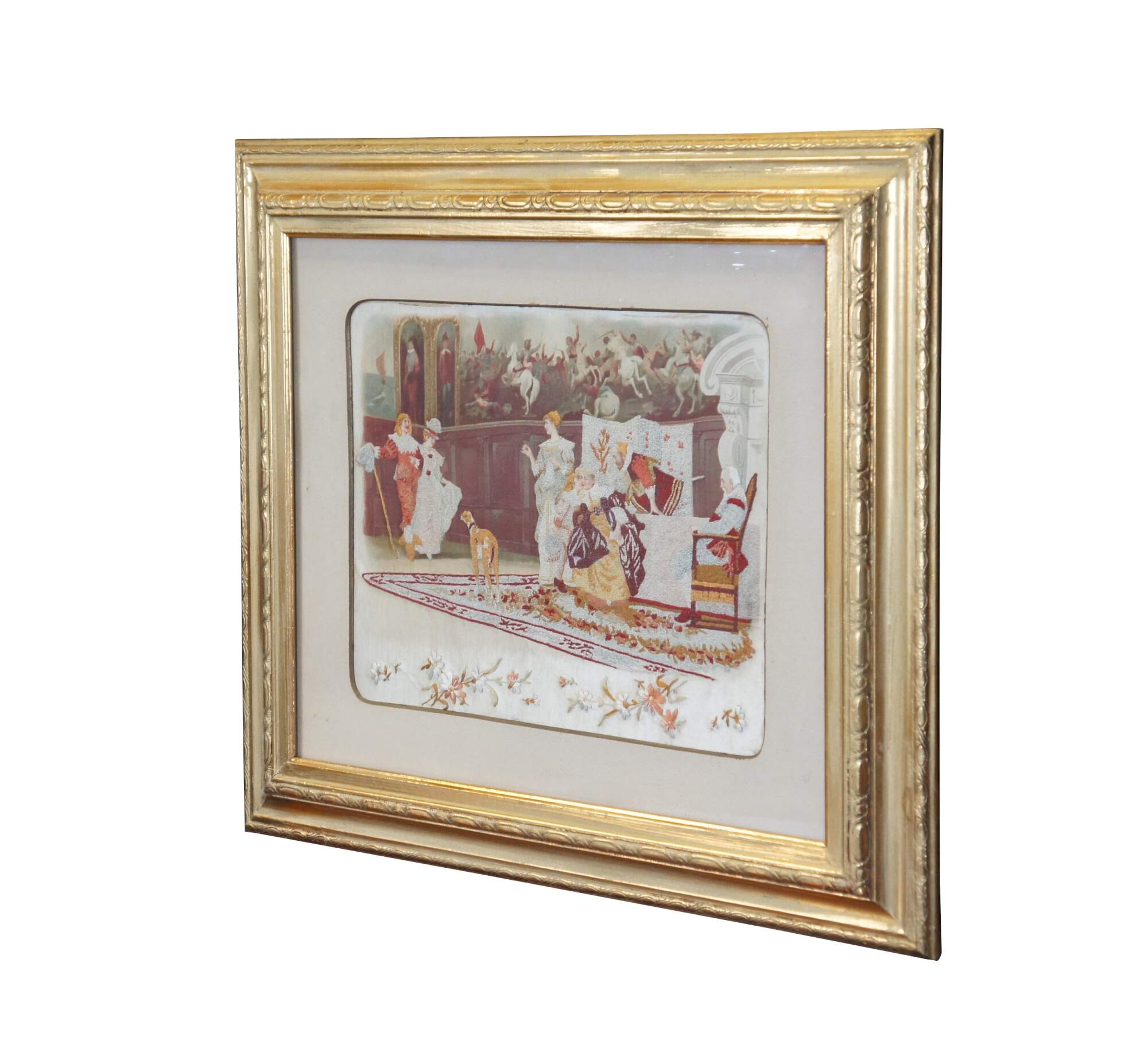 Rare antique framed folk art needlepoint textile panel / tapestry - a scene of European nobility seated in a great room with equestrian battle themed design, greeting figures in traditional Renaissance attire. Printed on silk and embellished with embroidered wool work texture and details. Beveled gilt wood frame with carved detail; white and gold edged mat.