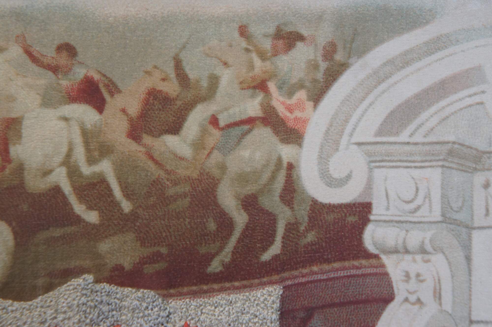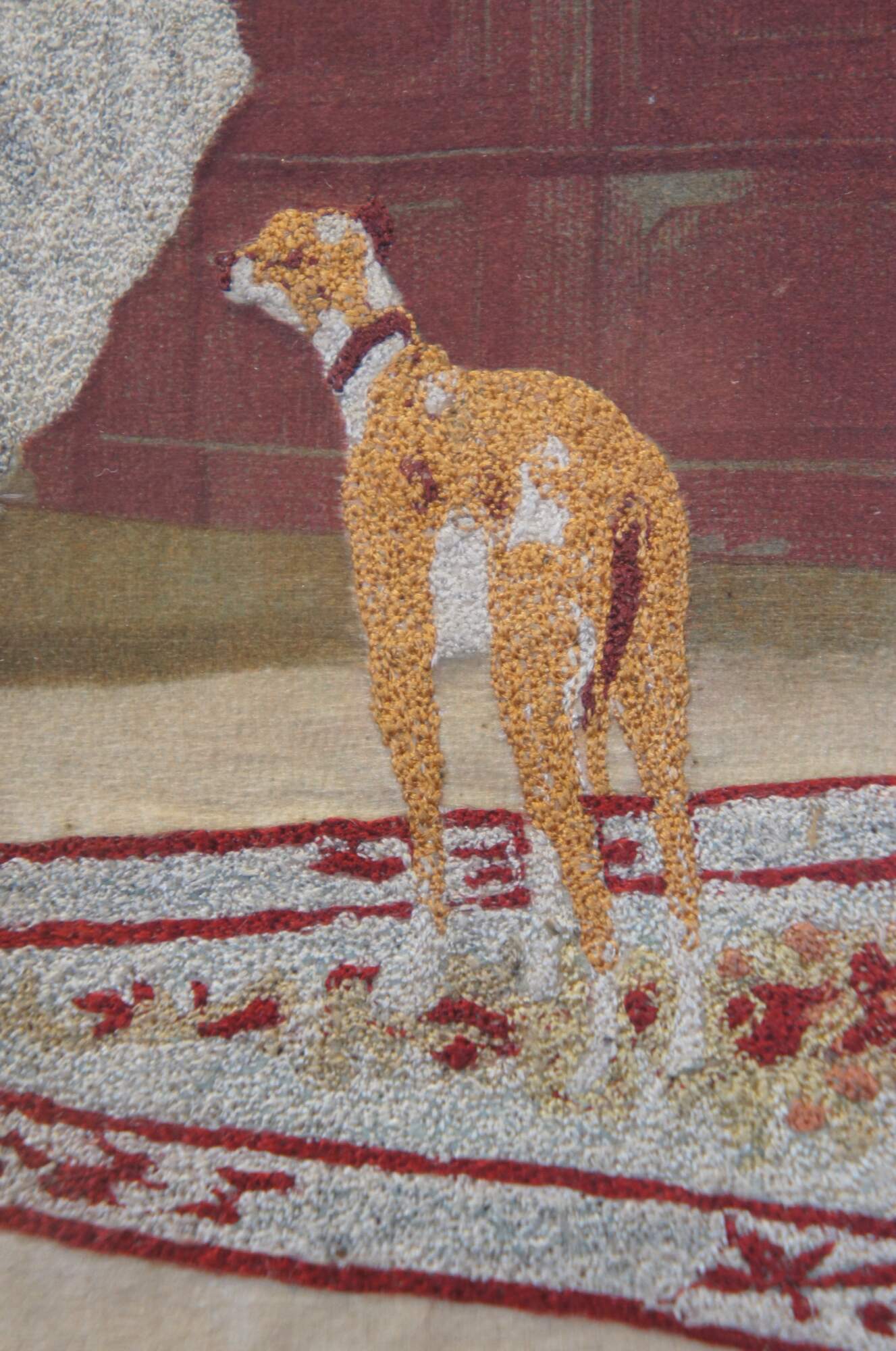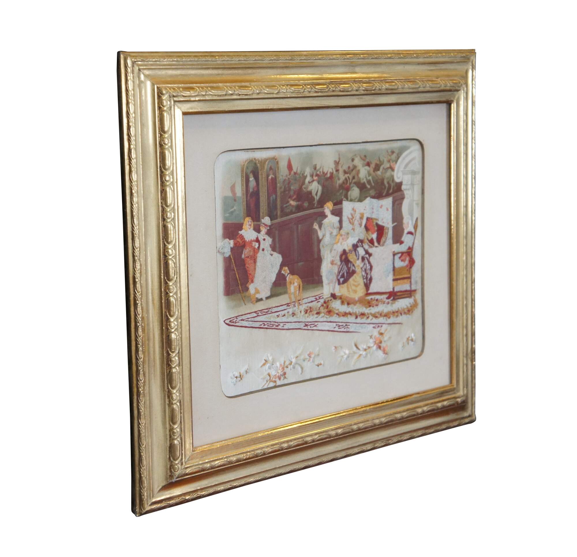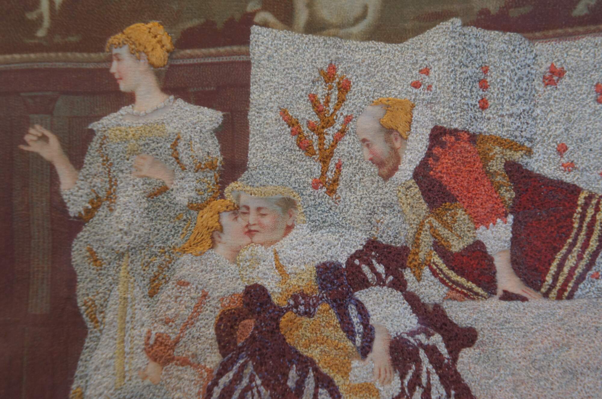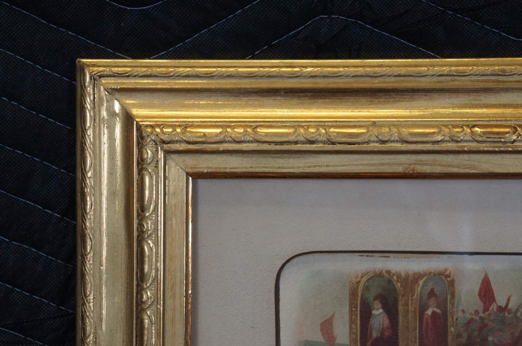 Rare antique framed folk art needlepoint textile panel / tapestry - a scene of European nobility seated in a great room with equestrian battle themed design, greeting figures in traditional Renaissance attire. Printed on silk and embellished with embroidered wool work texture and details. Beveled gilt wood frame with carved detail; white and gold edged mat.