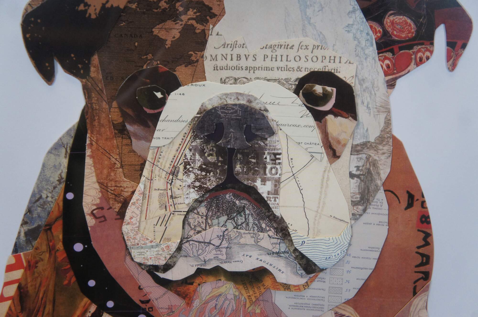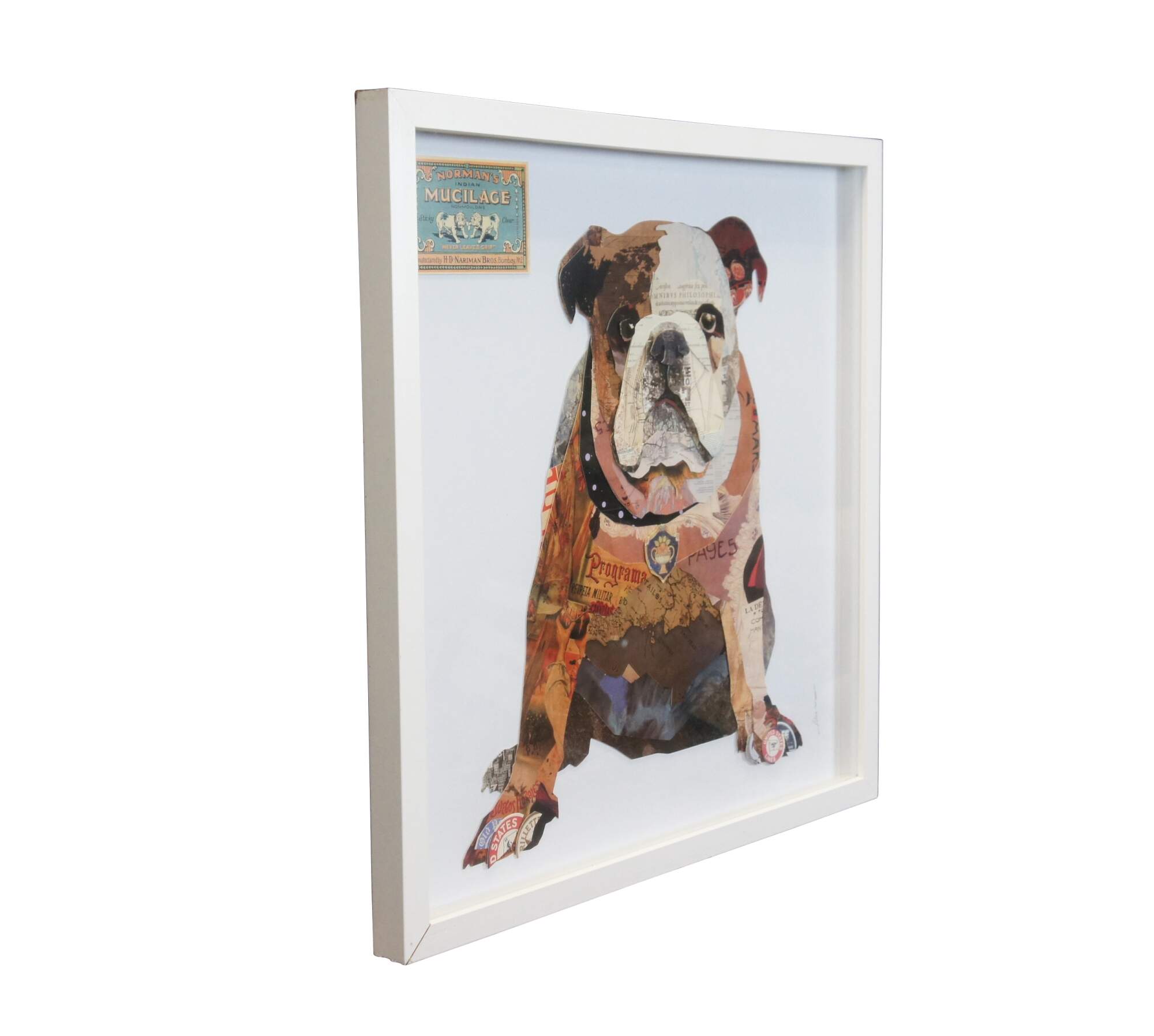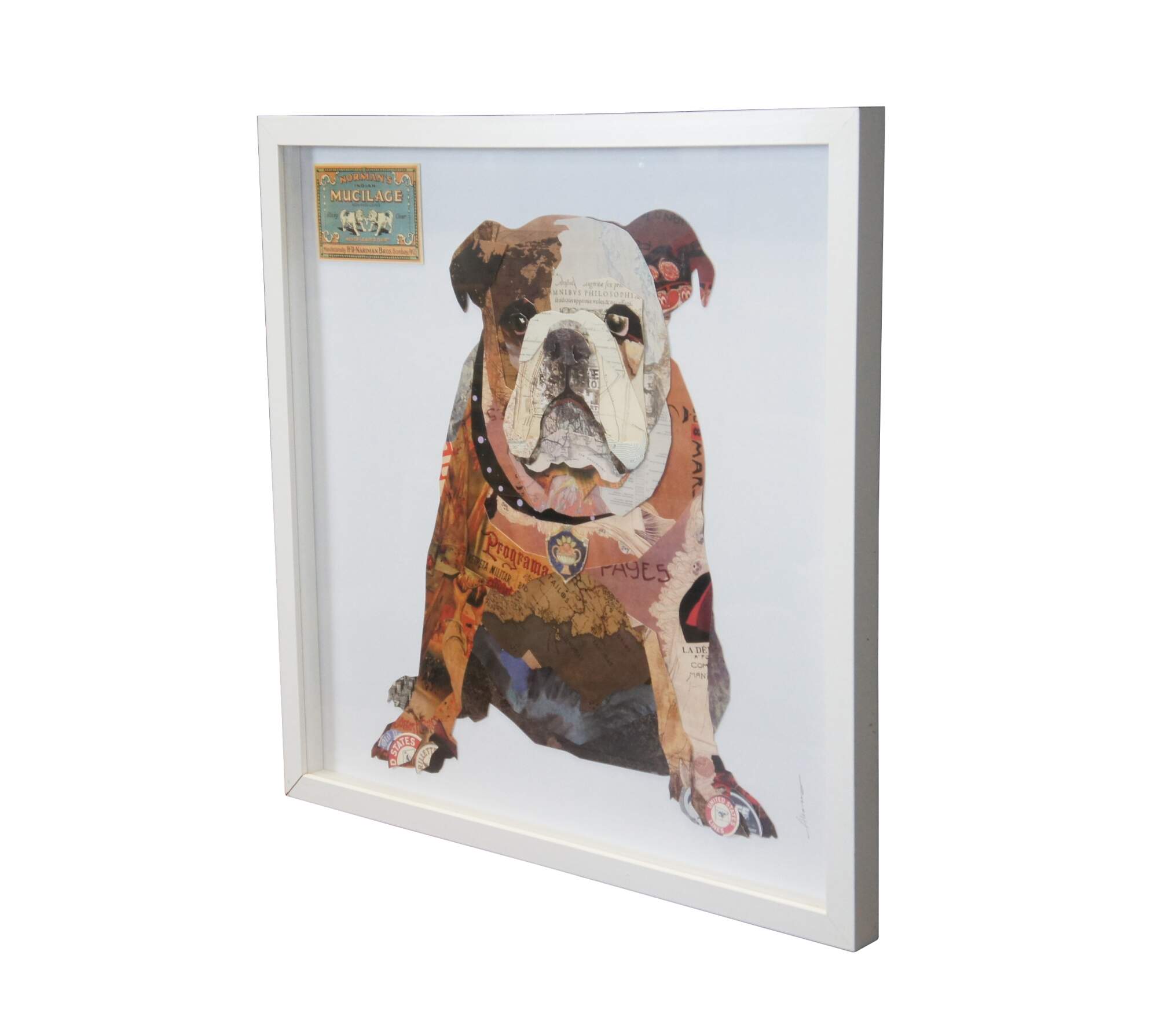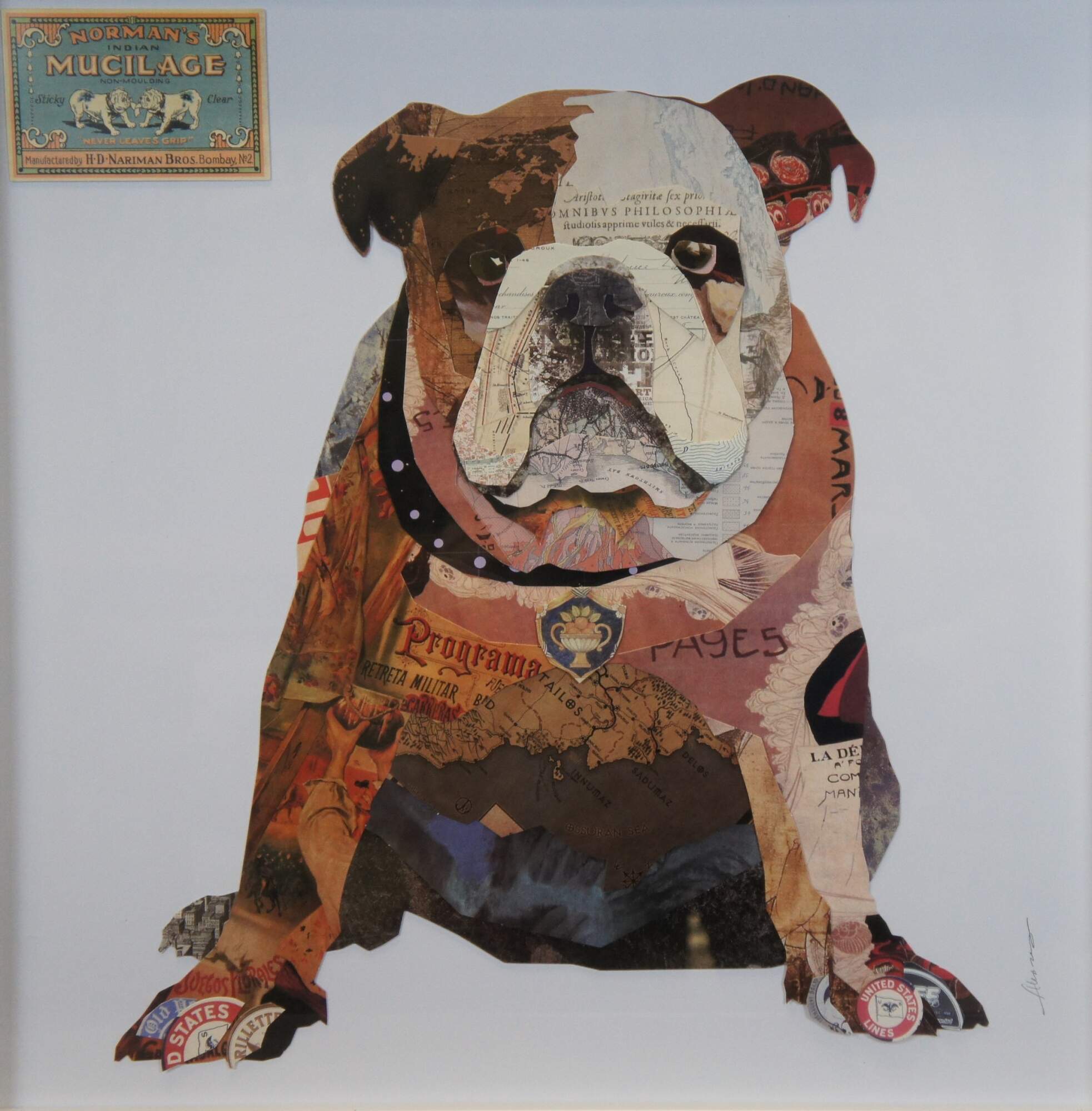 Late 20th century three dimensional / layered cut paper / topographical map / ephemera collage depicting a seated English Bulldog wearing a collar. Norman's Mucilage advert in upper left. Signed in lower right. White painted wood frame.