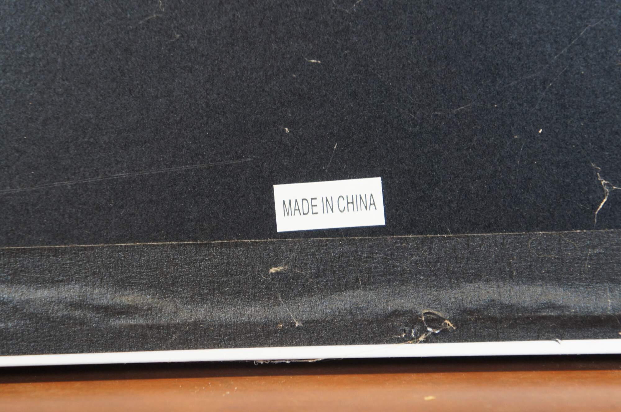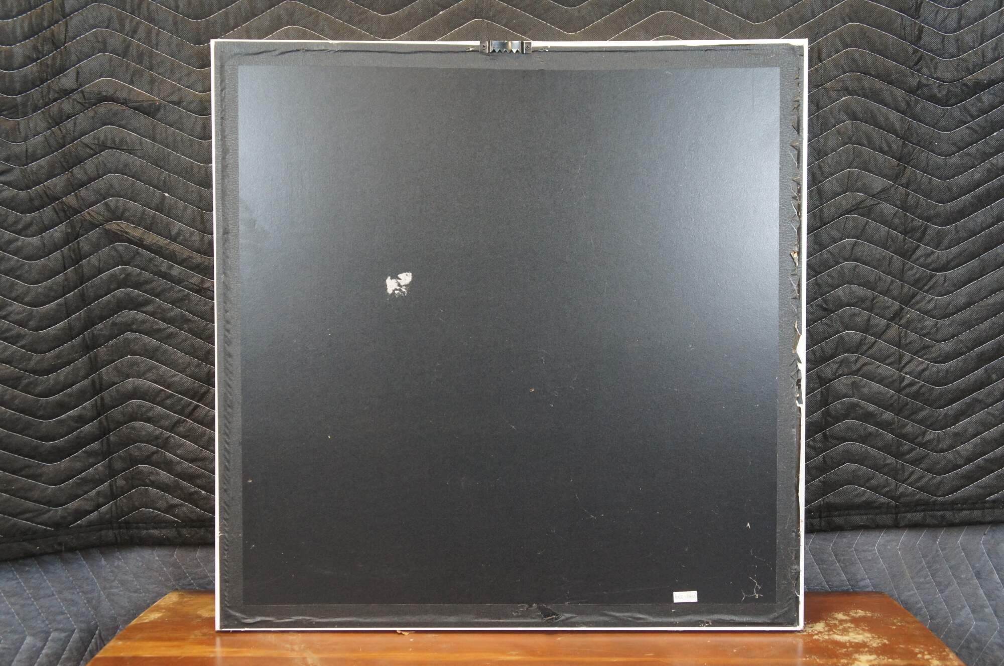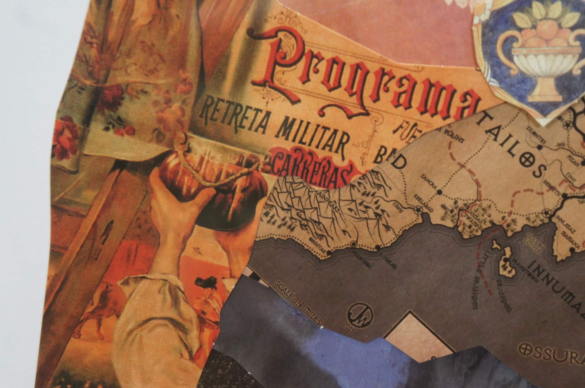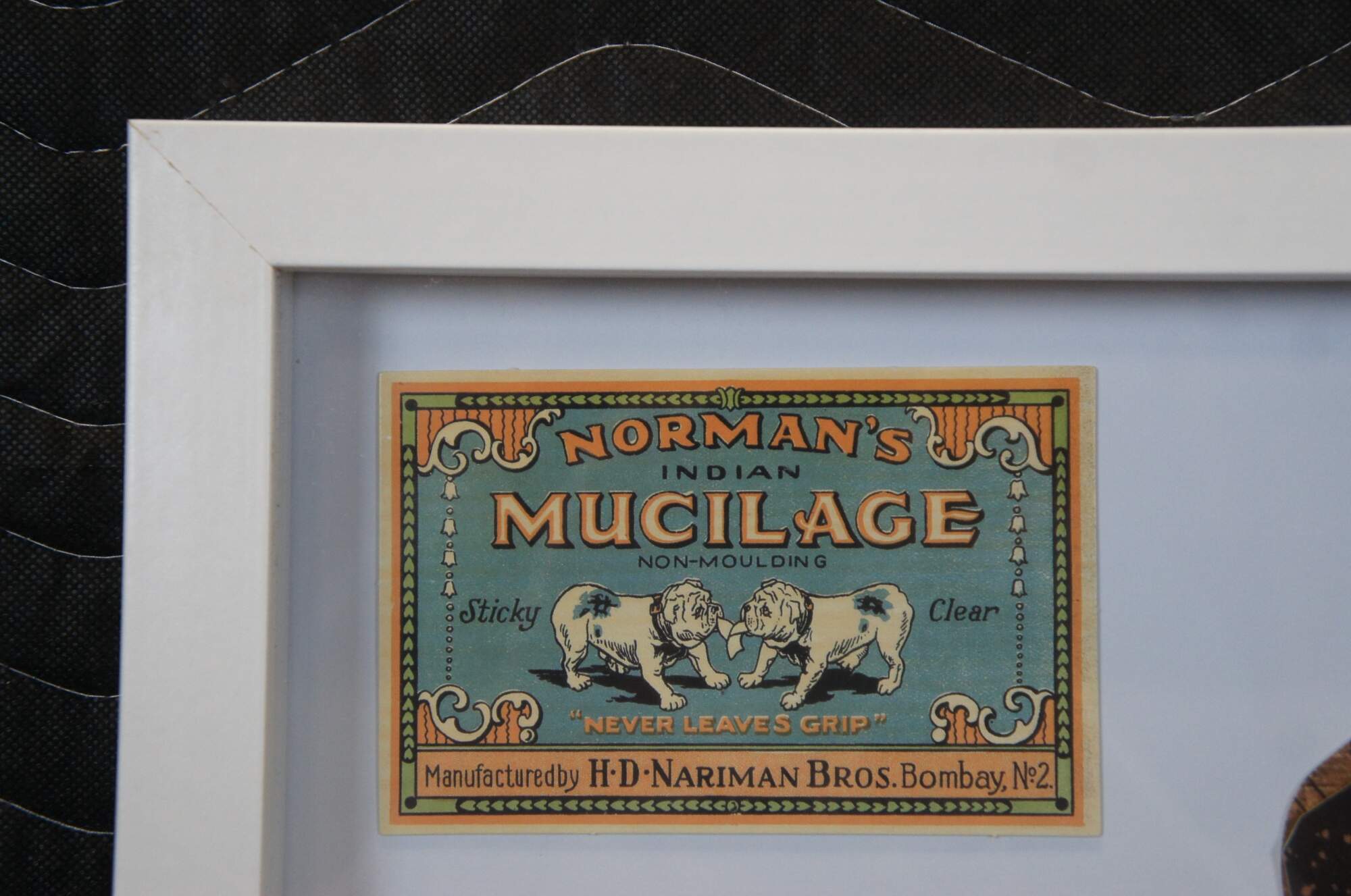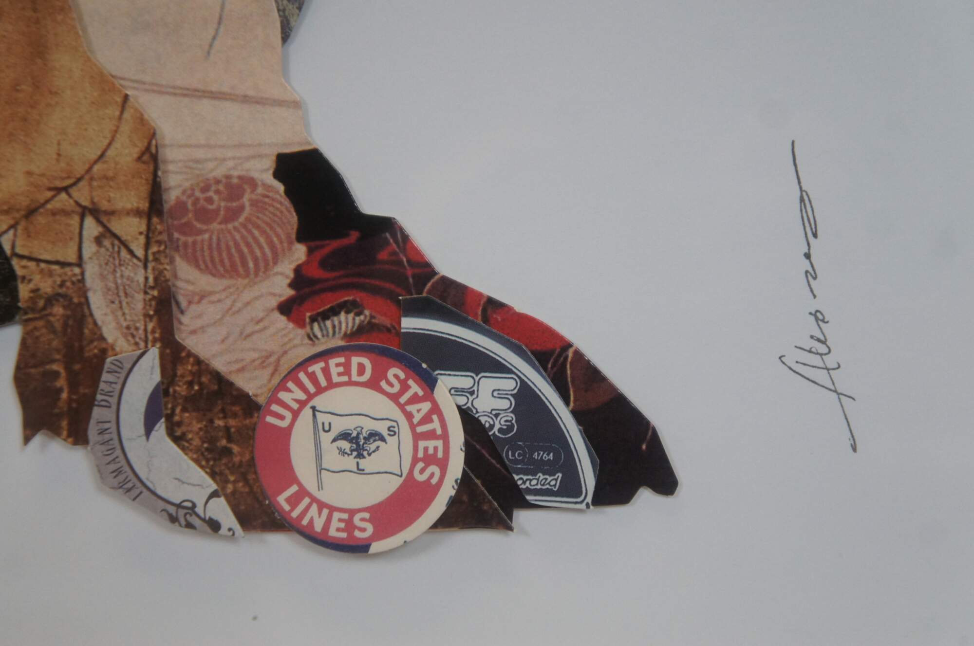 Late 20th century three dimensional / layered cut paper / topographical map / ephemera collage depicting a seated English Bulldog wearing a collar. Norman's Mucilage advert in upper left. Signed in lower right. White painted wood frame.