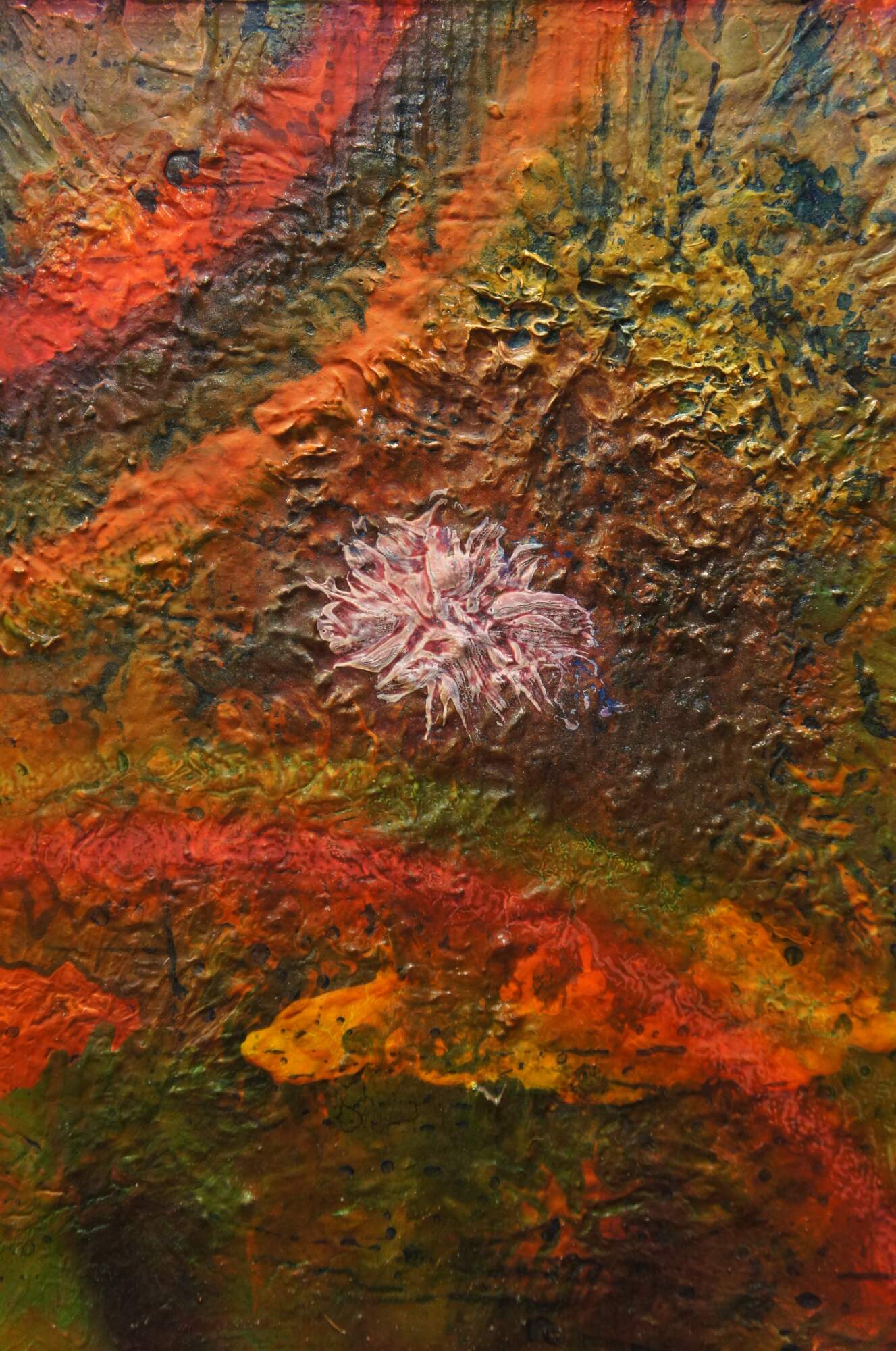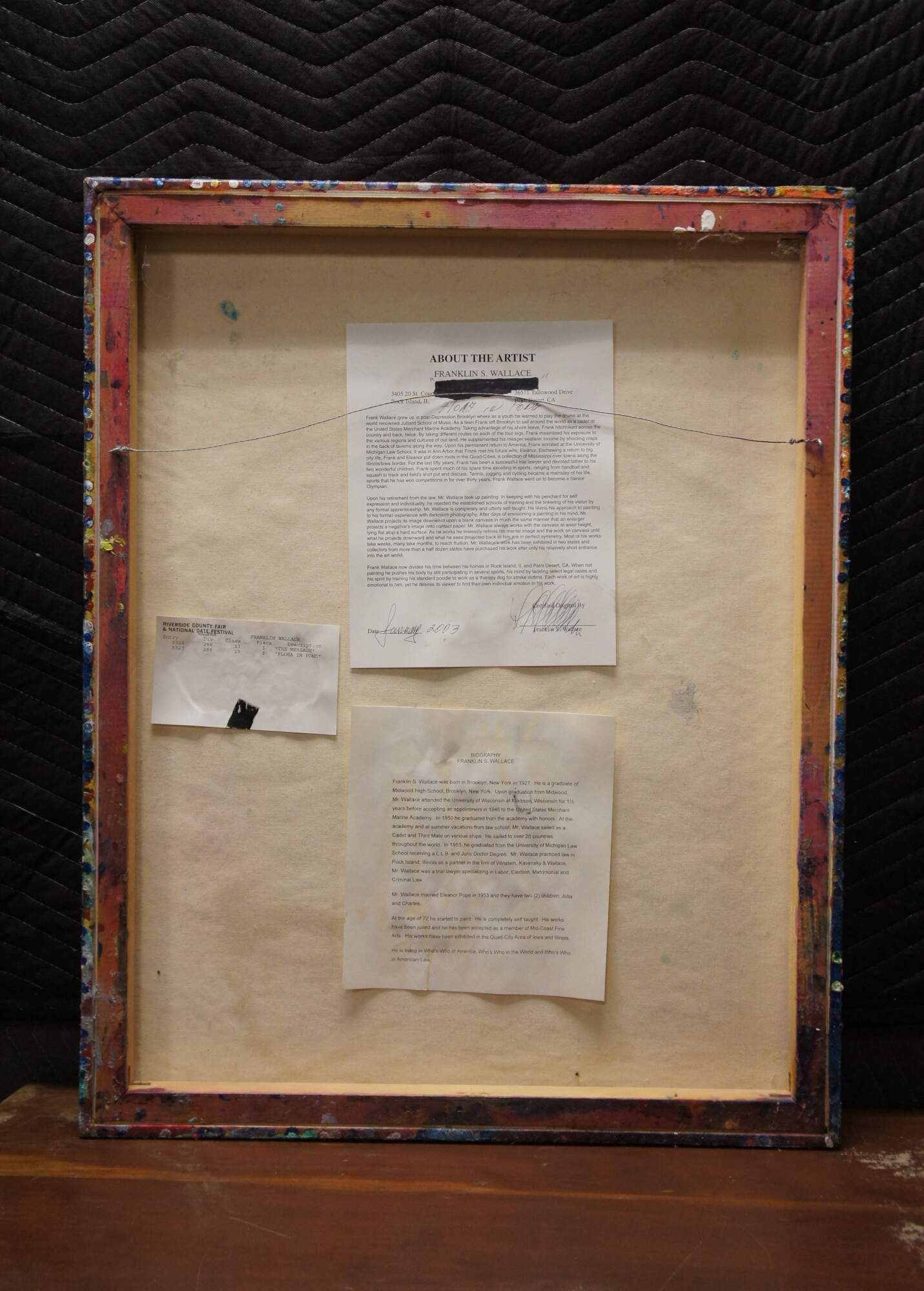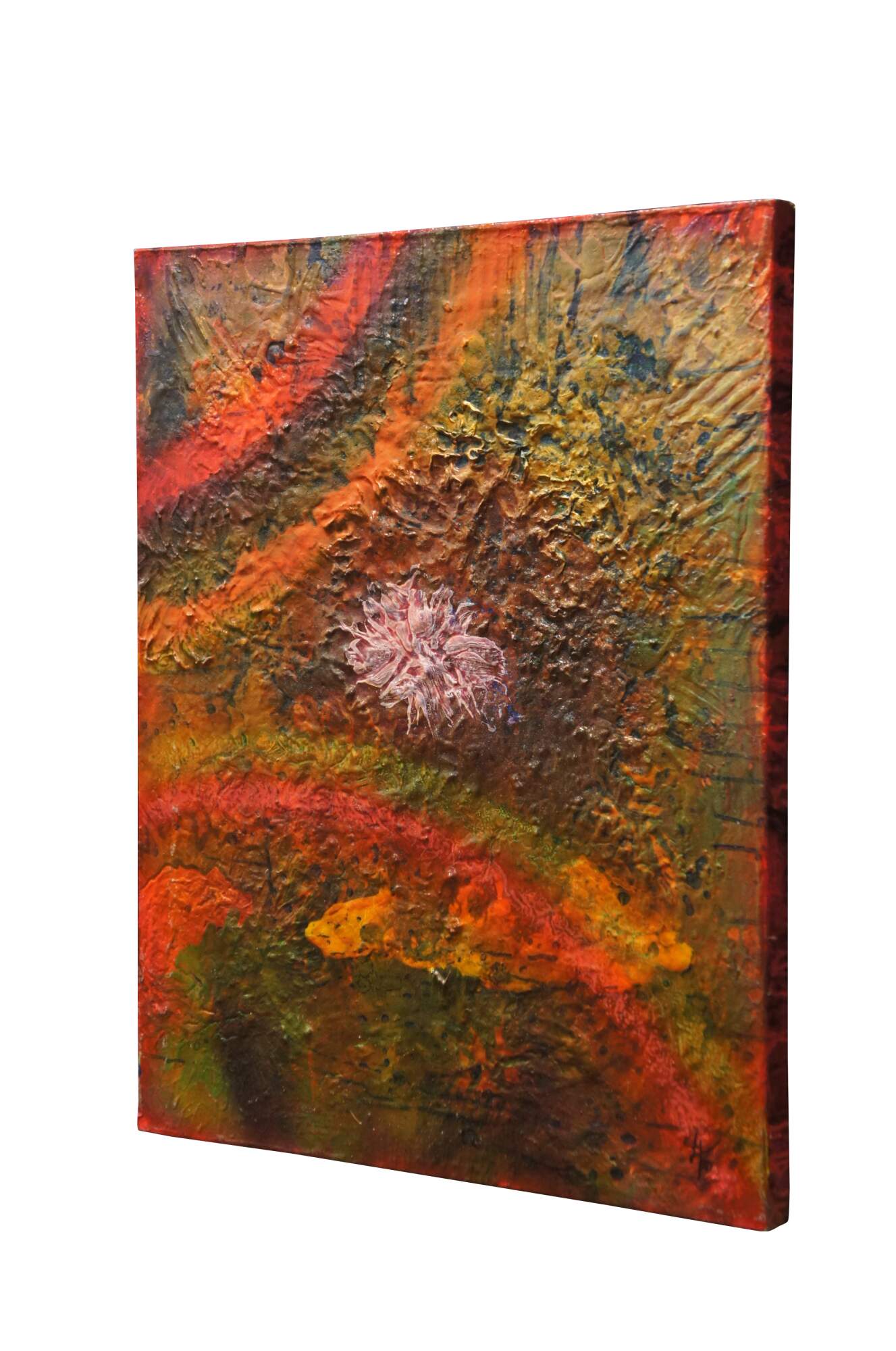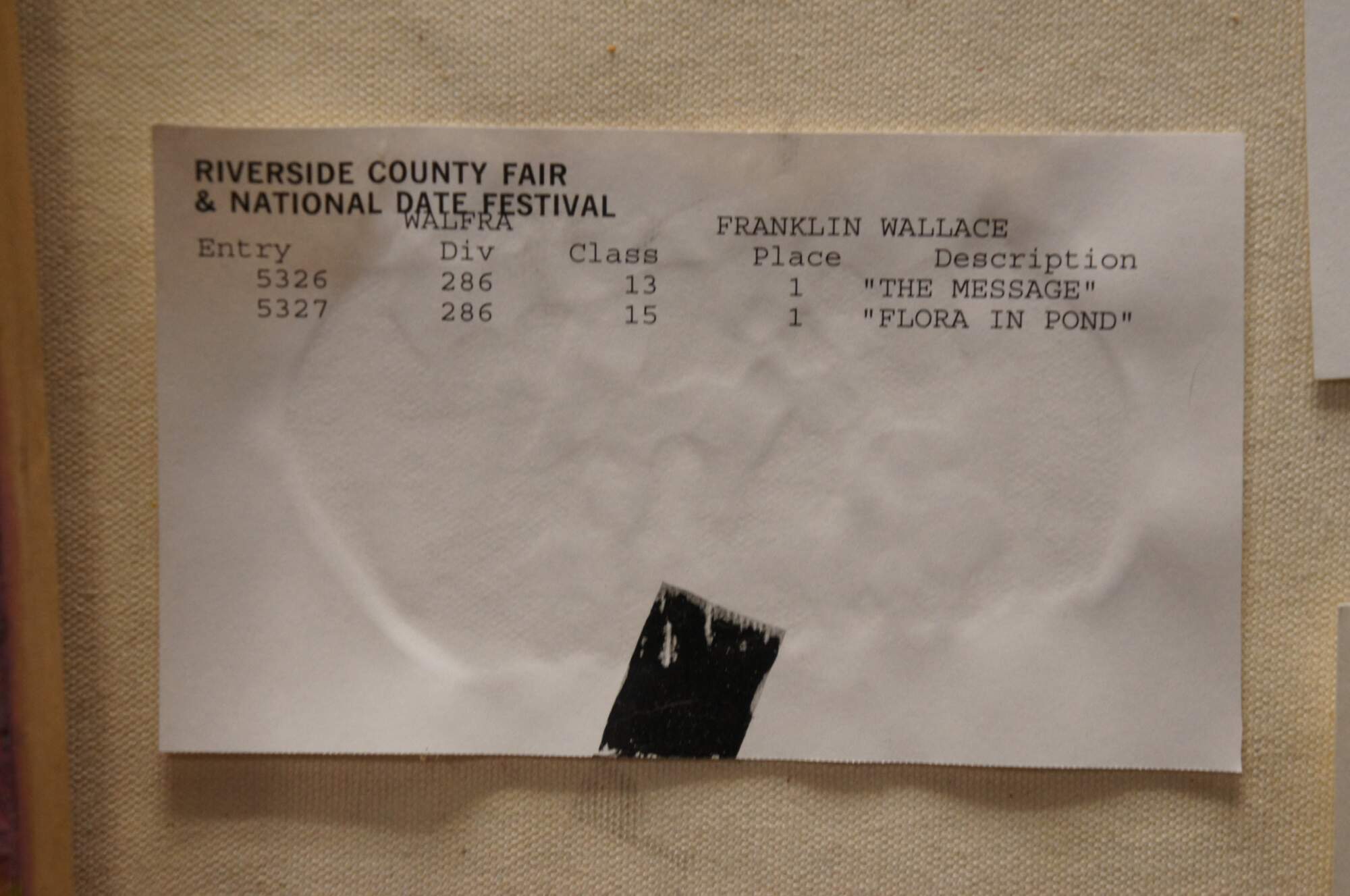 Late 20th century abstract oil on canvas painting titled "Flora in Pond" by Franklin S. Wallace. Depicts a light pink blossom drifting in a vibrant green, pink, and brown water, accented with streaks of glitter. Unframed. Includes Artist's Biography and entry tag from Riverside County Fair and National Date Festival.