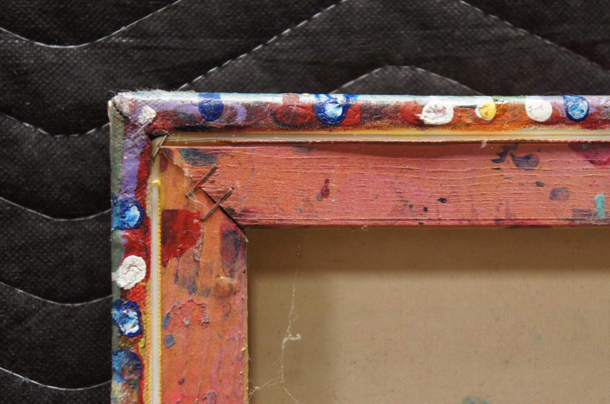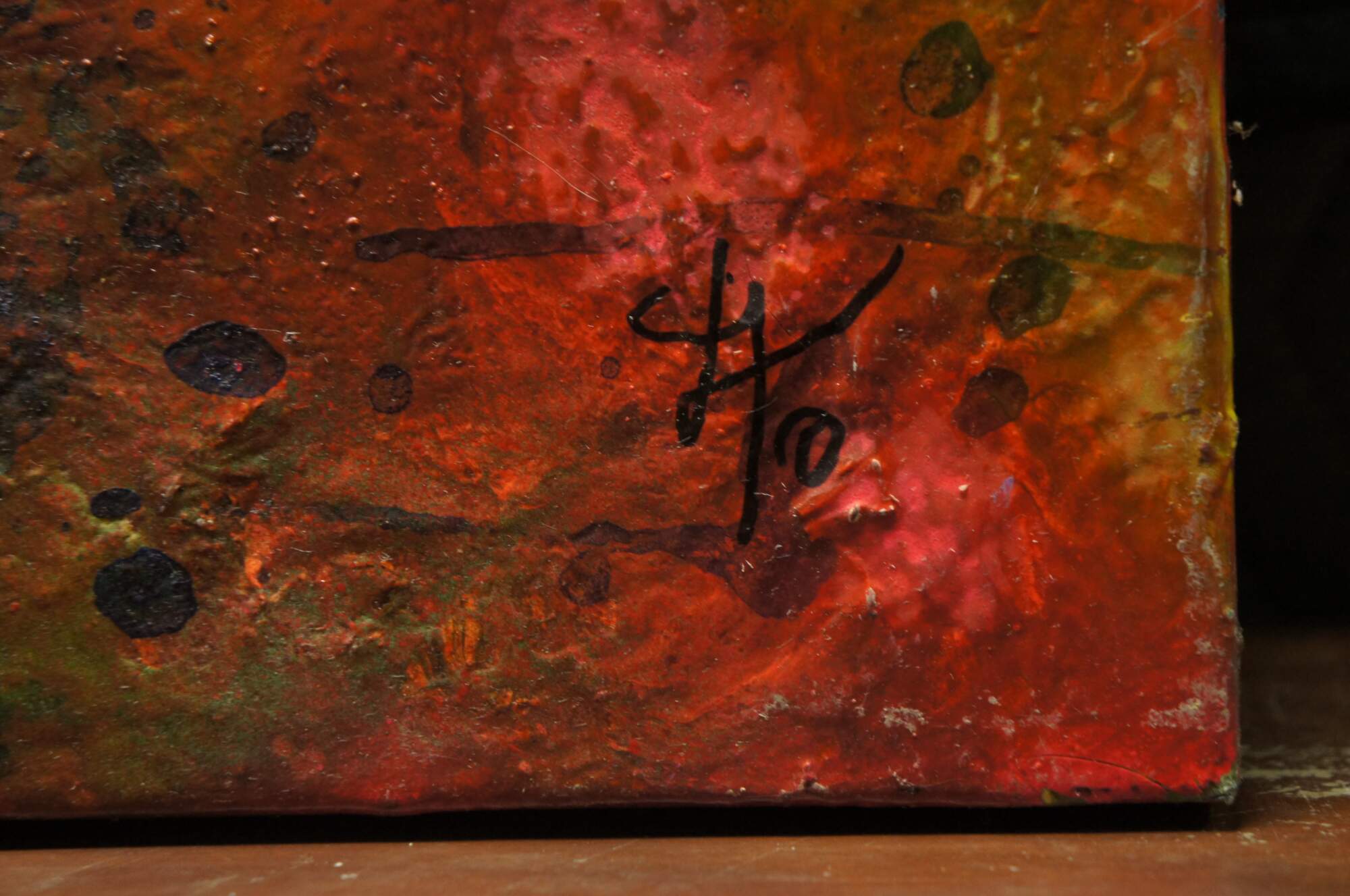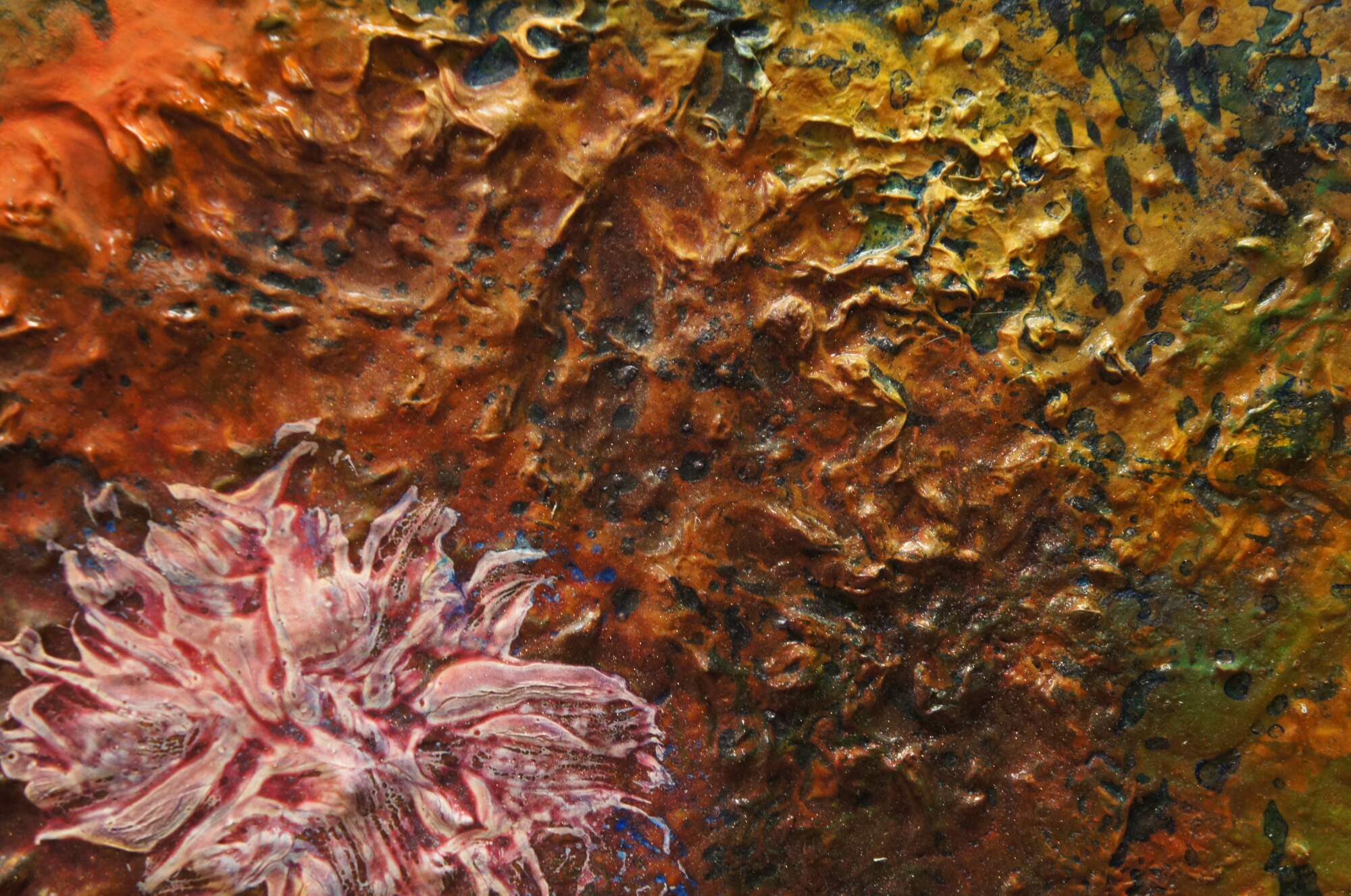 Late 20th century abstract oil on canvas painting titled "Flora in Pond" by Franklin S. Wallace. Depicts a light pink blossom drifting in a vibrant green, pink, and brown water, accented with streaks of glitter. Unframed. Includes Artist's Biography and entry tag from Riverside County Fair and National Date Festival.