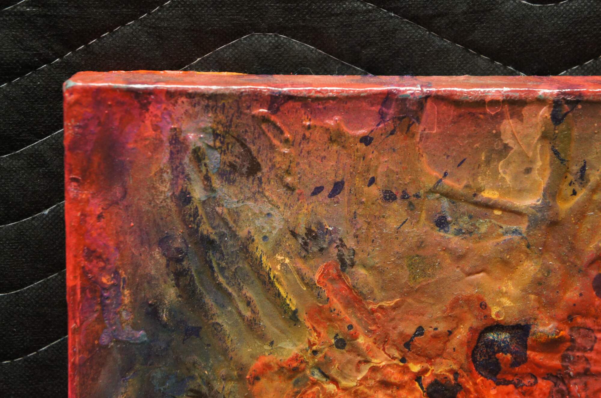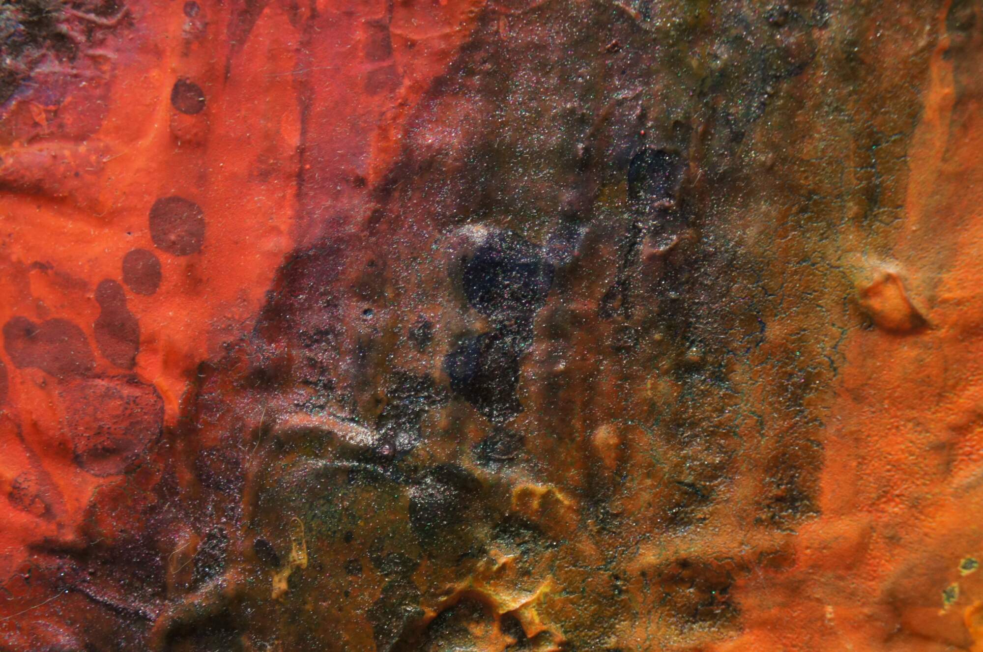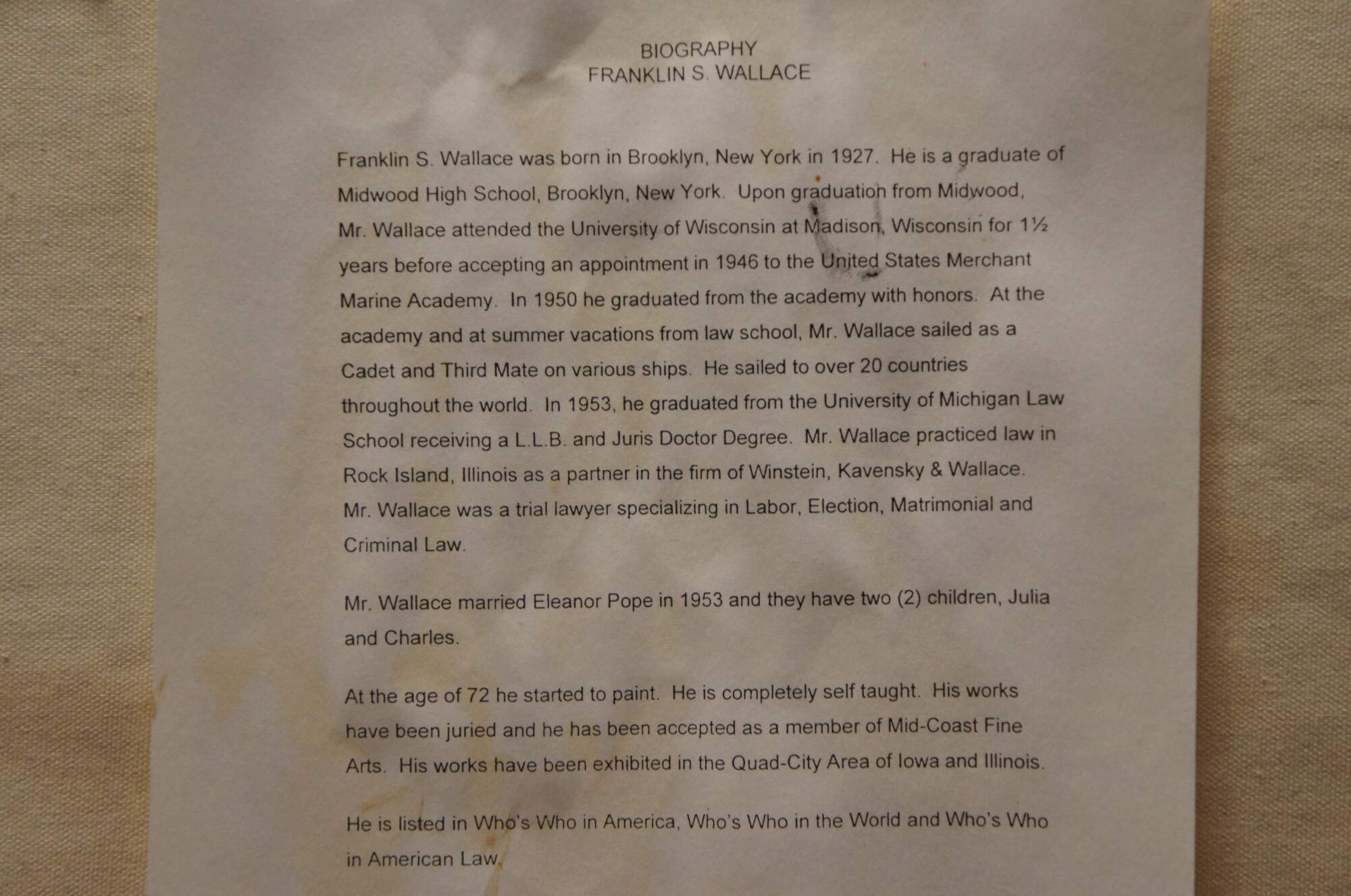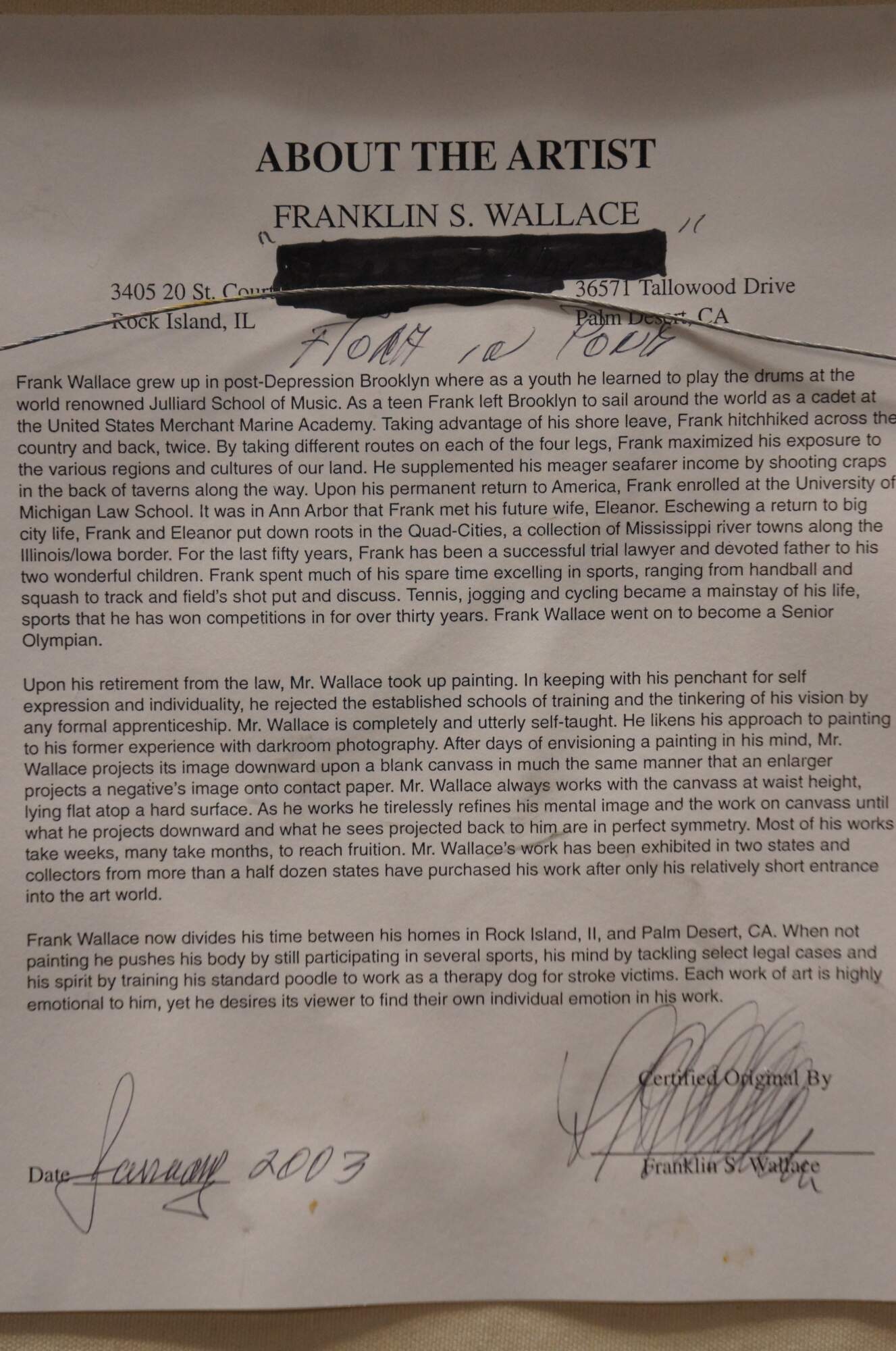 Late 20th century abstract oil on canvas painting titled "Flora in Pond" by Franklin S. Wallace. Depicts a light pink blossom drifting in a vibrant green, pink, and brown water, accented with streaks of glitter. Unframed. Includes Artist's Biography and entry tag from Riverside County Fair and National Date Festival.