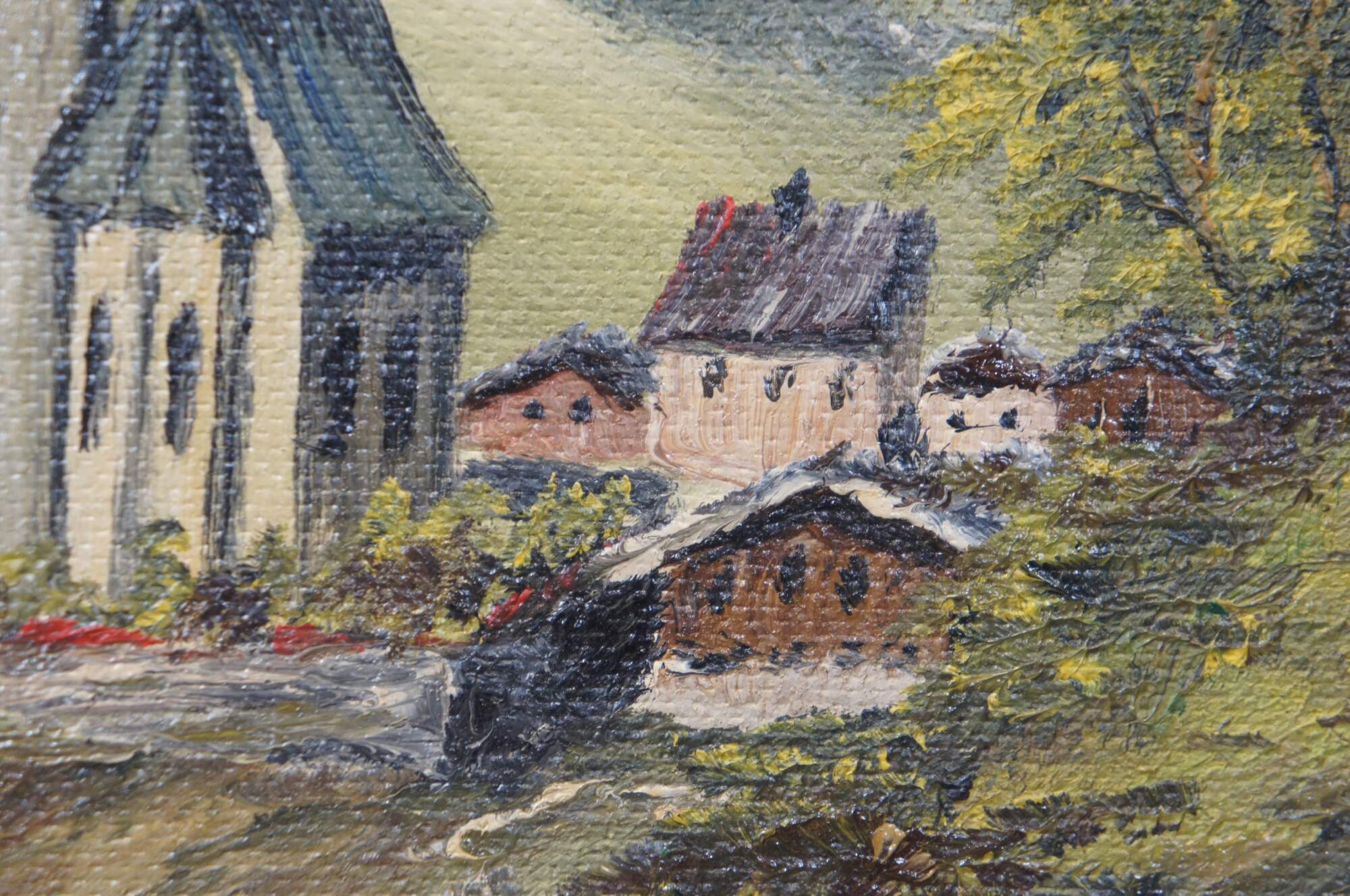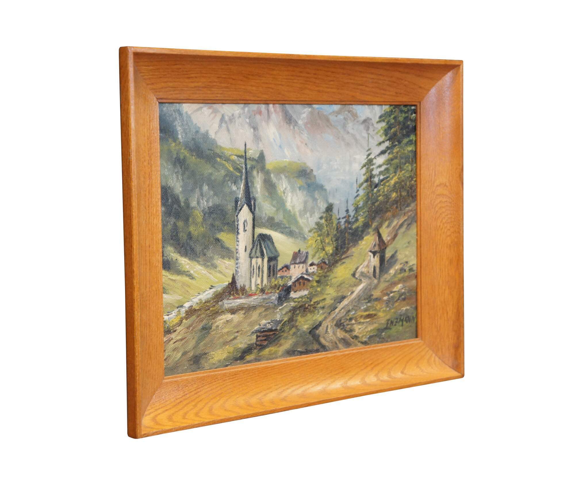 Early to mid 20th century oil on board landscape painting depicting a church steeple in a little Alpine mountain village. Signed Enzmann in lower right. Beveled wood frame.