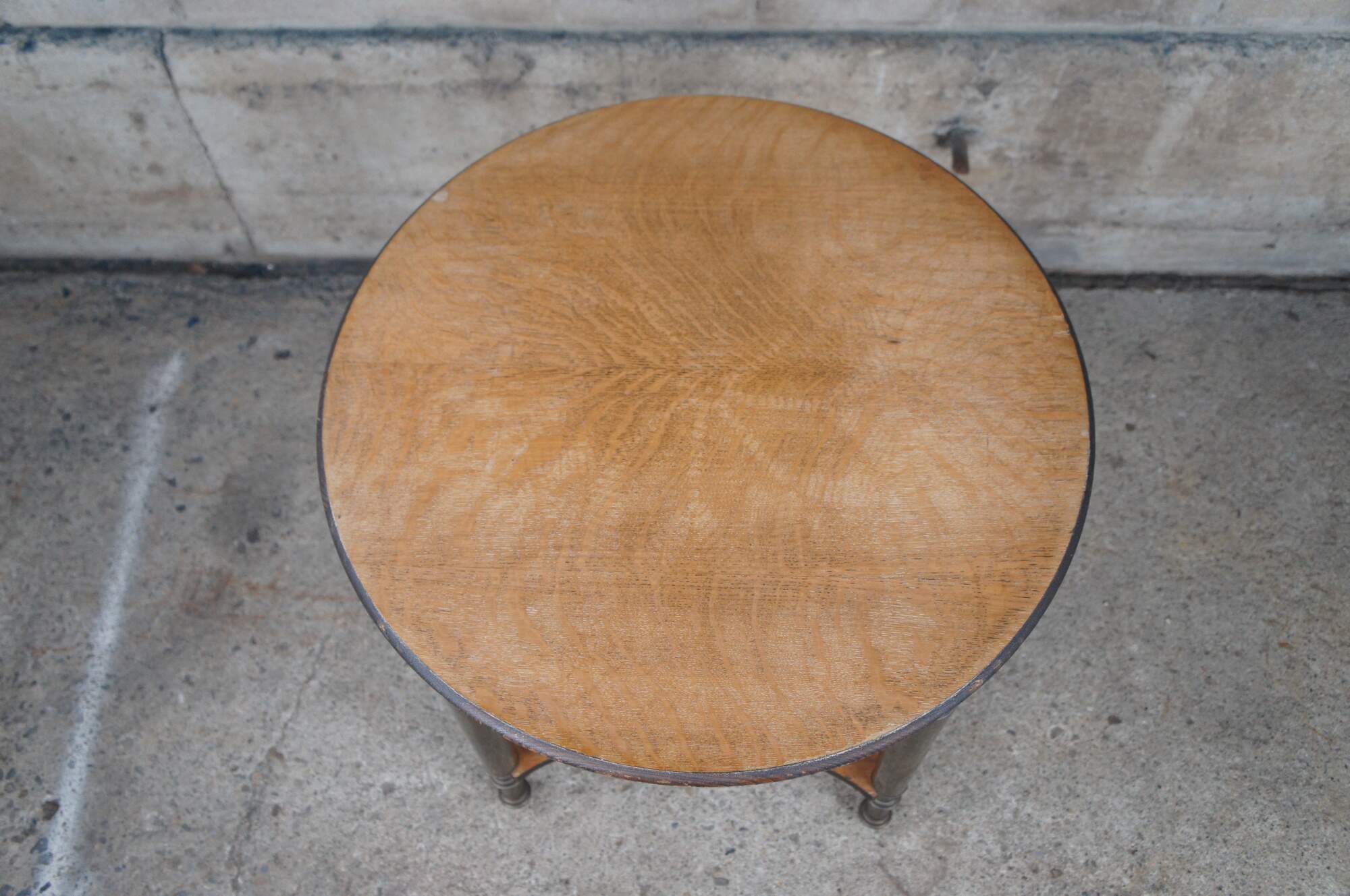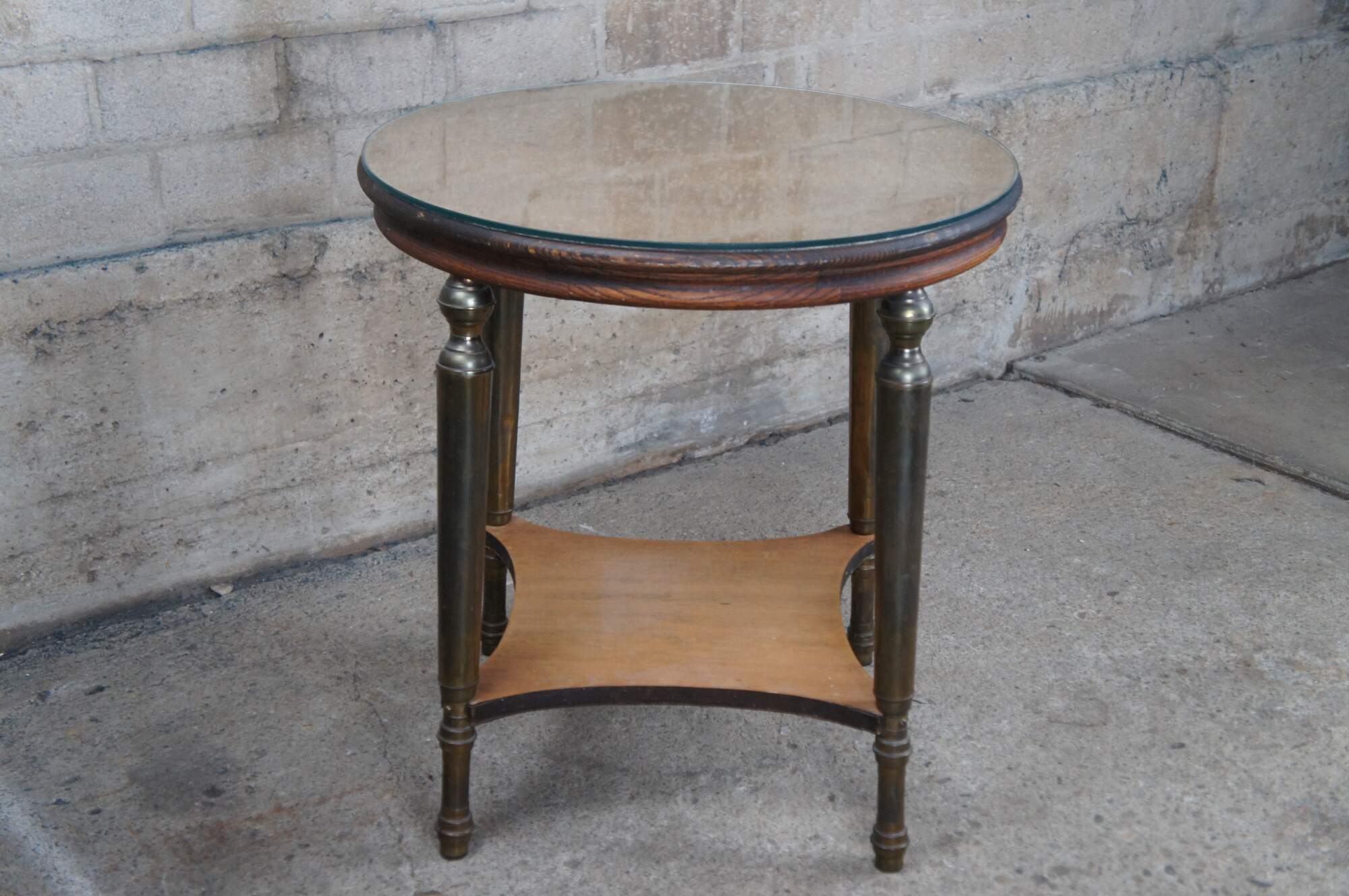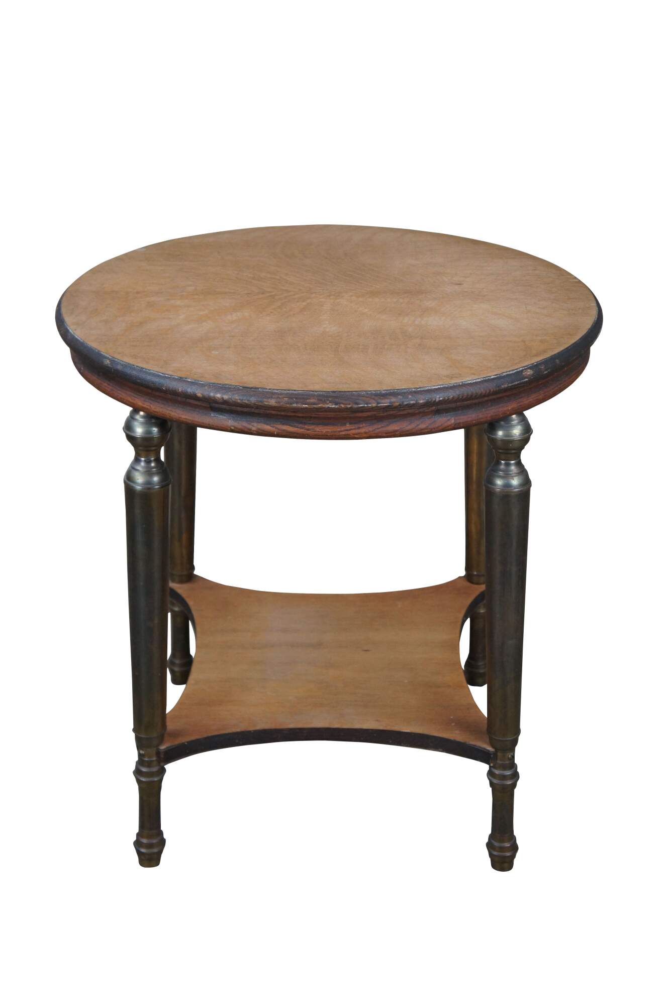 Mid Century French inspired round two tier side table. Made from oak with brass tapered posts.