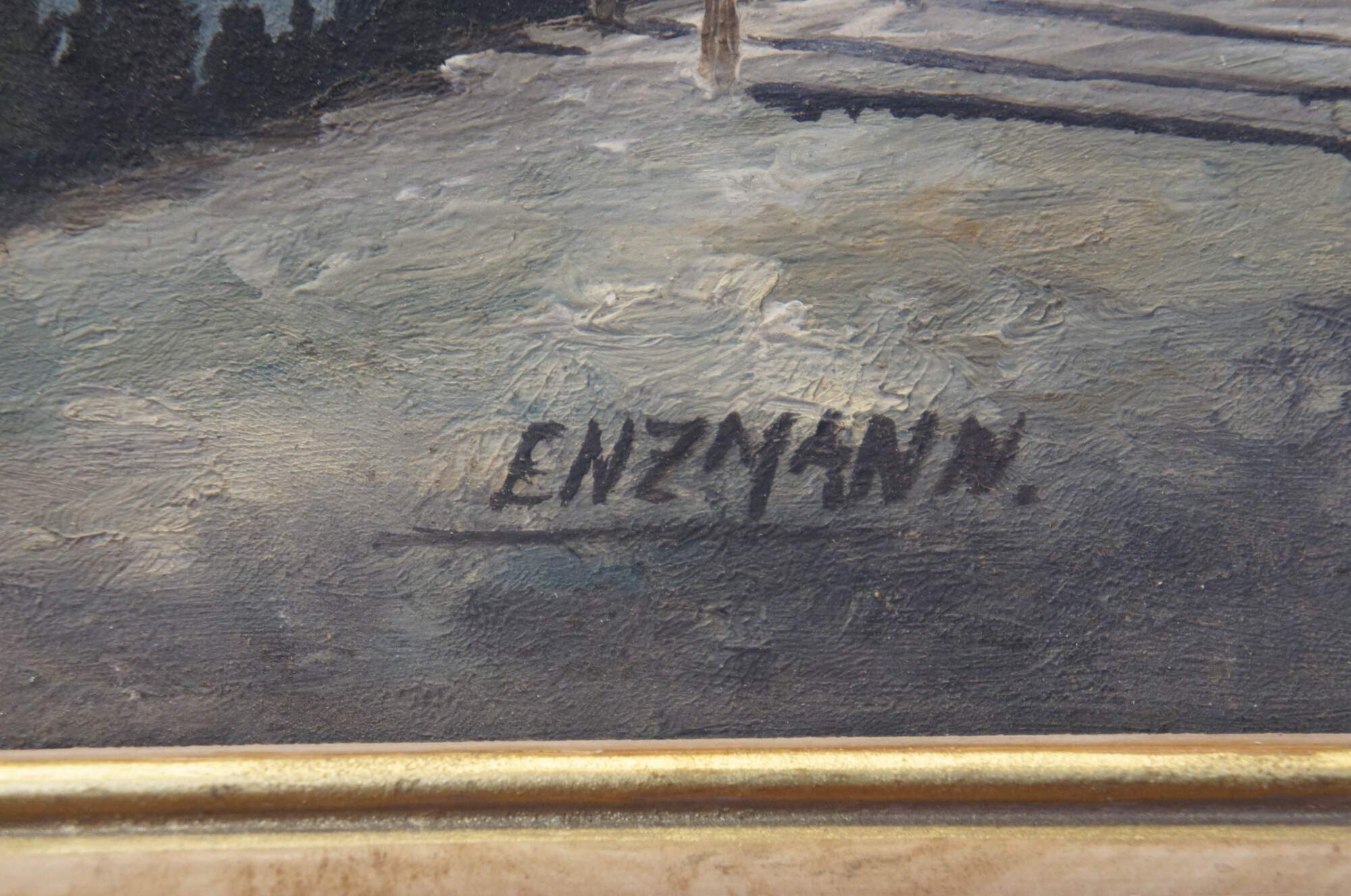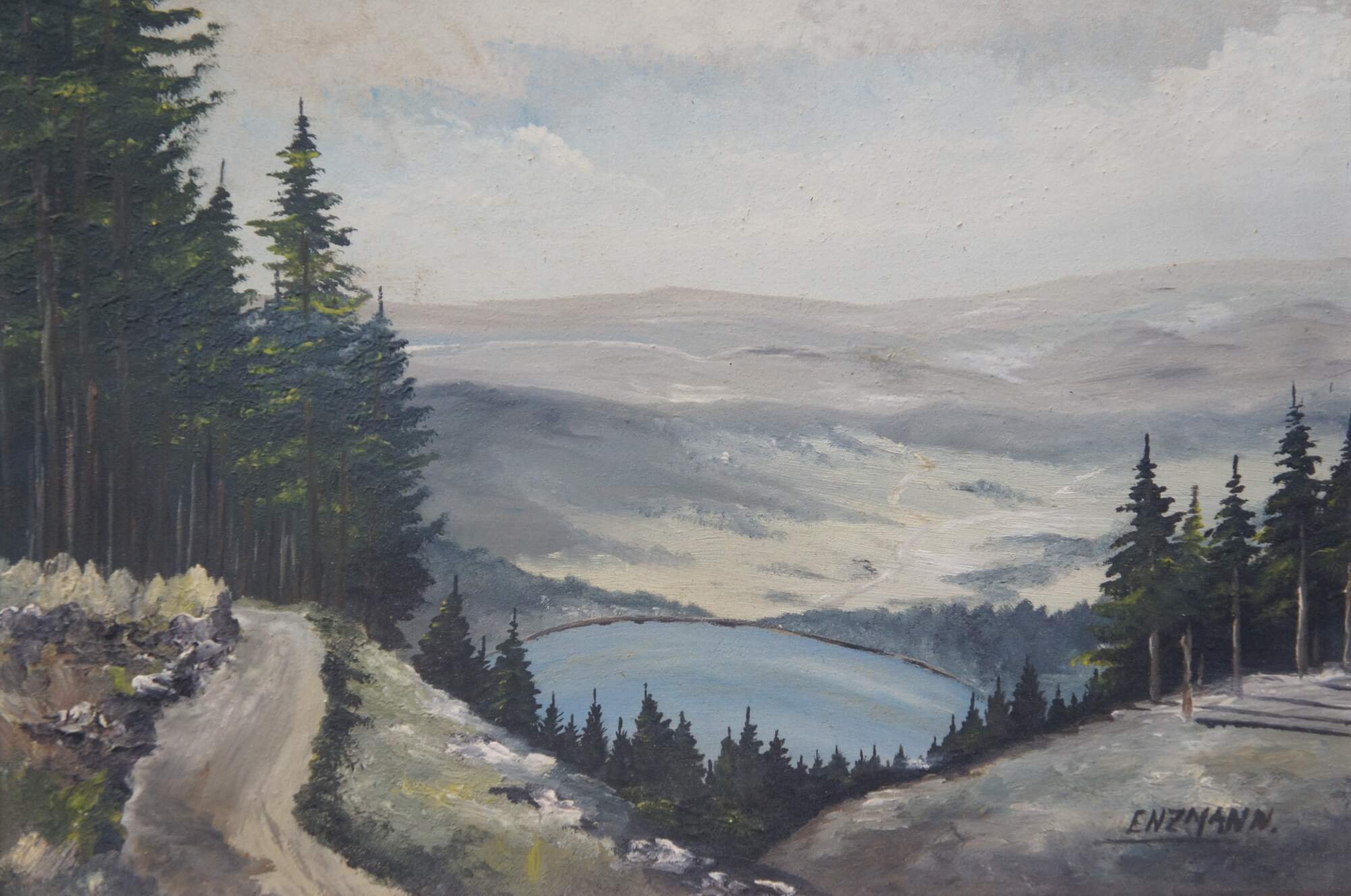 "Eduard Josef Enzmann (born 1 August 1882 in Faberhütten near Kaaden, Bohemia; � 18 May 1965 in Giessen) was a German landscape painter. Enzmann was born in the then Wernsdorf district of Faberhütten near Kaaden. His parents were the miller Wenzel Franz Enzmann and Theresia née Pleil from Köstelwald near Kaaden. He completed an apprenticeship as a porcelain painter in Reichenberg. During his work as a porcelain painter, he was artistically supported by the sculptor Adolf Schnabel (1874–1950). With the help of a scholarship, he began studying at the Academy of Fine Arts in Prague in 1908. Many of his landscape paintings, drawings and graphics have been used in books and magazines. For example, in 1916 Eduard Gnendinger published the book Der Dammbruch der Talsperre an der Weiße Desse (The Dam Break of the Dam on the White Desse on 18 September 1916) in Dessendorf, in which several of Enzmann's nature studies are shown. Enzmann also designed the cover of the book In der Sahara / Gustav Nachtigal, published by Adolf Wildner in 1922. [5] Karl Richard Fischer also used Doctor Kittel for his book, which was first published in 1924. Legends and other folk heritage of the Jizera Mountains: drawings by Enzmann. Enzmann also worked in the field of lithography. In 1924–1927 he designed the interiors of the building of the former district government in Jablonec (Podhorská 59), including the so-called Jizera Triptych." (Source: Wikipedia)