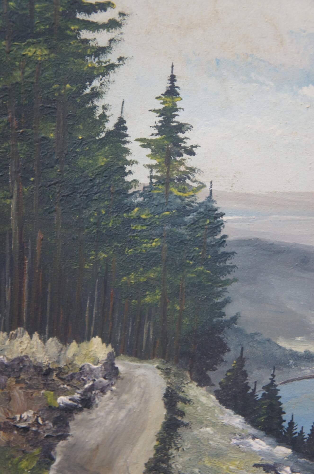 Early to mid 20th century oil on board landscape painting depicting an Apline mountain lake viewed from a pine covered hilltop. Signed Enzmann in lower right - attributed to Eduard Enzmann. Beveled painted wood frame with gold edge.