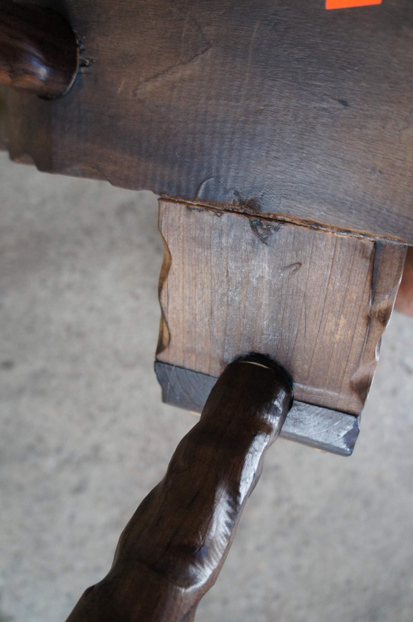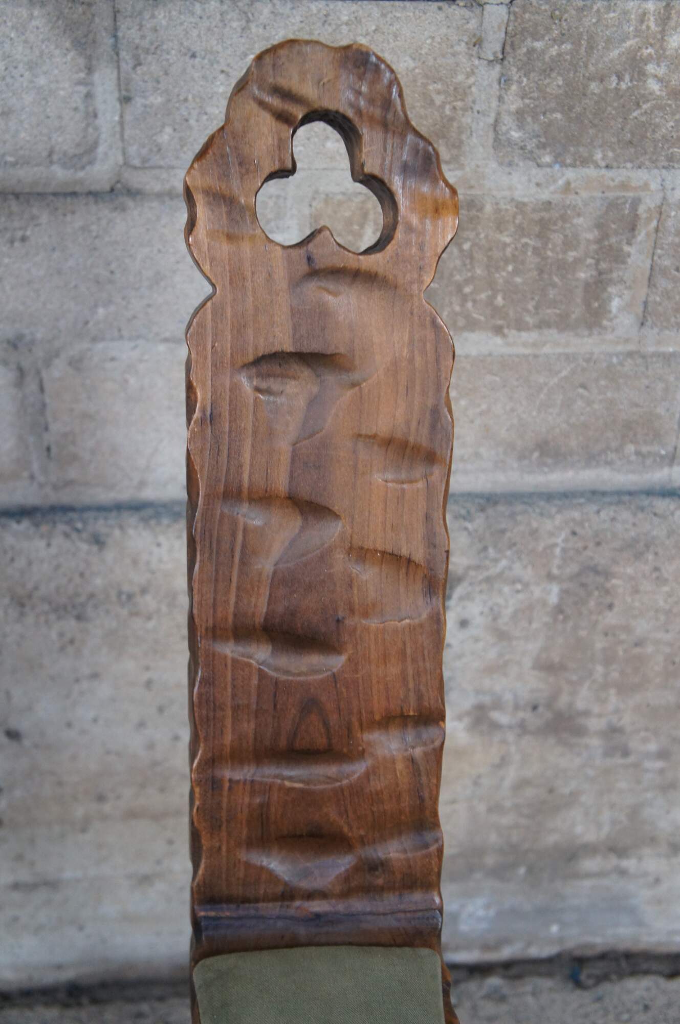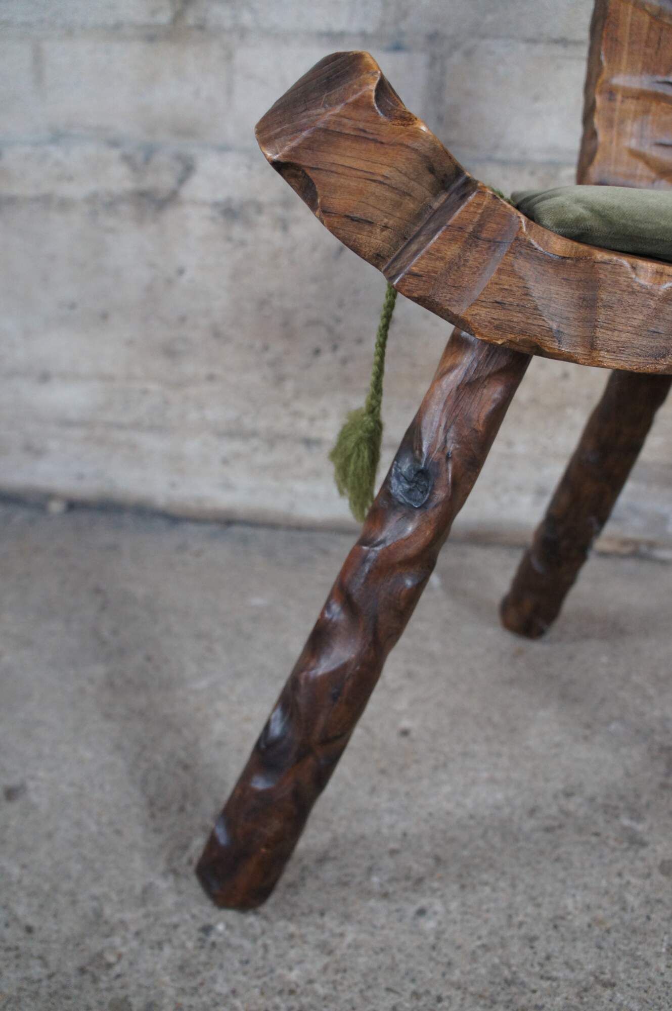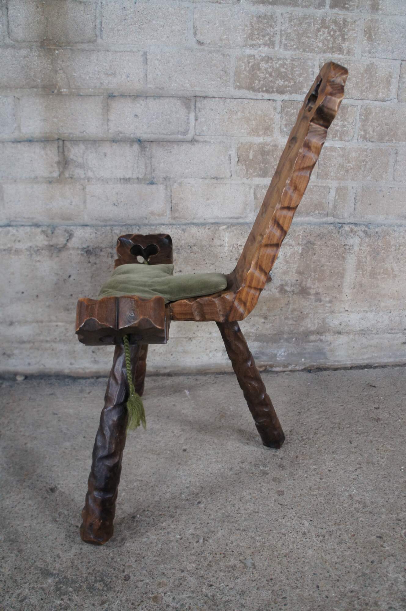 Mid century circa 1950s Spanish birthing stool or chair. Made of walnut featuring carved brutalist design with clover shaped cutouts, two handles / arms, and tripod base.