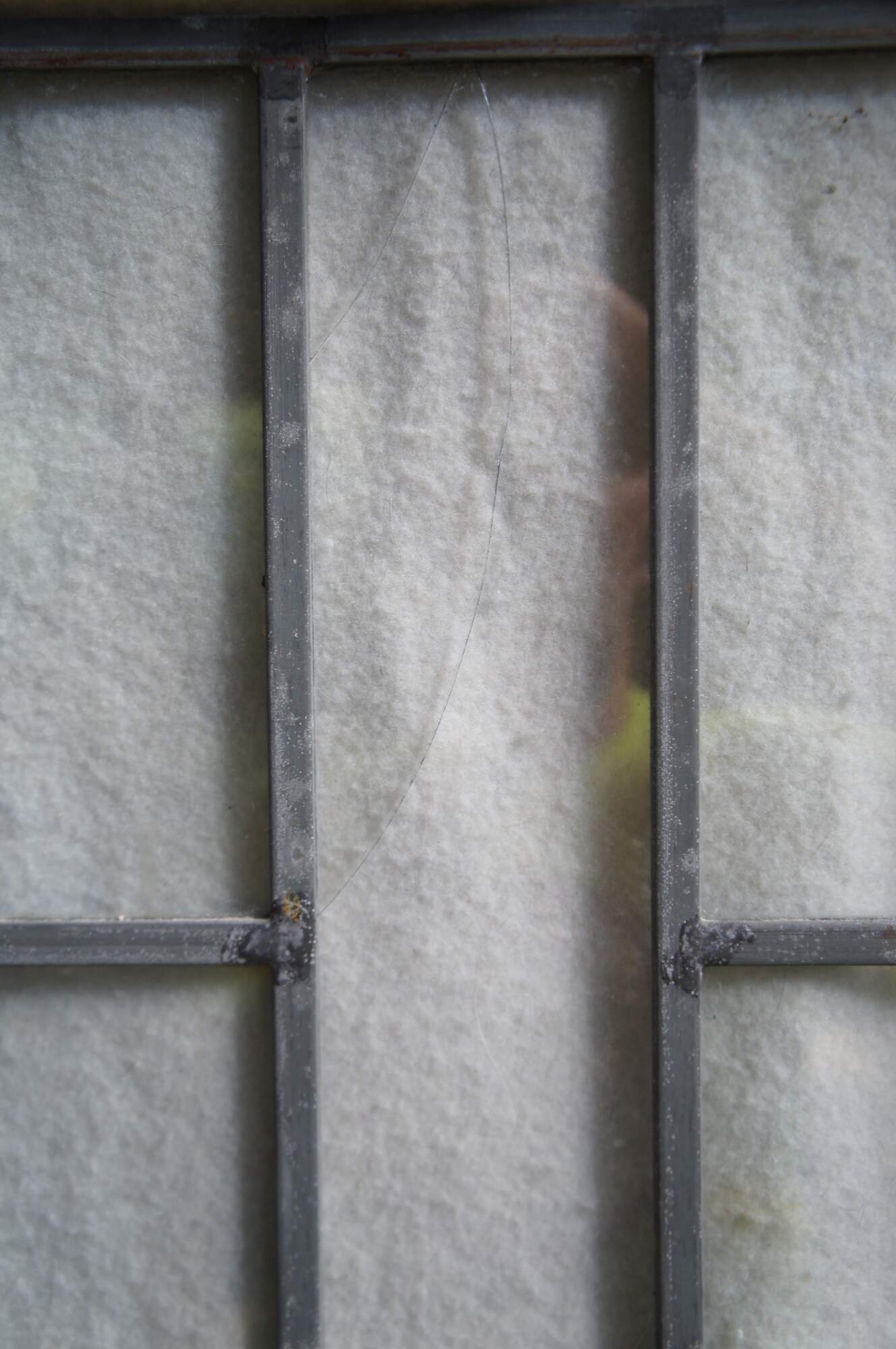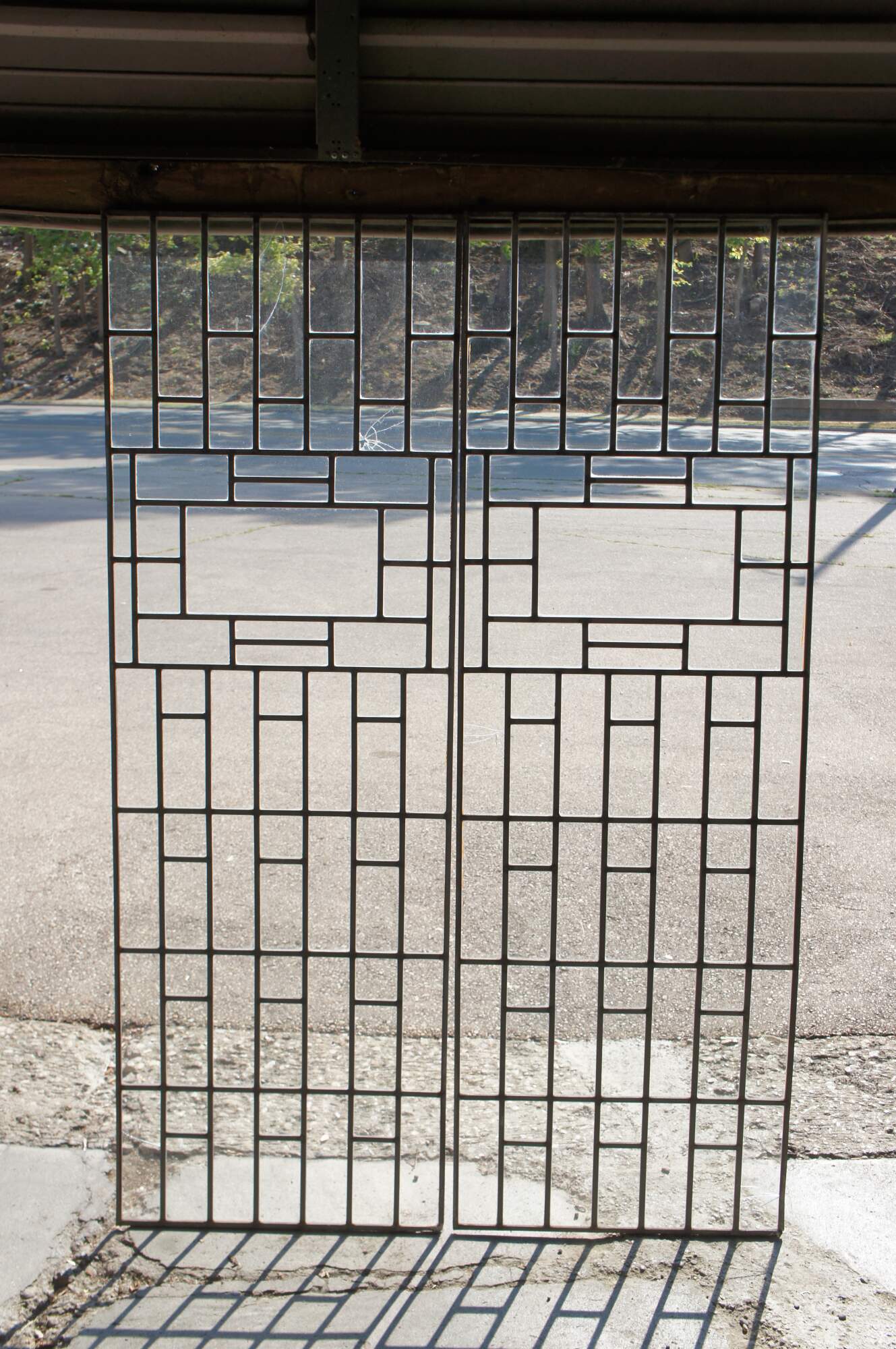 An antique pair of early 20th century leaded glass windows. Features a Frank Lloyd Wright / Prairie style design with geometric panels. Great for use in a door or as sidelites.