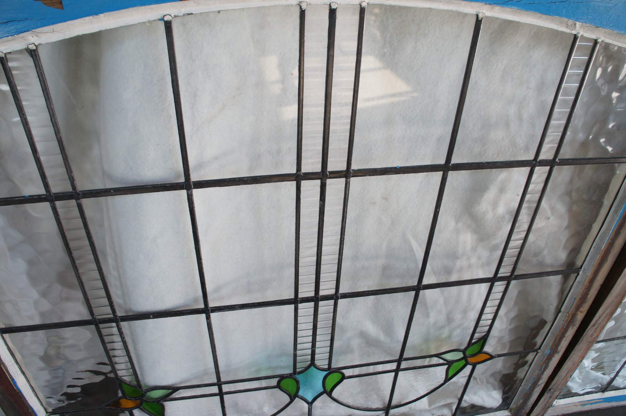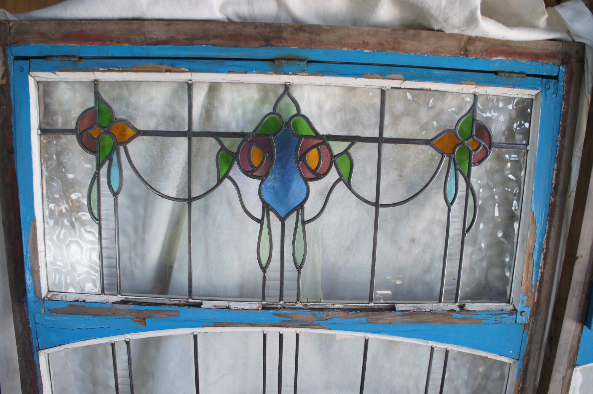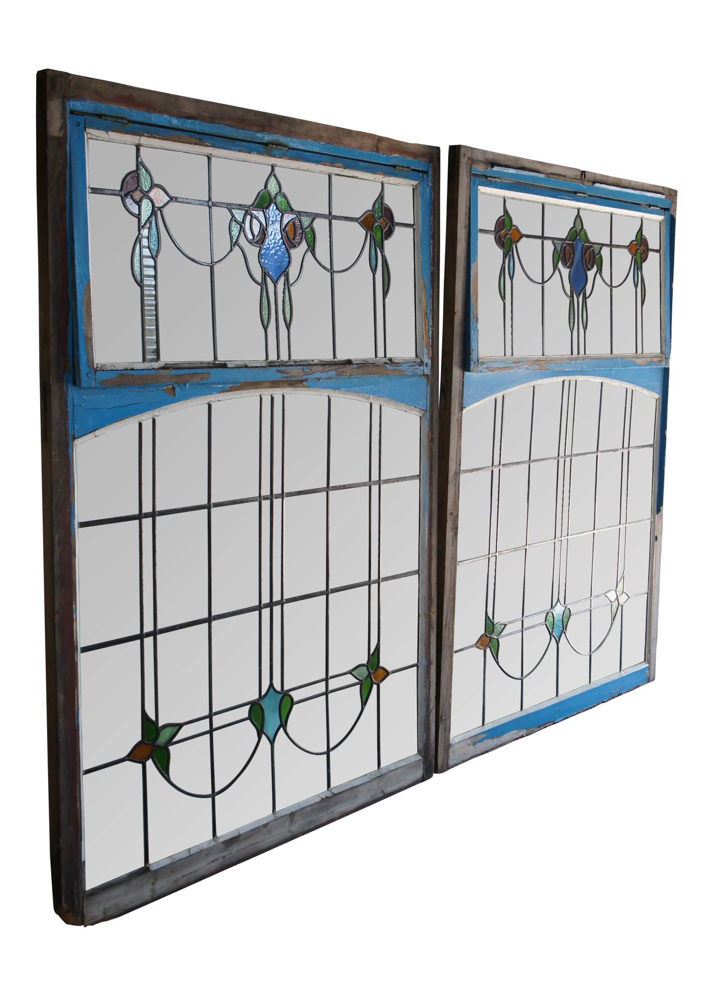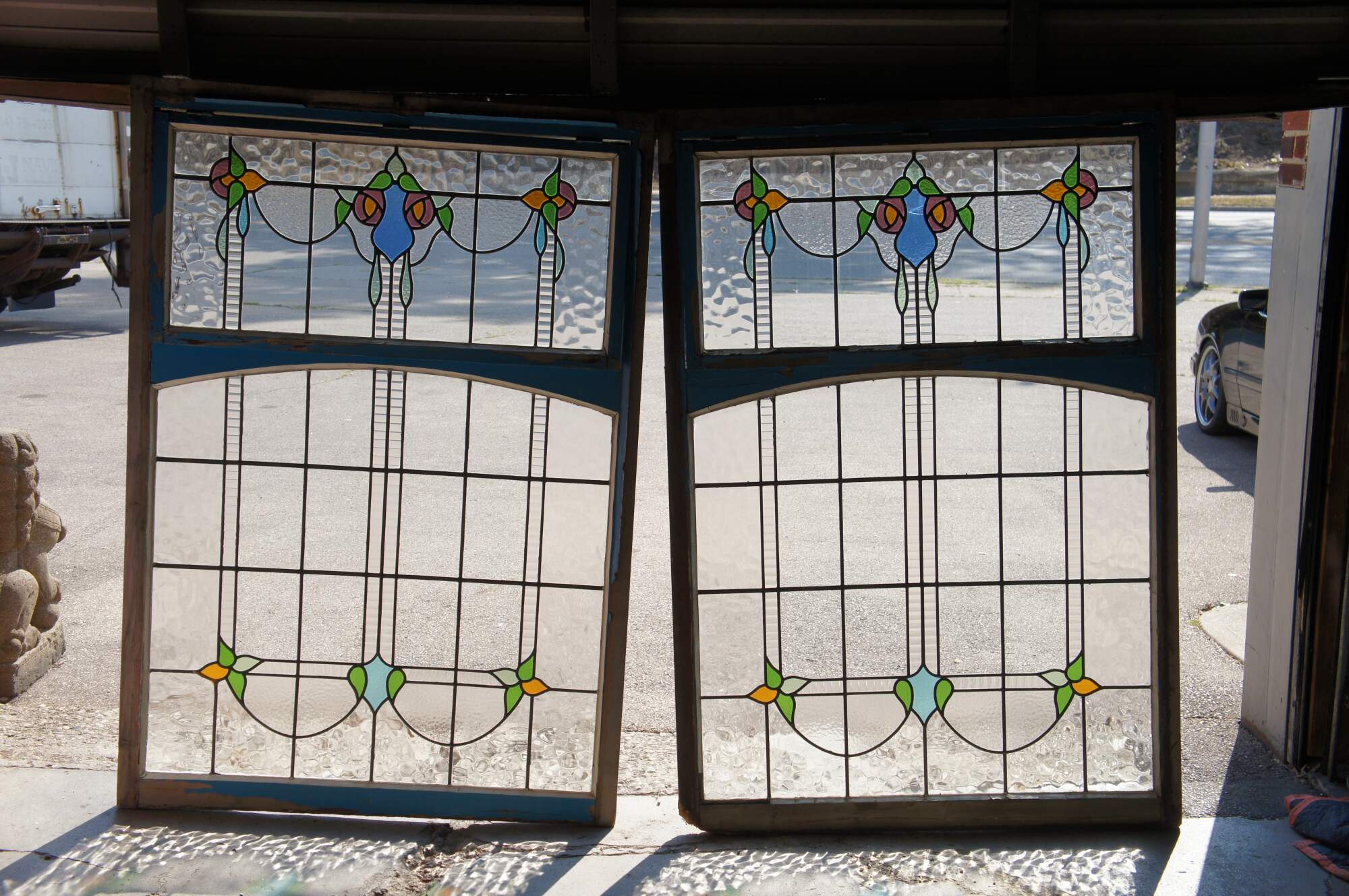 An exquisite pair of 19th century leaded stained glass windows. Features a large rectangular frame with arched area beneath a transom that opens via hinge to allow fresh air in. Each window is designed with clear, pebbled and textured glass set around ornate floral designs showcasing colors of blue, green, amber and purple. The glass is set within large original pine frames. A monumental set that will make for the perfect addition to any space.