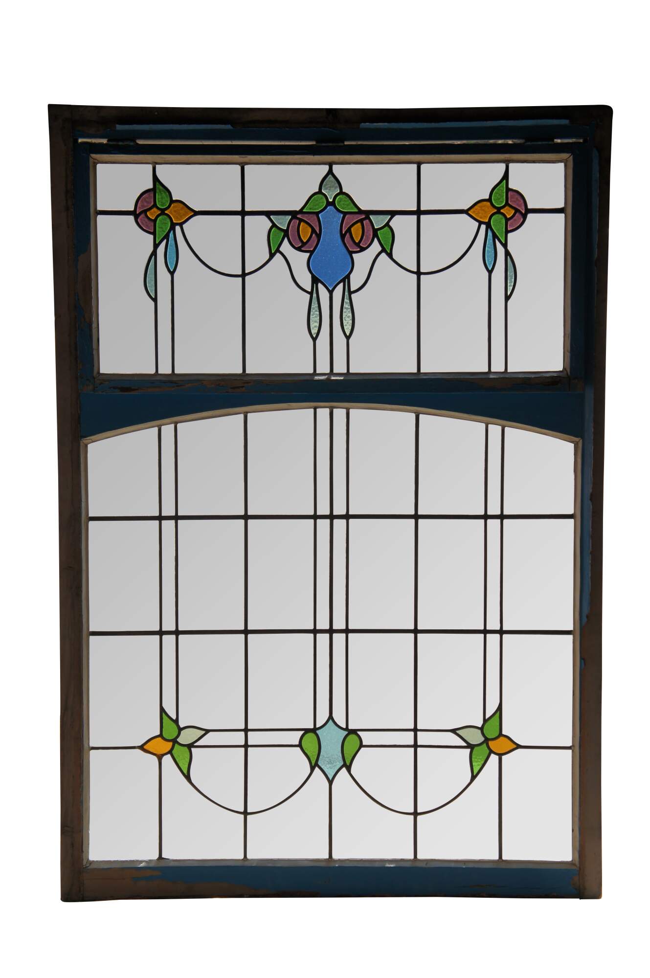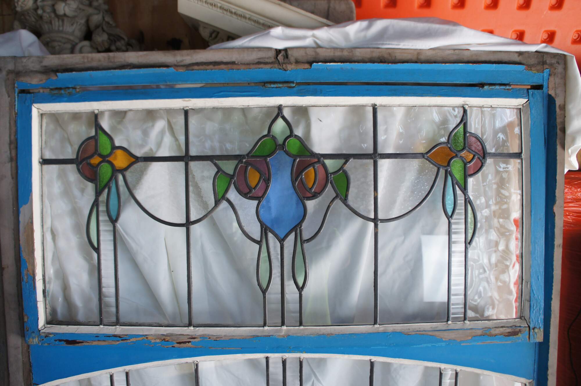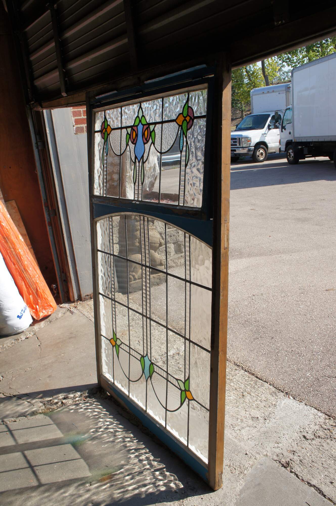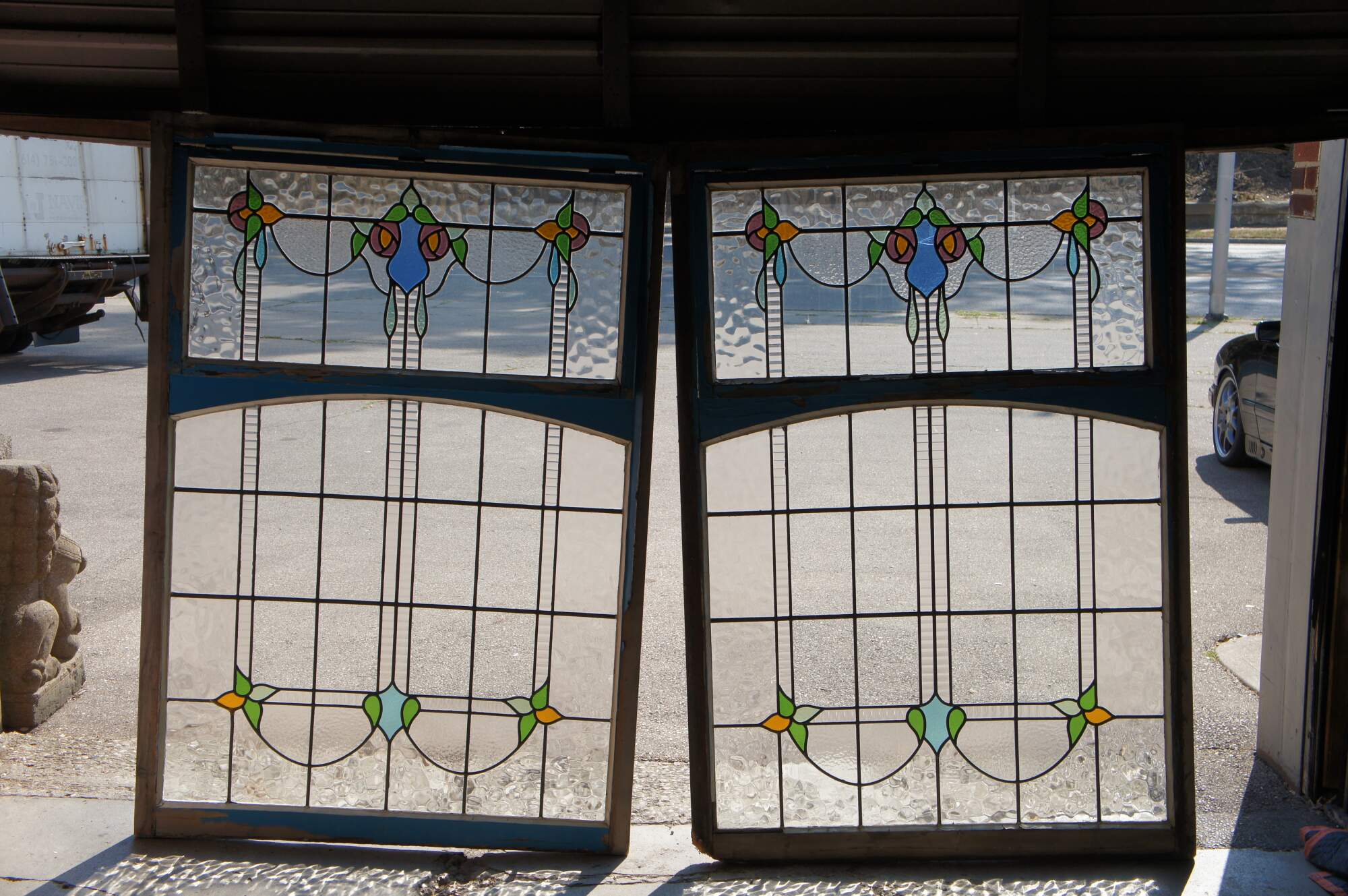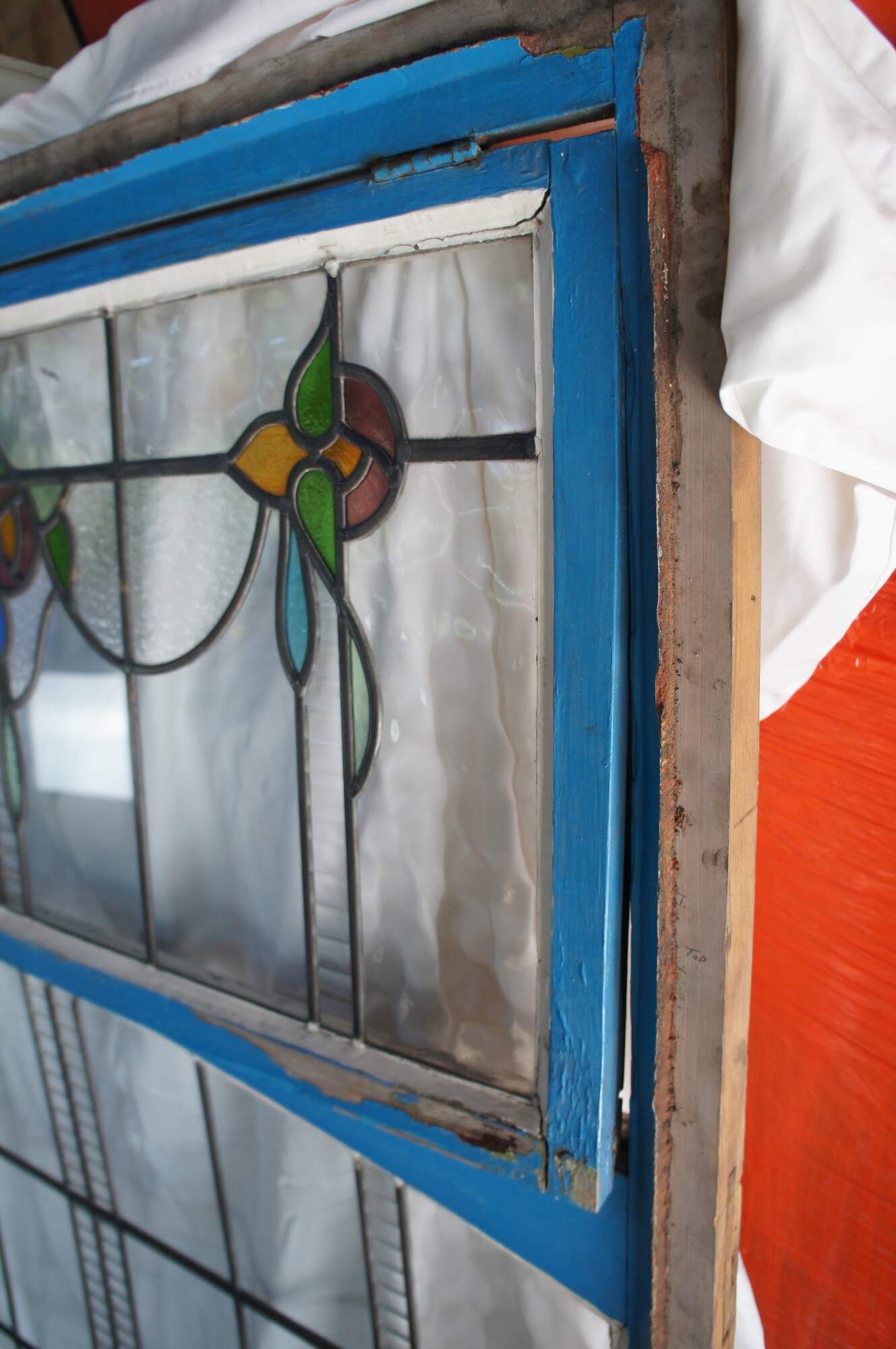 An exquisite pair of 19th century leaded stained glass windows. Features a large rectangular frame with arched area beneath a transom that opens via hinge to allow fresh air in. Each window is designed with clear, pebbled and textured glass set around ornate floral designs showcasing colors of blue, green, amber and purple. The glass is set within large original pine frames. A monumental set that will make for the perfect addition to any space.