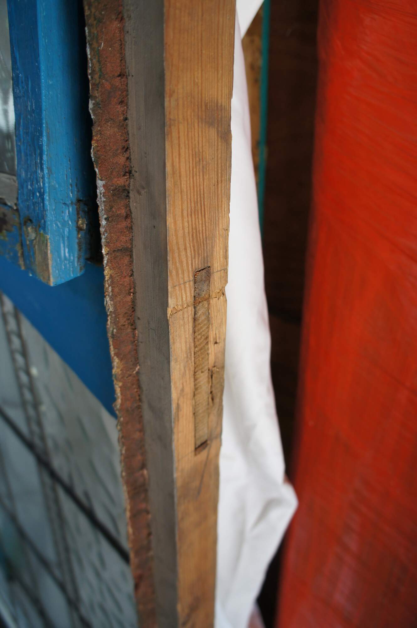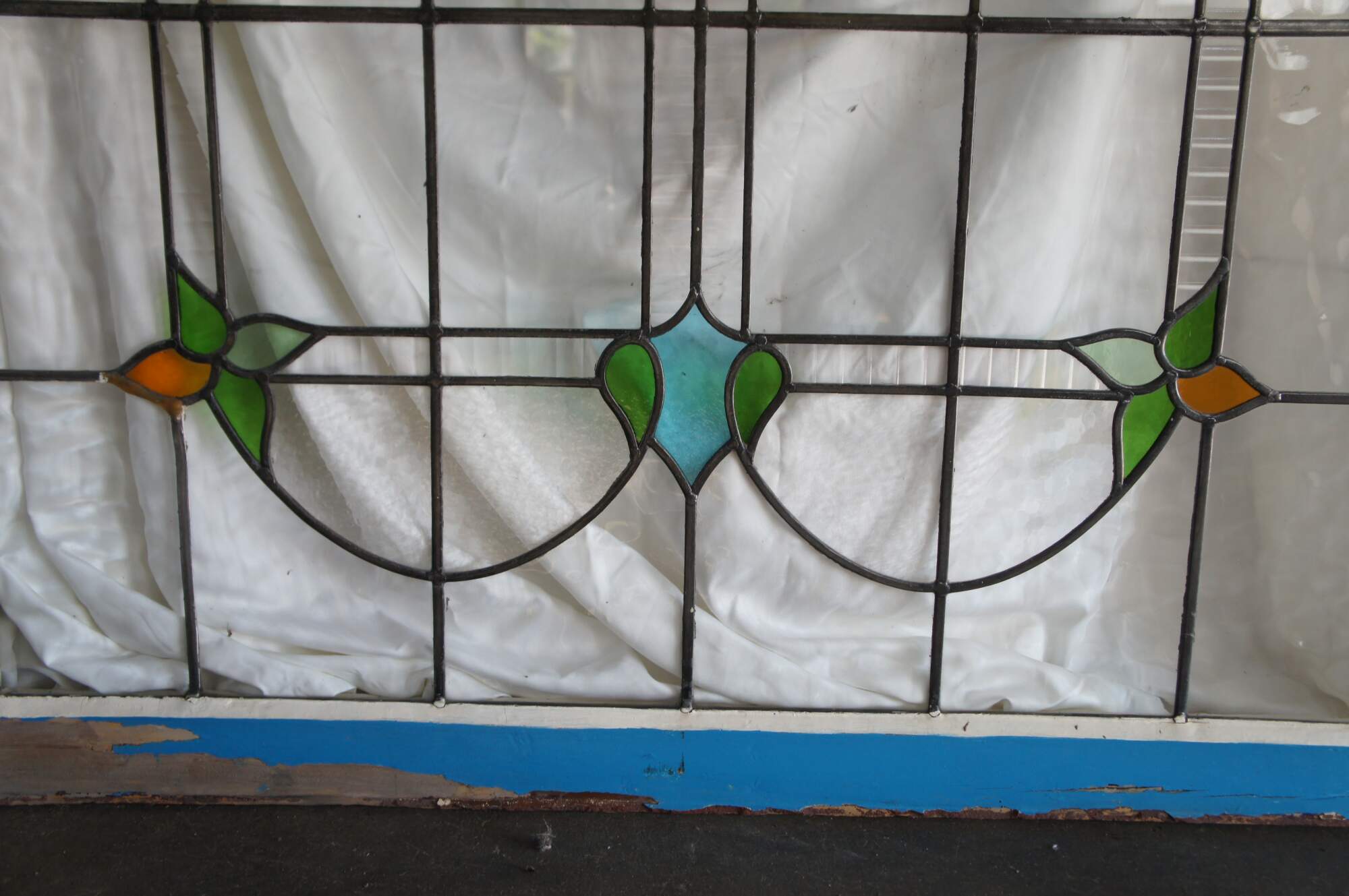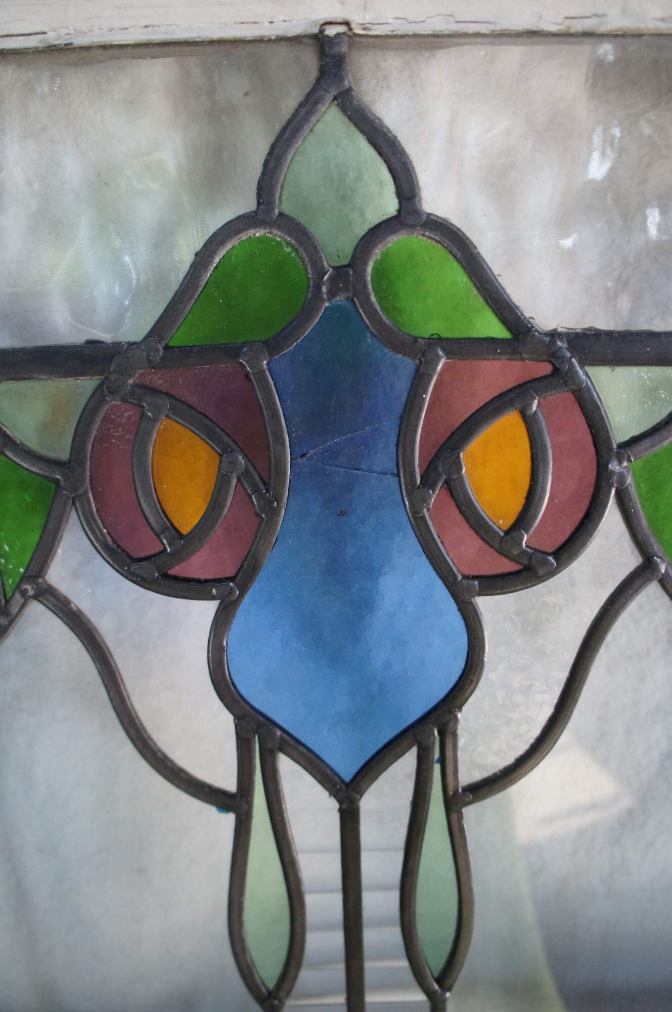 Good Condition; Age and use-related wear. A few small hairlines to colored glass panel. Edge / corner wear to wooden frame and missing trim.