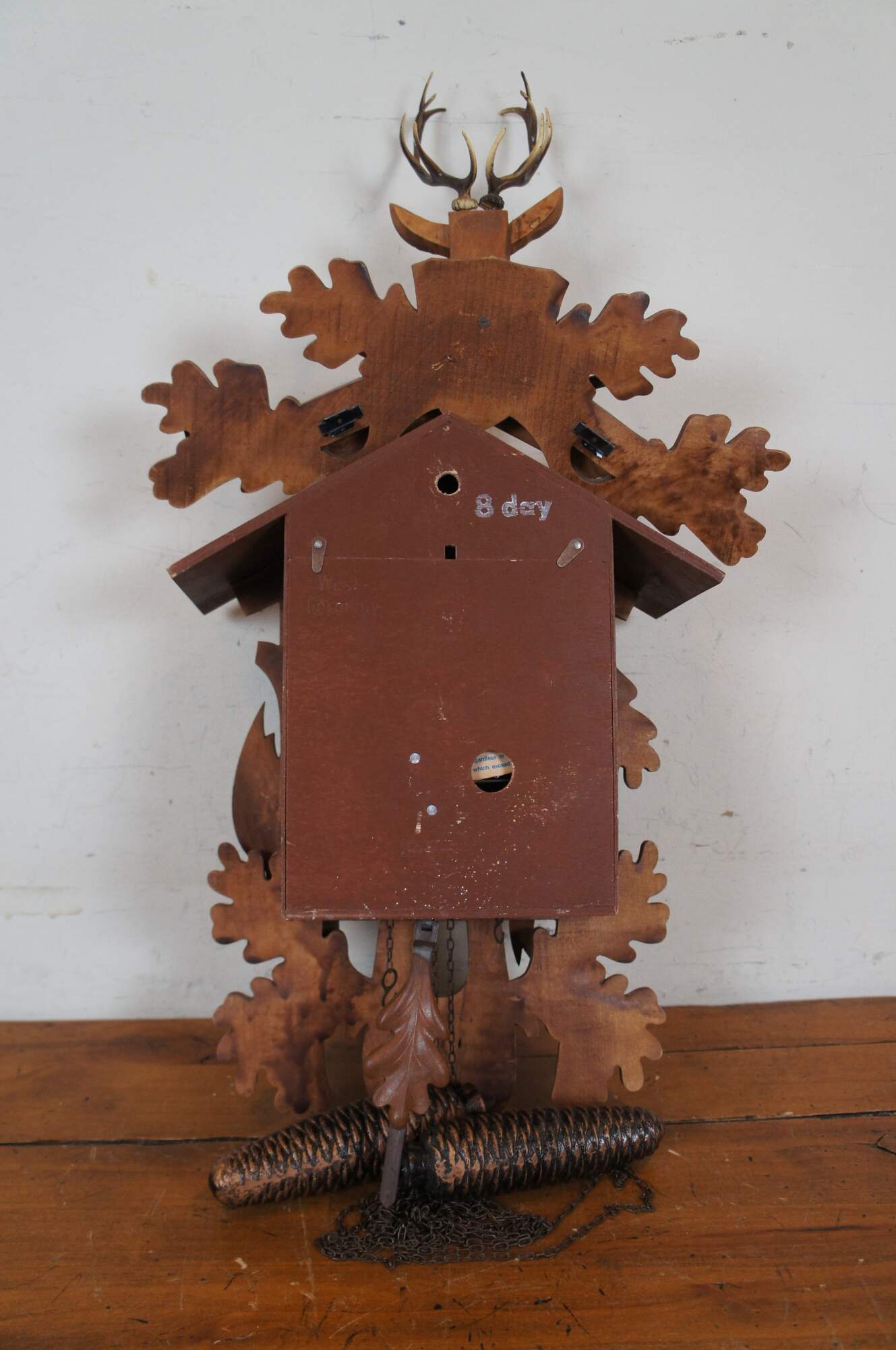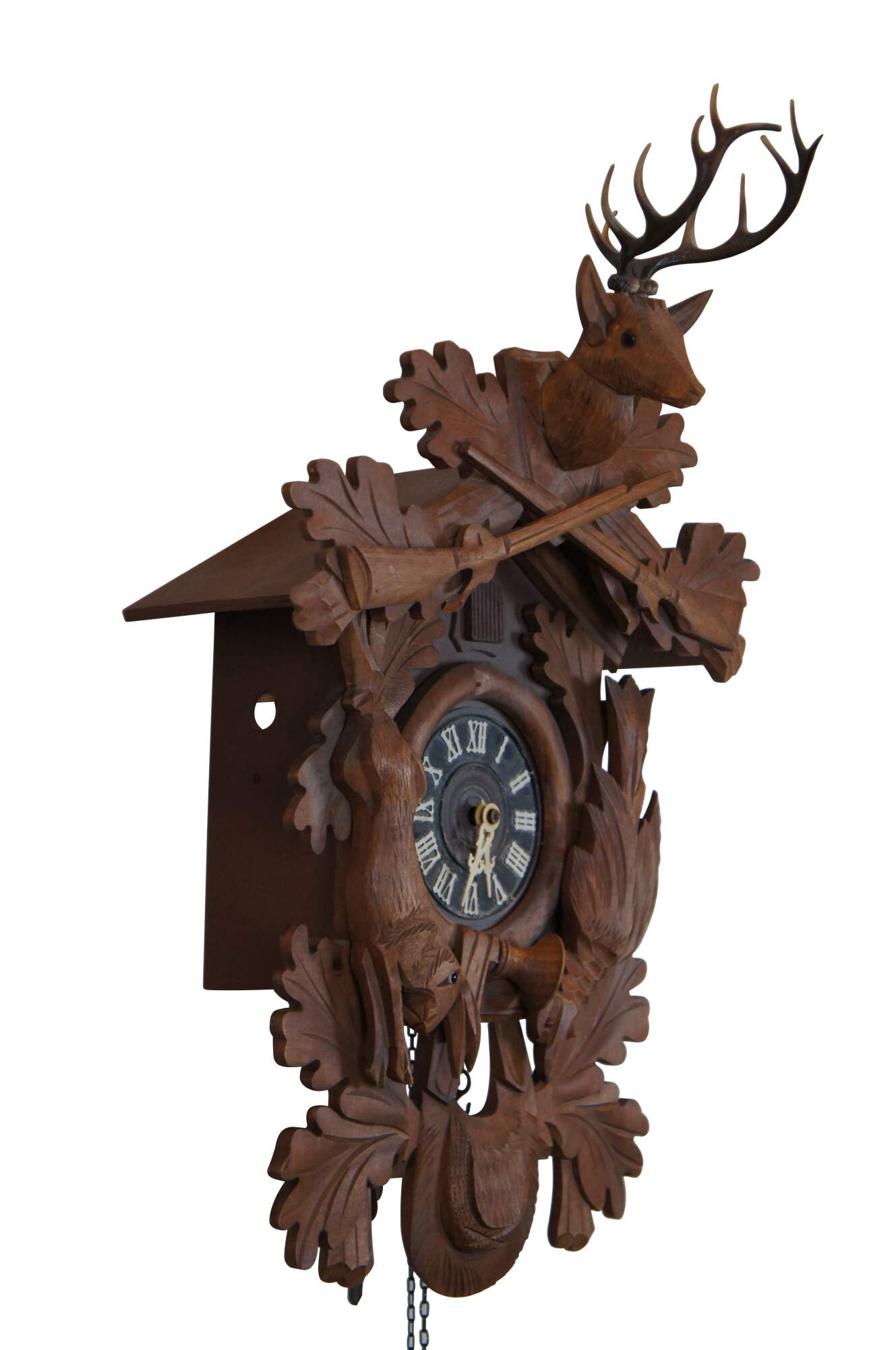 Vintage mid to late 20th century wall hanging, 8 day, chiming cuckoo clock by E. Schmeckenbecher. Features a carved wood Black Forest hunter design featooned with oak leaves, guns, hunting bag and game, topped with a deer head with glass eyes and plastic antlers. Leaf shaped pendulum; two pinecone shaped weights; blue and white plastic cuckoo bird. Movement: Regula - E. Schmeckenbecher - GM 1649000 / 1674539 / 1704075 / 1705294. Made in West Germany.