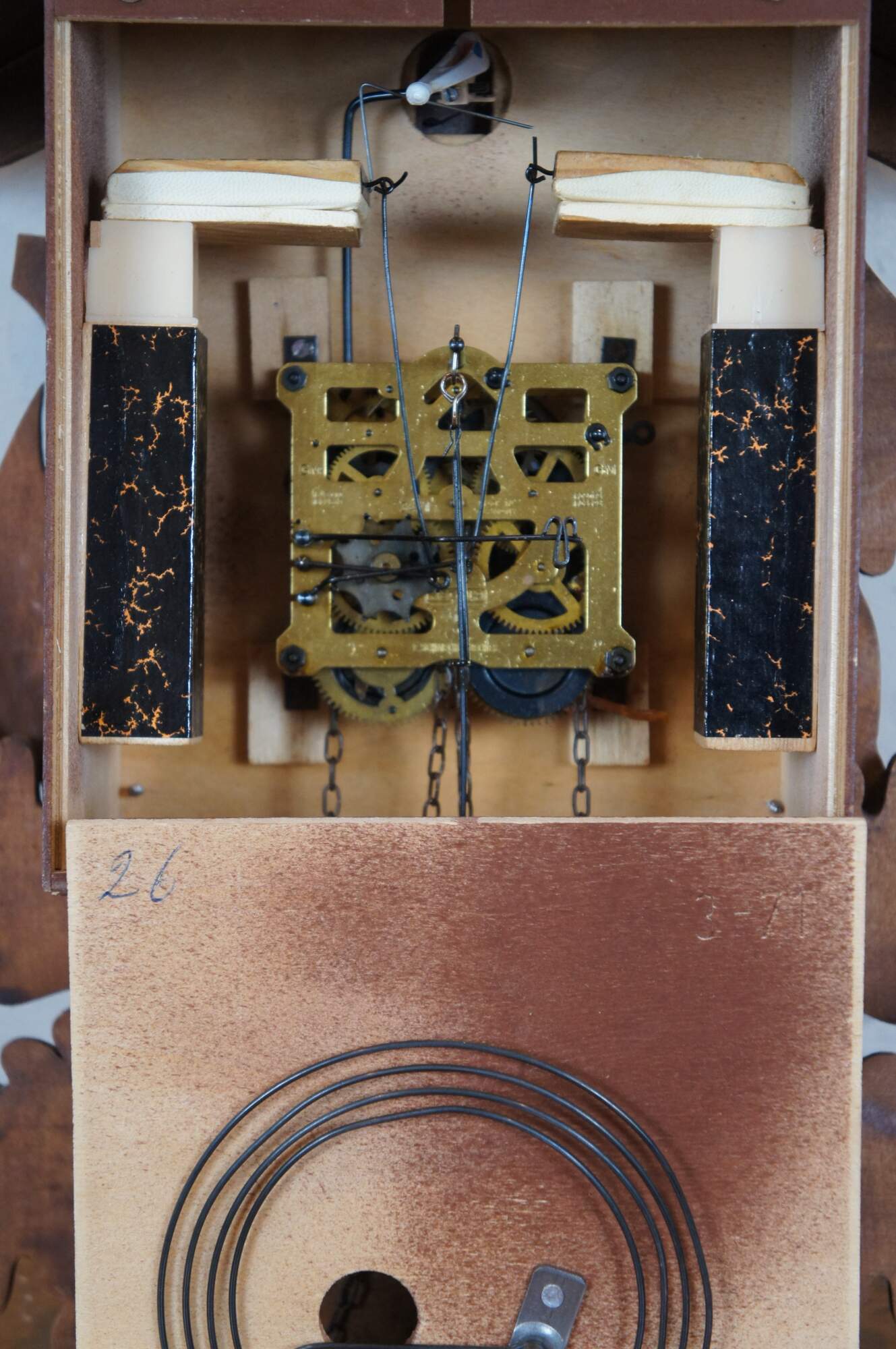 "Emil Schmeckenbecher company was founded in 1948 and went out of business in 1996. The company was located in Villingen, near the eastern edge of the Black Forest in the Baden-Württemberg area. They produced cuckoo clocks, wall clocks and some hall clocks." (Source: NAWCC Forum)
