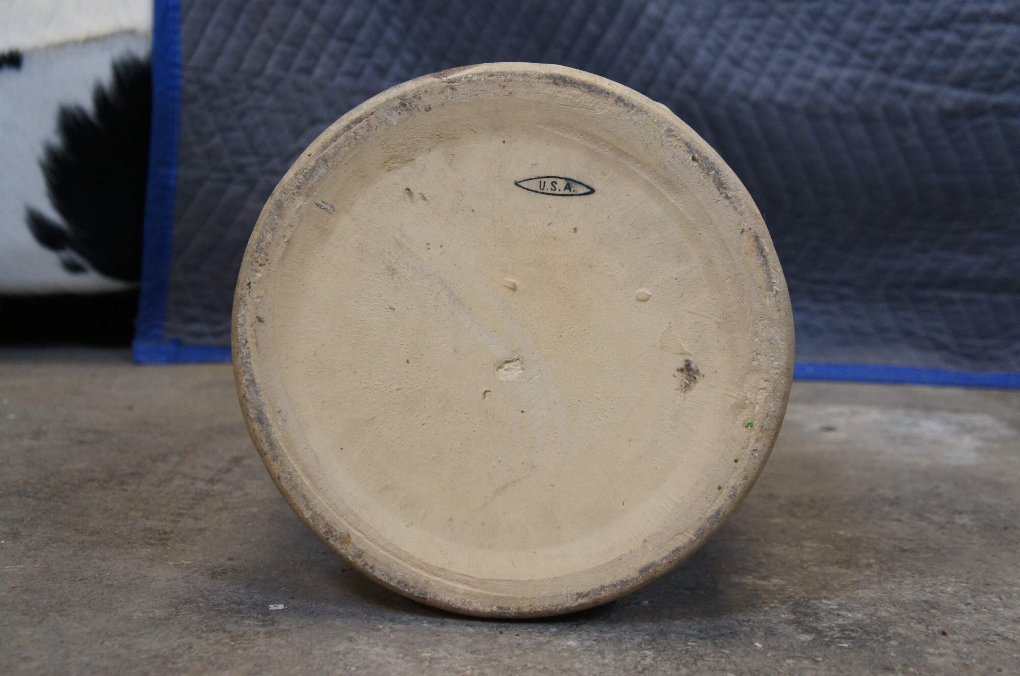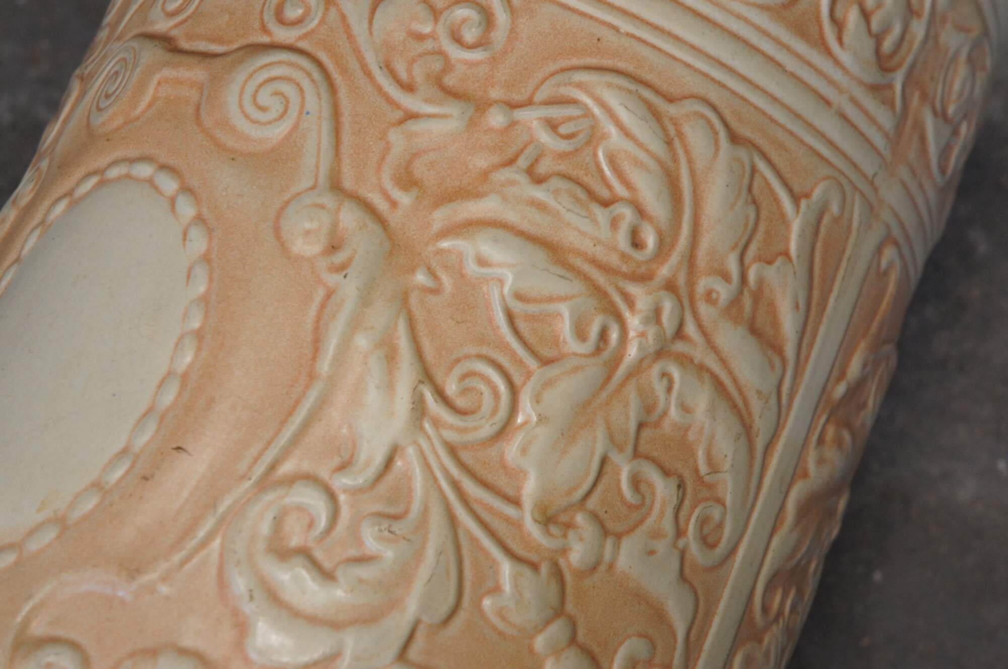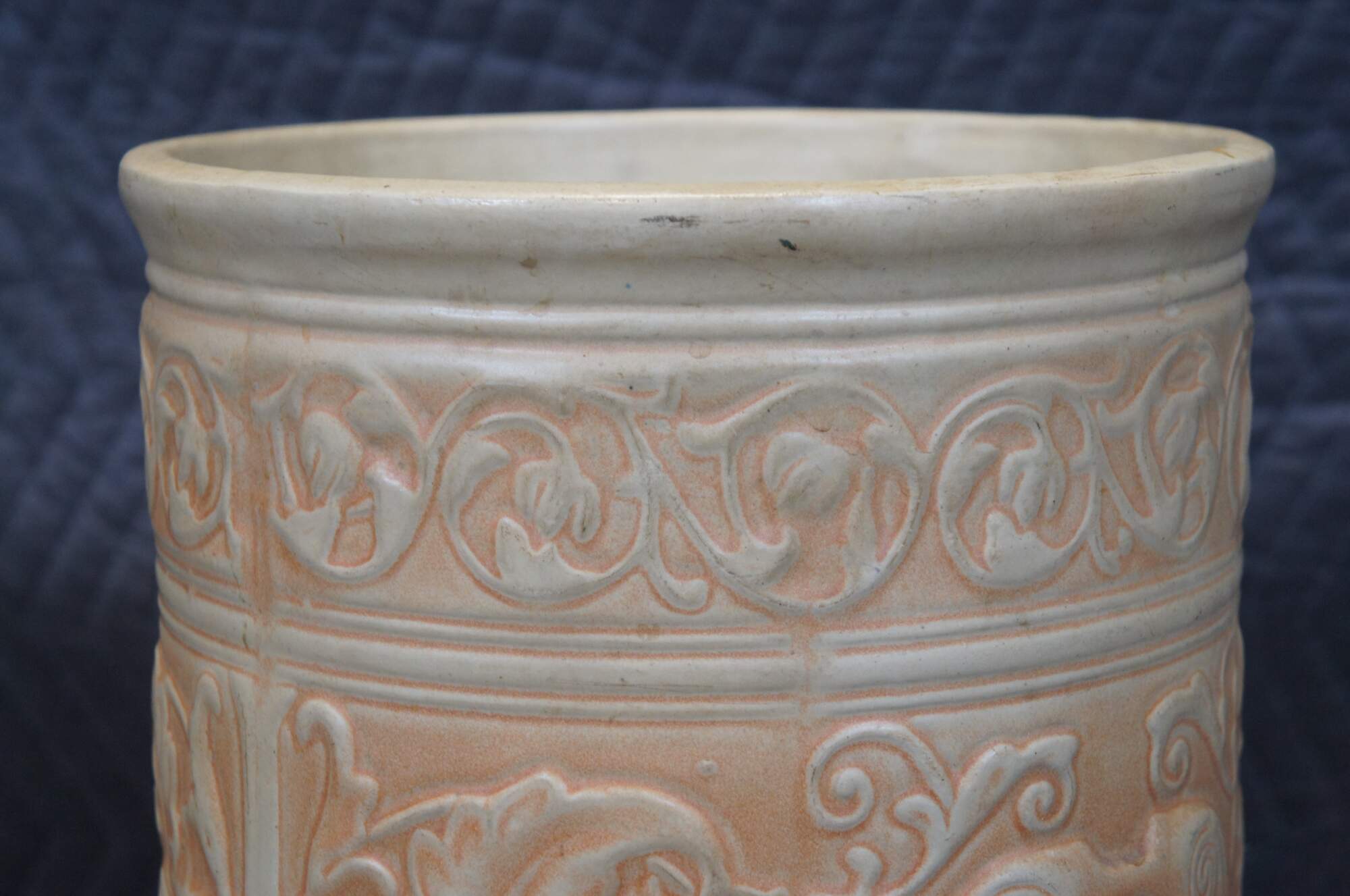 Circa 1930's ceramic umbrella / cane stand featuring a Neoclassical motif with acanthus leaves in peach and white. Attributed to Weller Pottery. Stamped USA in base