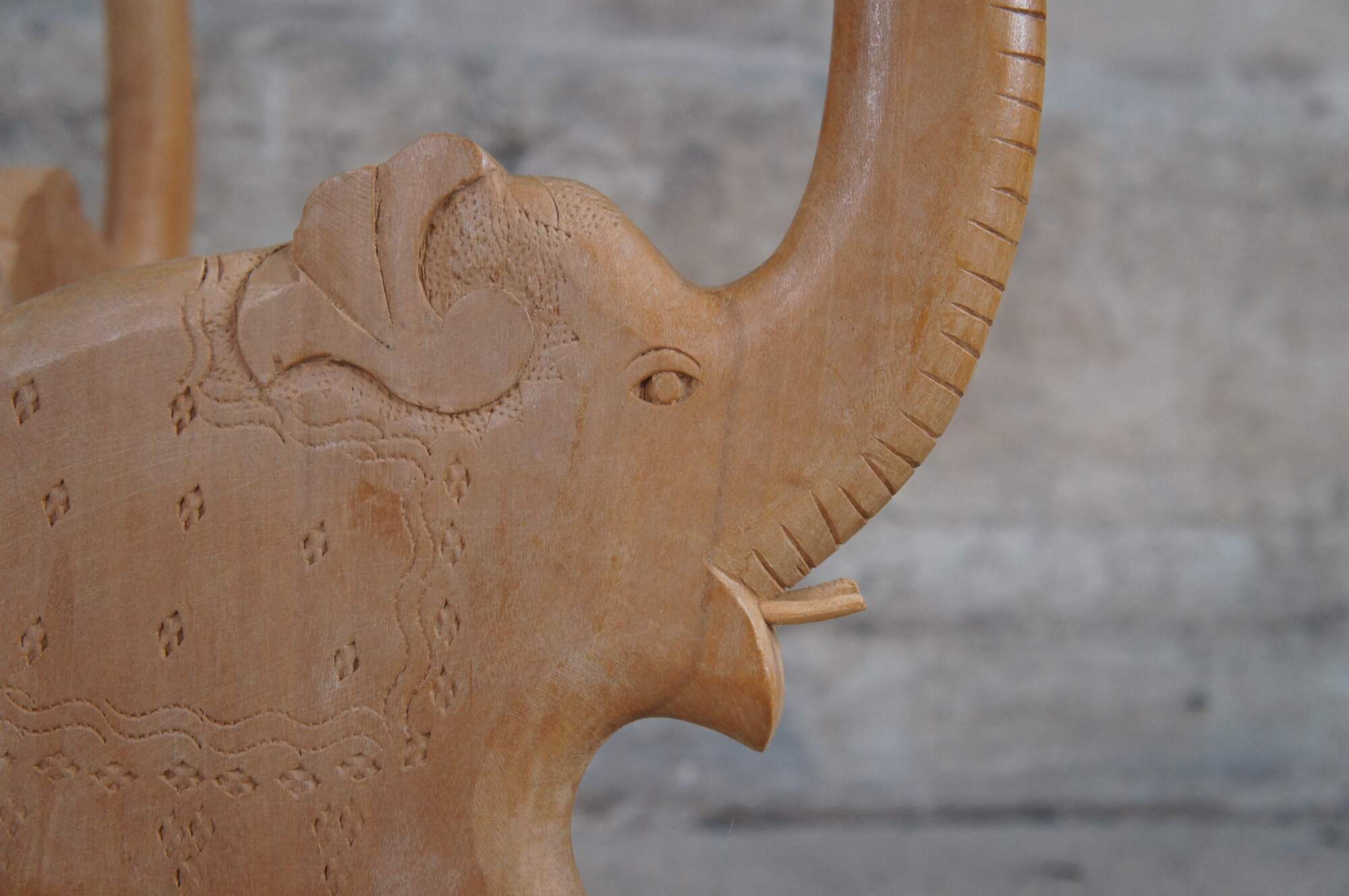 Mid century lucky elephant tea / coffee accent tray table. Made of teak wood featuring a trio of elephants pedestal with trunks up that supports a Morrocan / Damascus style brass tray with enameled floral leaf design. Made in India.