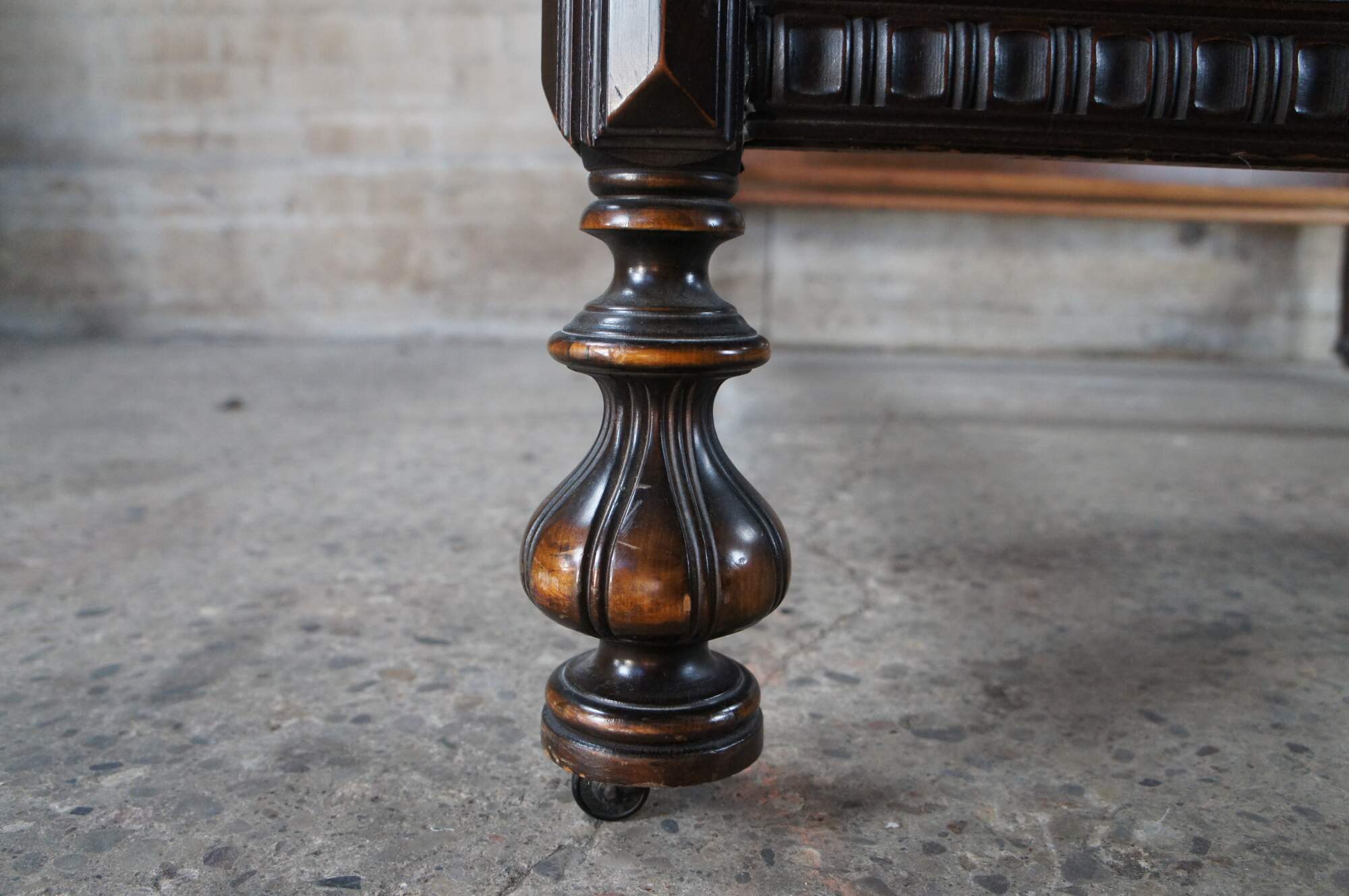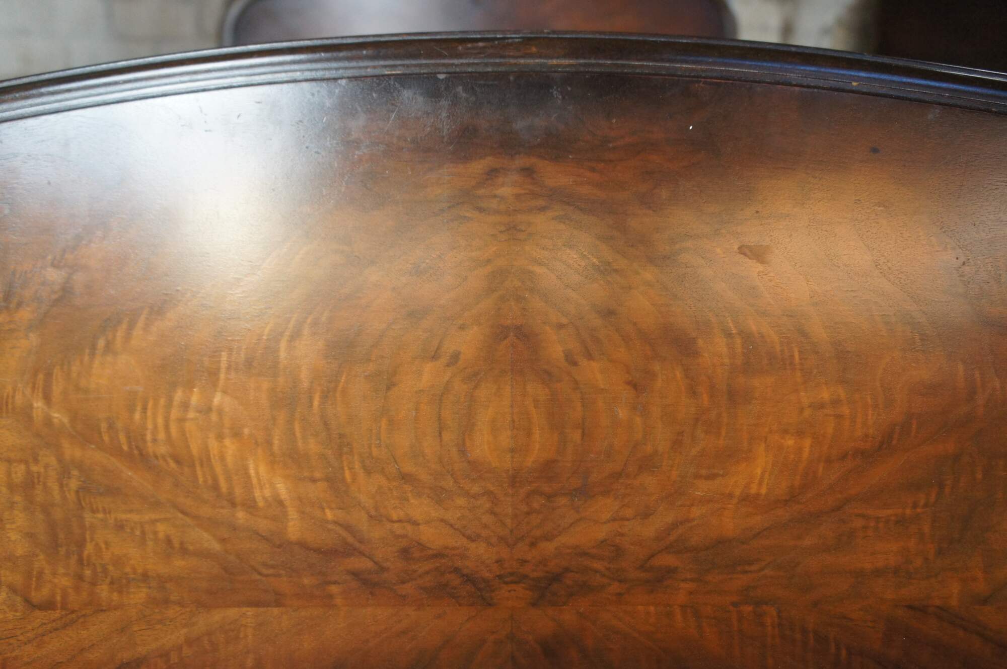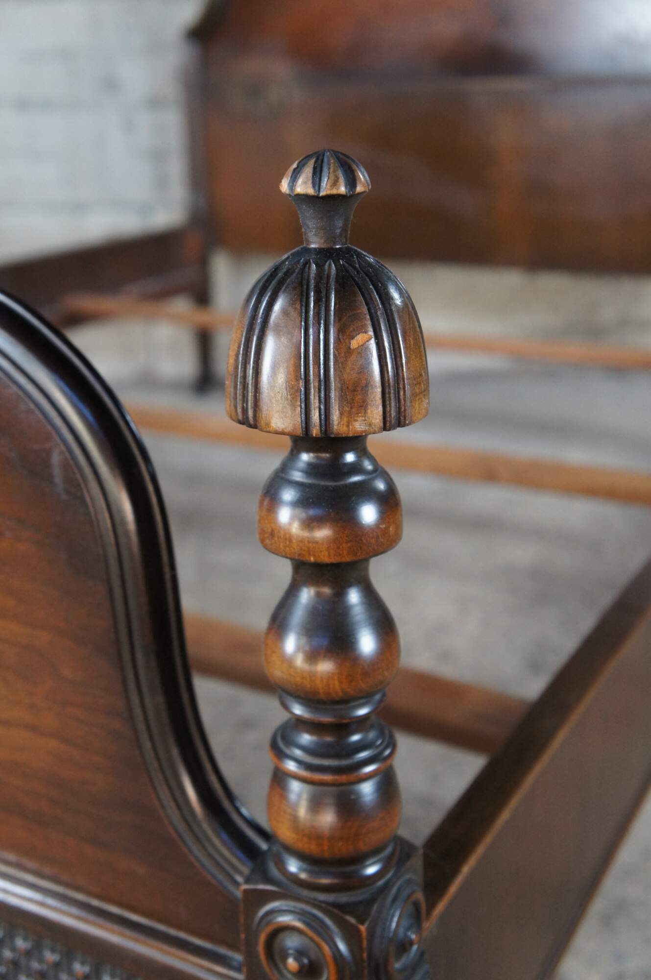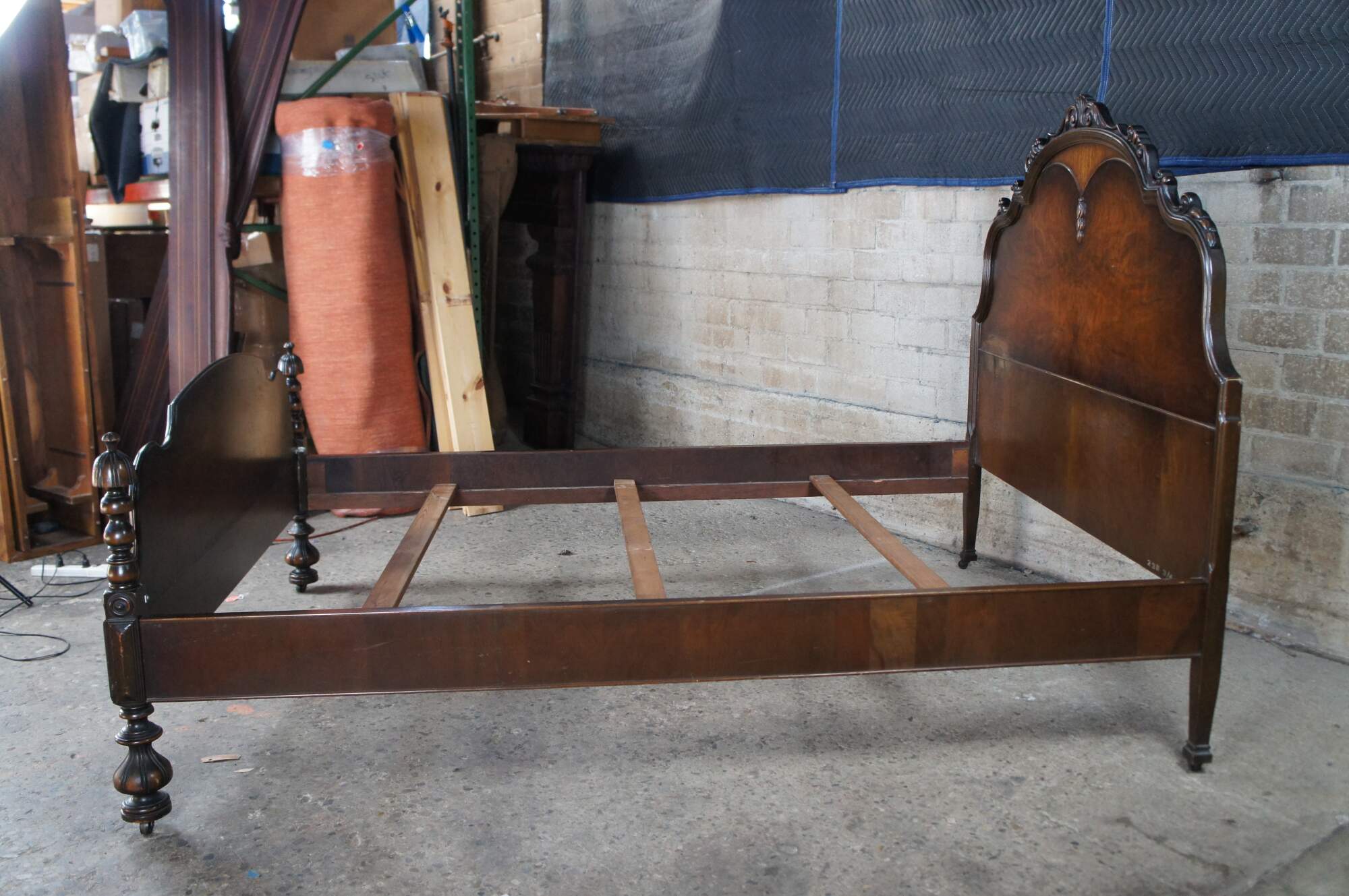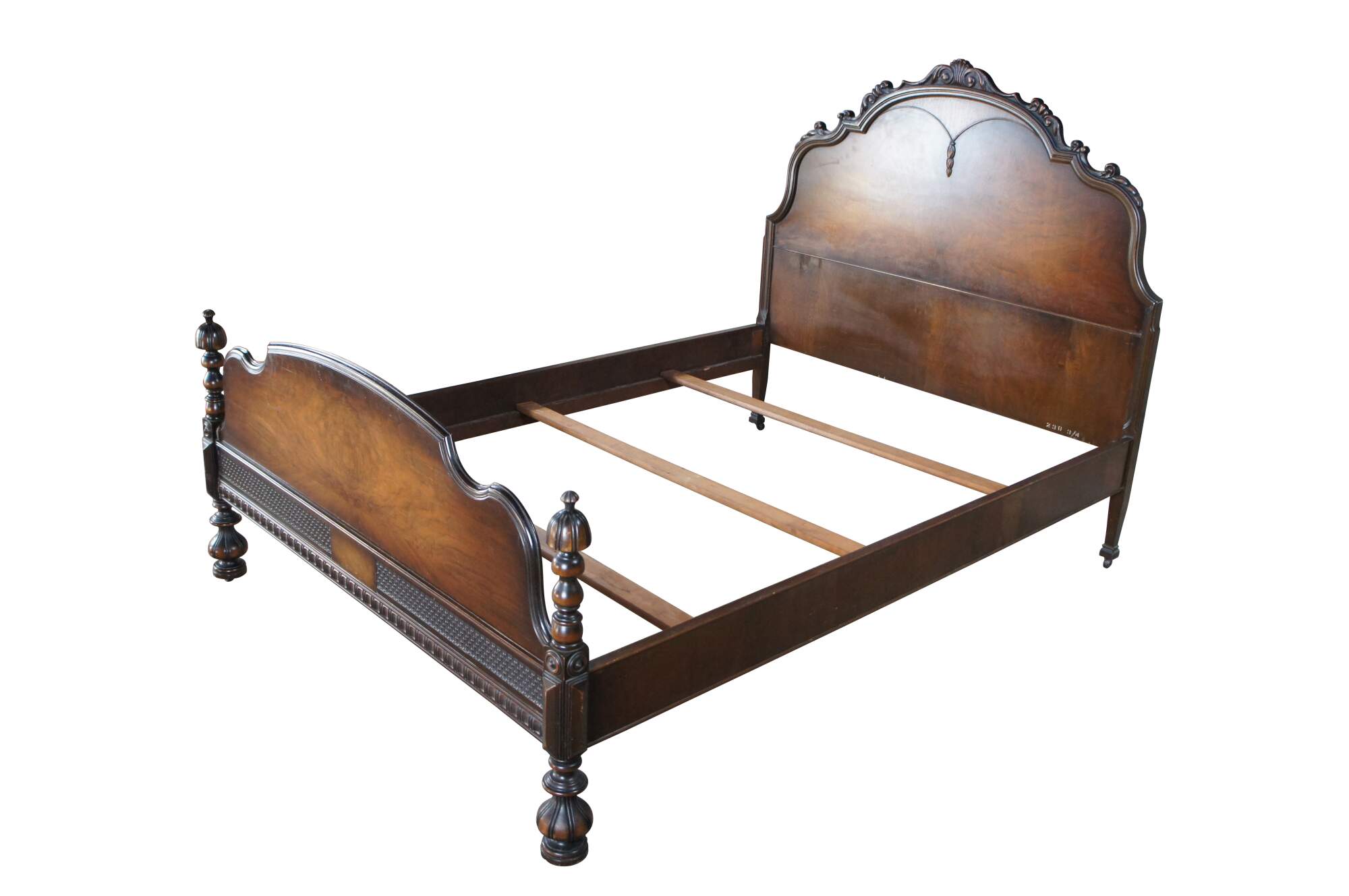 American Furniture Company Jacobean Gothic Revival Full Size / Double Bed Circa 1930s. Operating out of Batesville Indiana since 1899, they worked closely and collaborated in part with Romweber. Specializing in high grade bedroom suites & furniture. Features a beautiful form made from American walnut with mathbook burled veneer. The bed features serpentine shaped head and foot boards with carved accents and turned posts. The bed is supported by unique bulbous feet with casters.