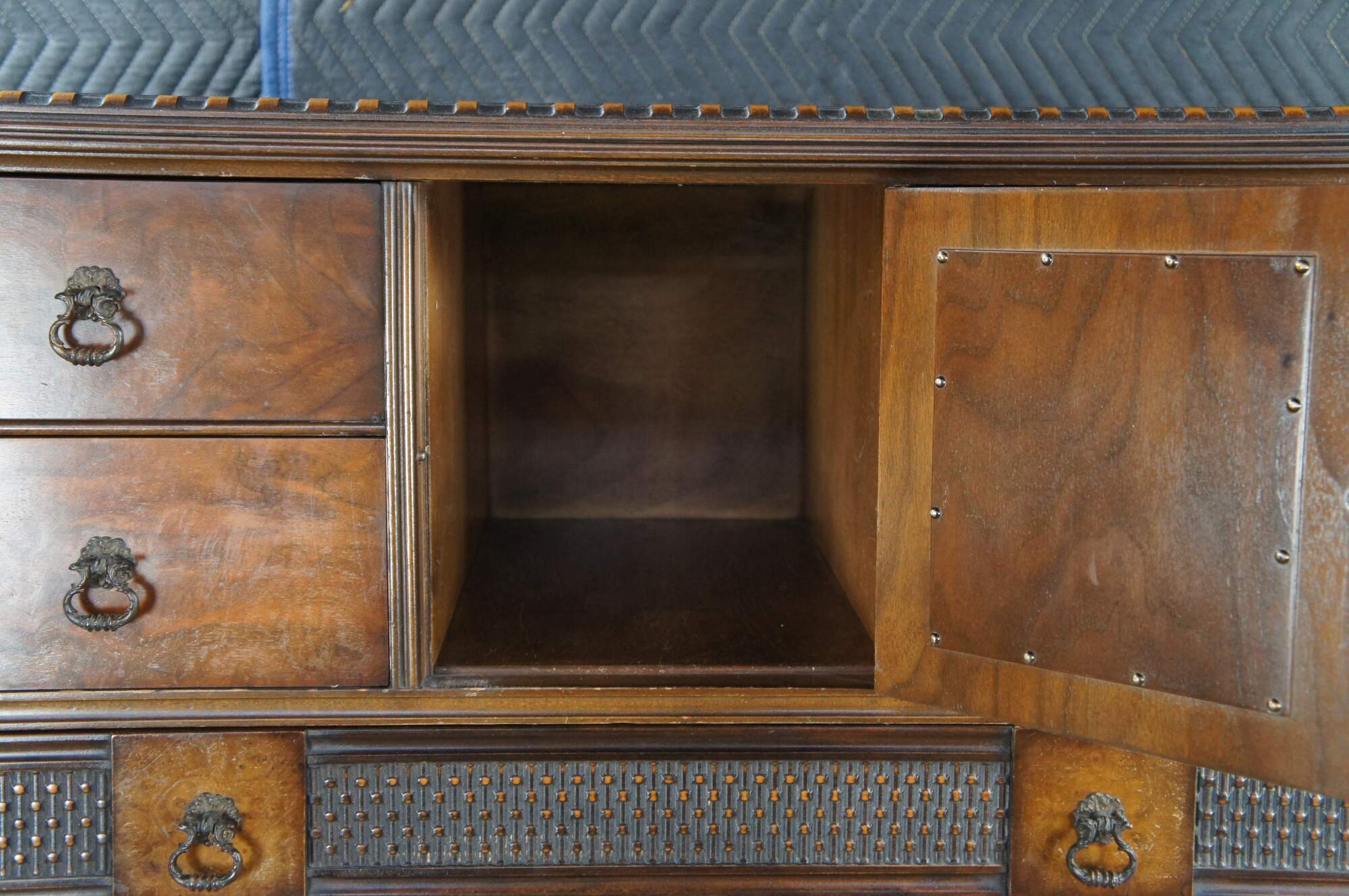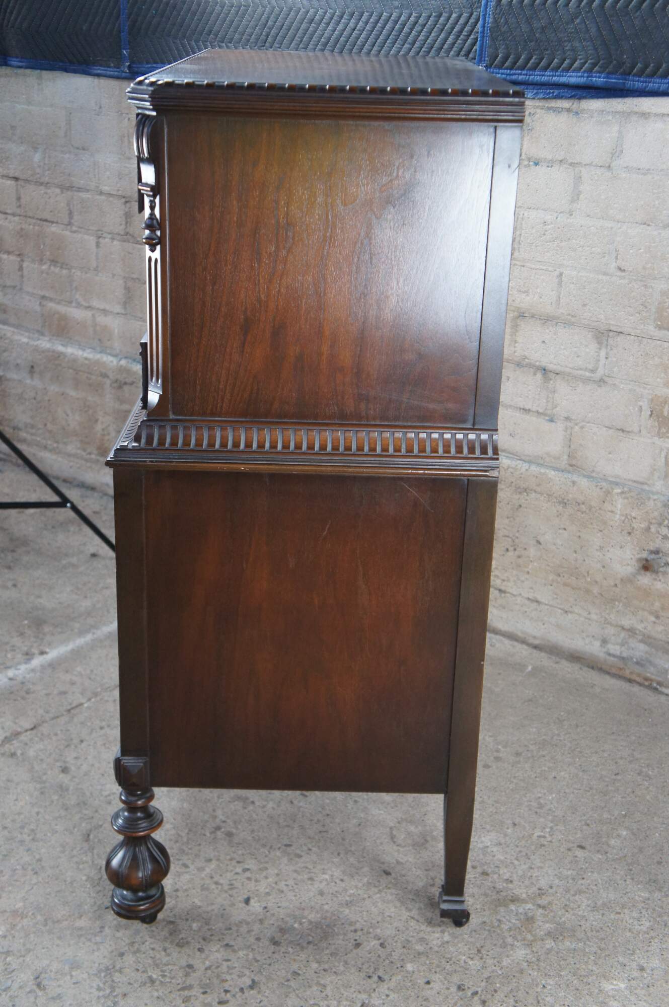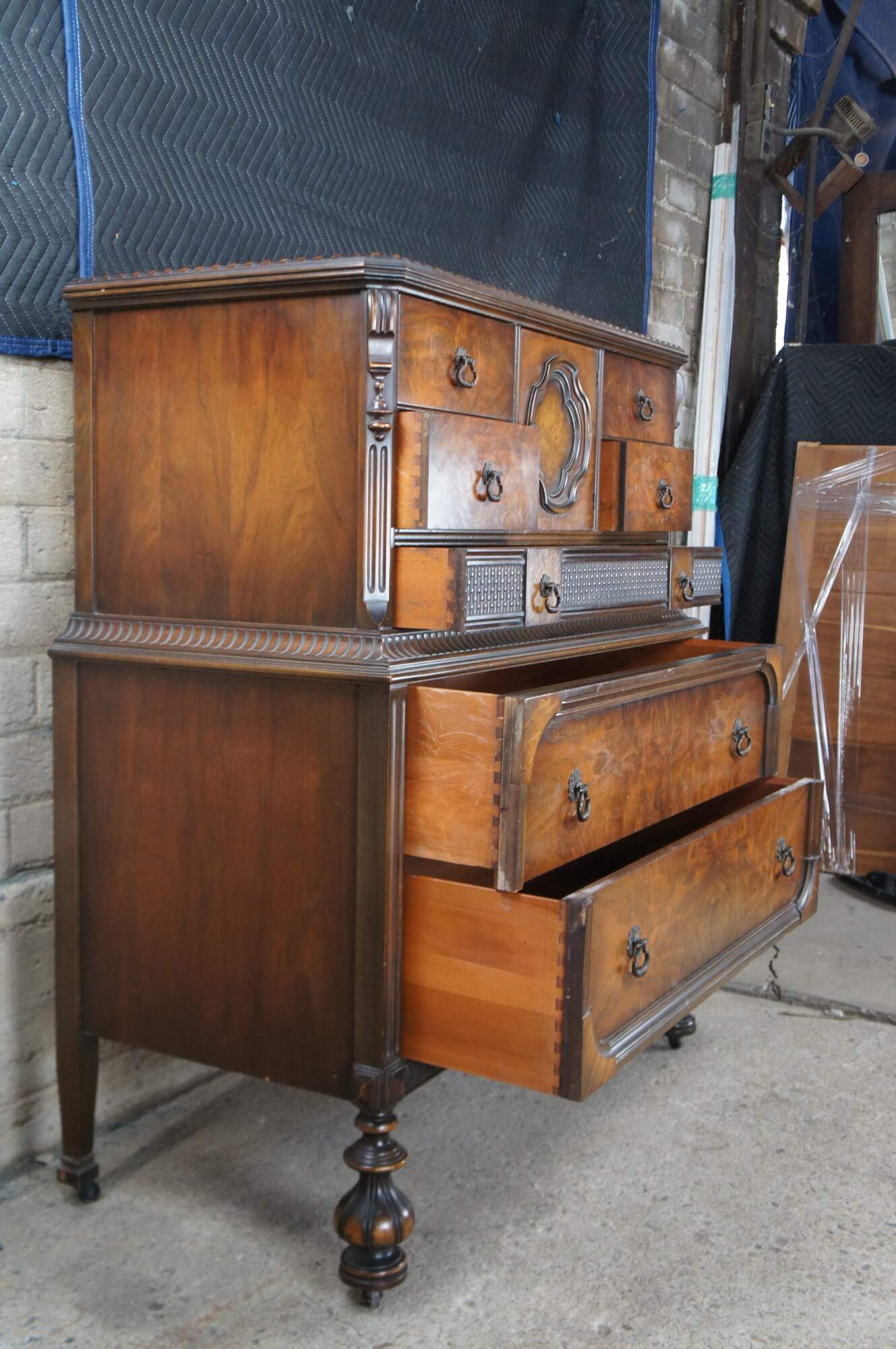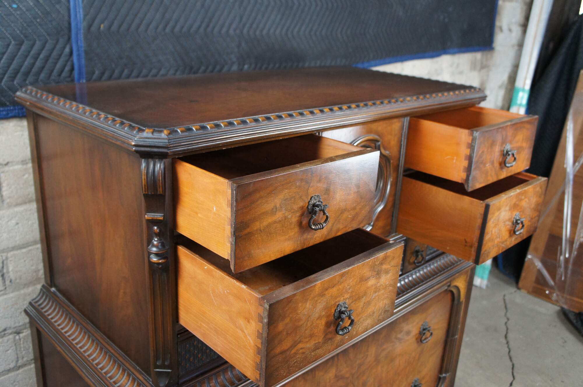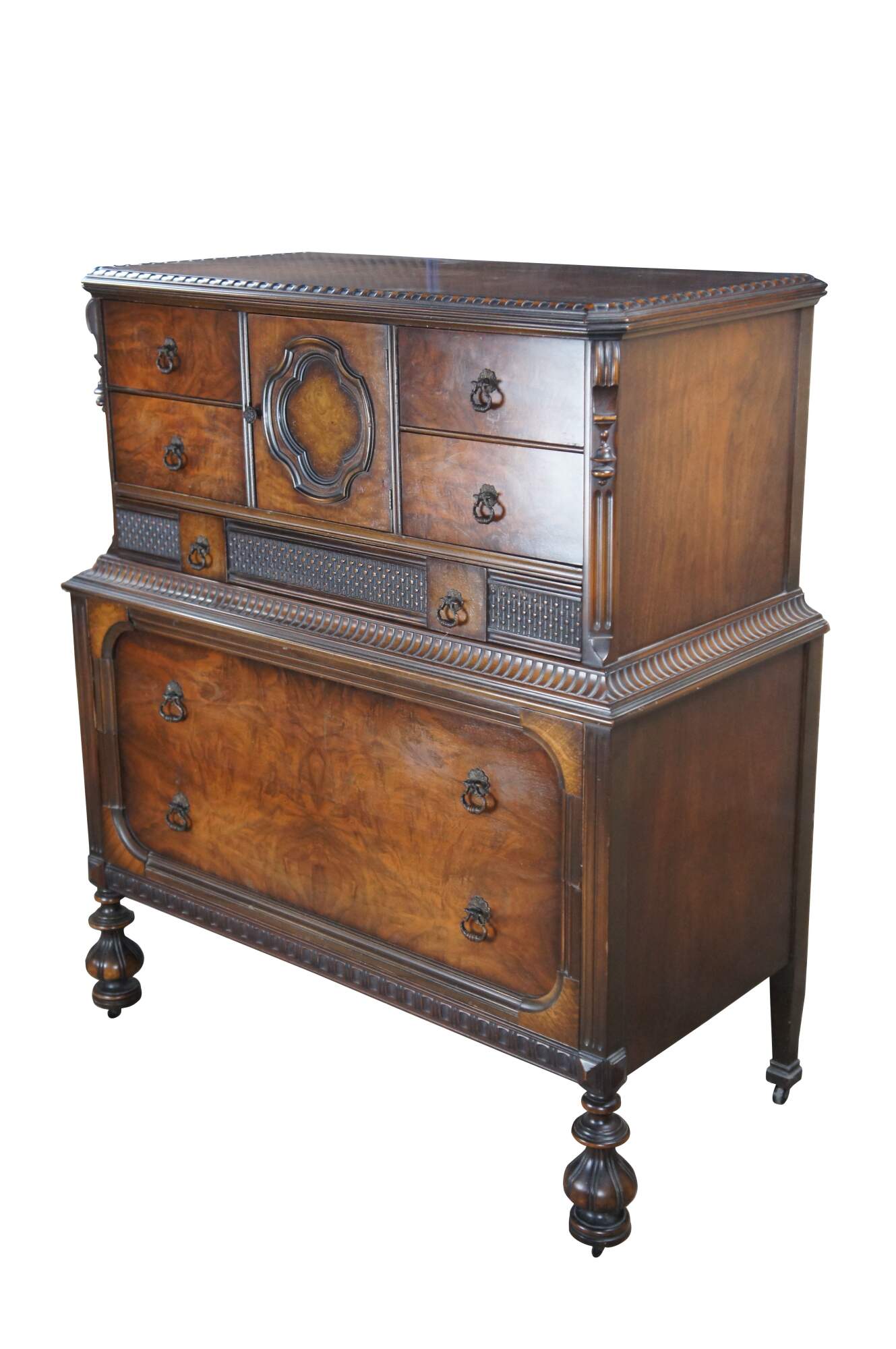 American Furniture Company Jacobean Gothic Revival tallboy dresser, Circa 1930s. Operating out of Batesville Indiana since 1899, they worked closely and collaborated in part with Romweber. Specializing in high grade bedroom suites & furniture. Features a chest on chest form made from American walnut with matchbook veneer burled drawer fronts. Includes 7 oak dovetailed drawers and one central cubby with a quatrefoil shaped door. The outer stiles of the dresser are chamfered with "s" scrolled spandrels over quarter cut spindles and fluting terminating into rams tongues. The cabinet has brass drawer pulls and is supported by bulbous turned bun feet.