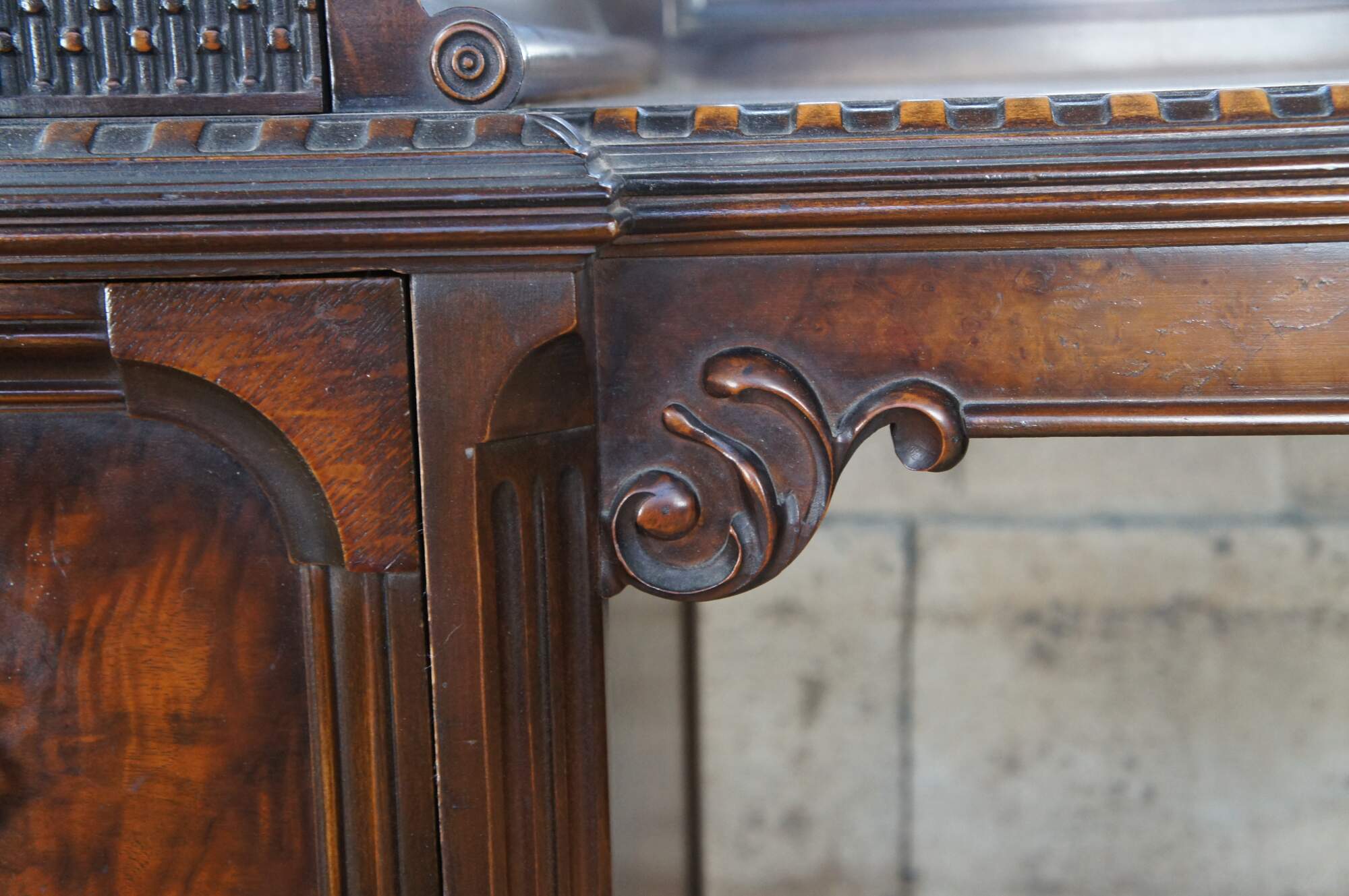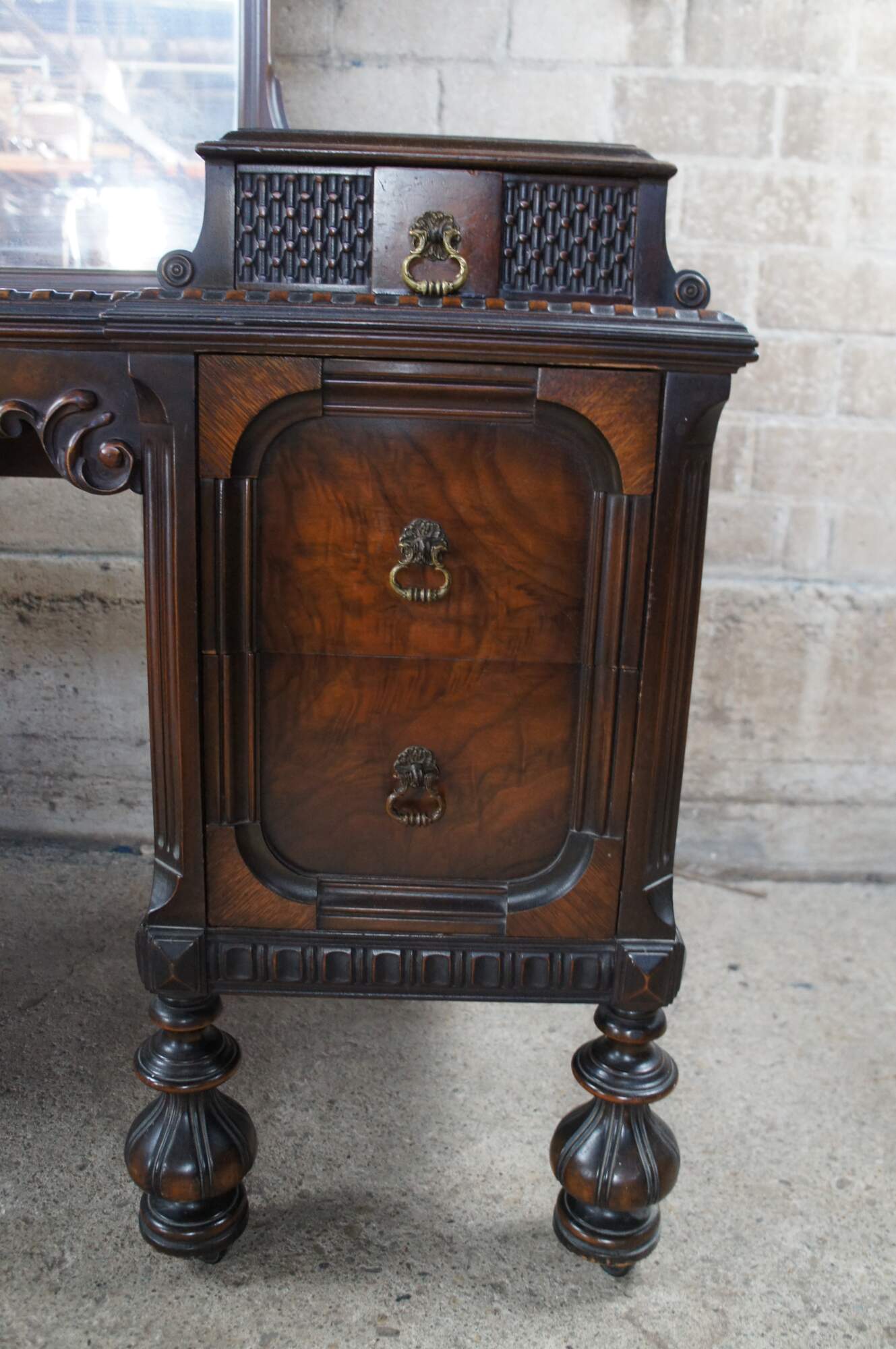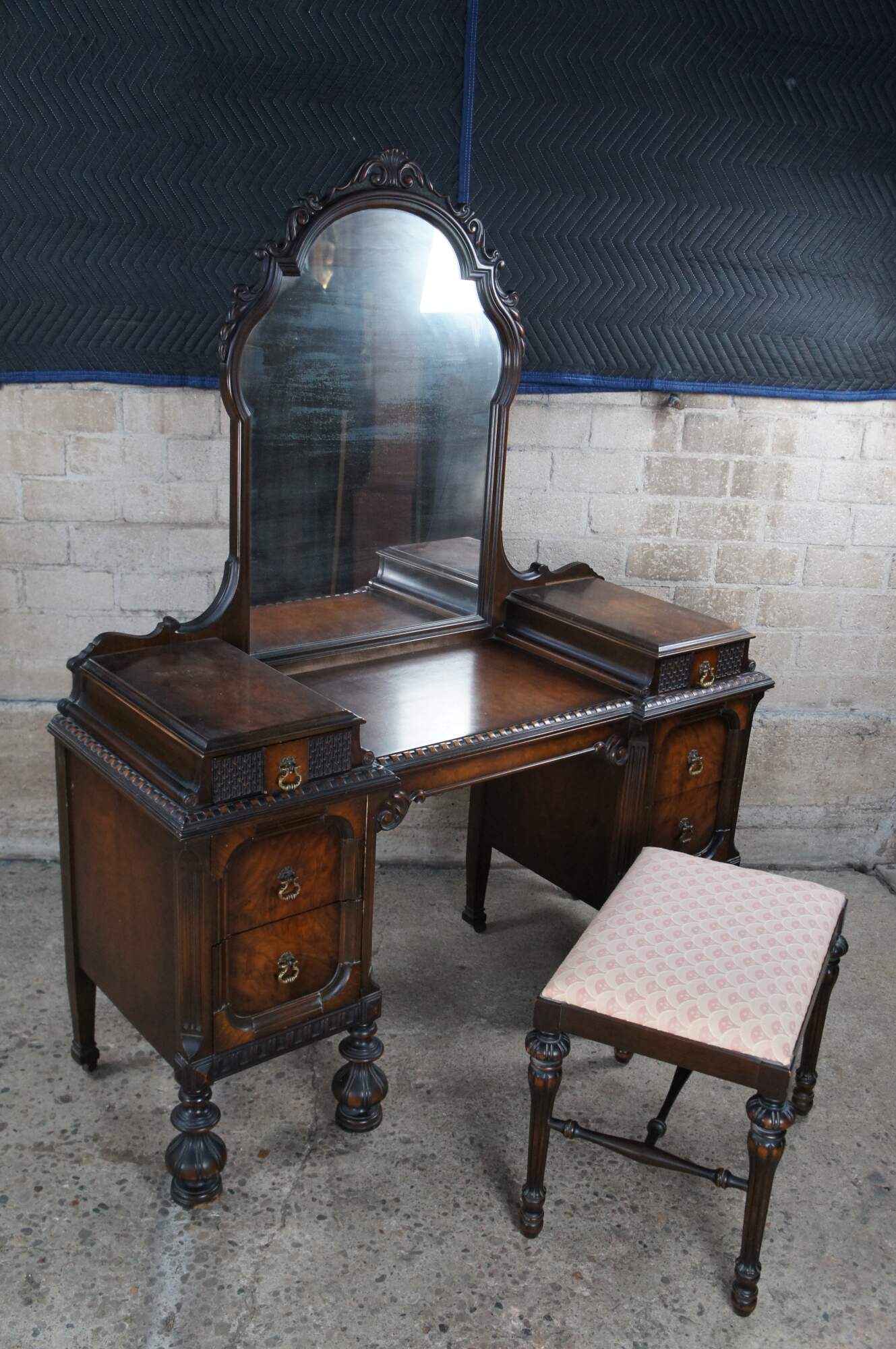American Furniture Company Jacobean Gothic Revival mirrored vanity, Circa 1930s. Operating out of Batesville Indiana since 1899, they worked closely and collaborated in part with Romweber. Specializing in high grade bedroom suites & furniture. Features a beautiful form made from American walnut with matchbook veneer burled drawer fronts. Includes 6 dovetailed drawers, an ornate mirror and charming by bulbous turned feet. Paired with a miss-matched antique stool with turned legs and an upholstered seat.