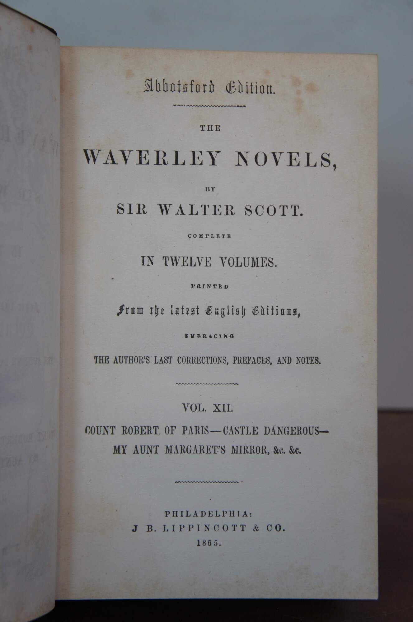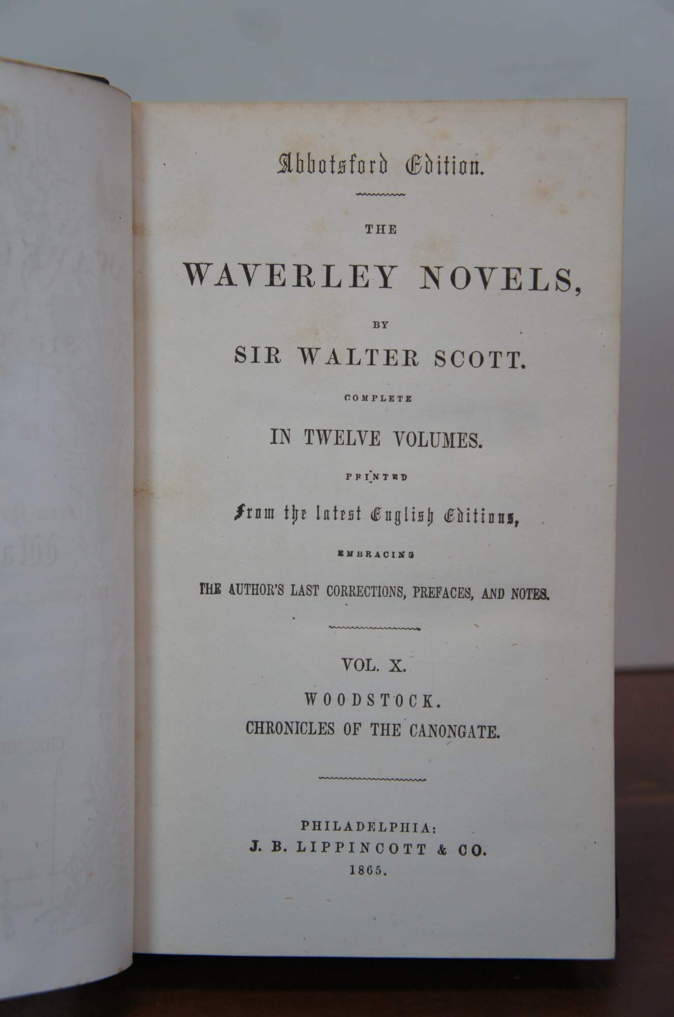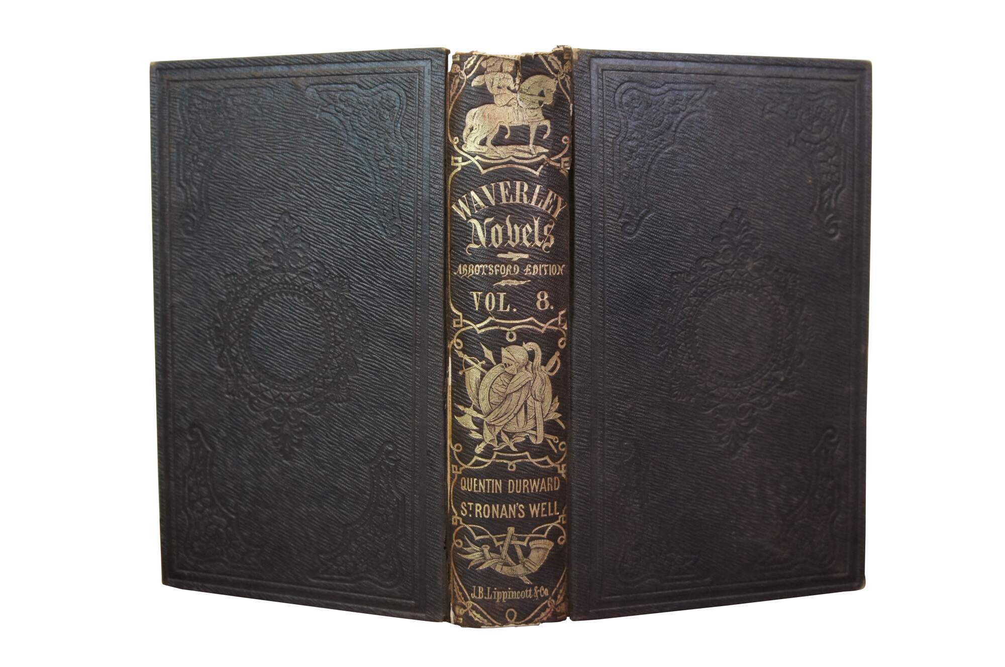 The Waverly Novels" by Sir Walter Scott - Abbotsford Edition - Vol. VIII : Quentin Durward / St. Ronan's Well - Vol X : Woodstock / Chronicles of Canongate - Vol XII : Count Robert of Paris / Castle Dangerous / My Aunt Margaret's Mirror, Etc - Published by J.B. Lippincott & Co 1864, 1865. Brown embossed leather bound with knight and horse crest, hard back / hard cover.