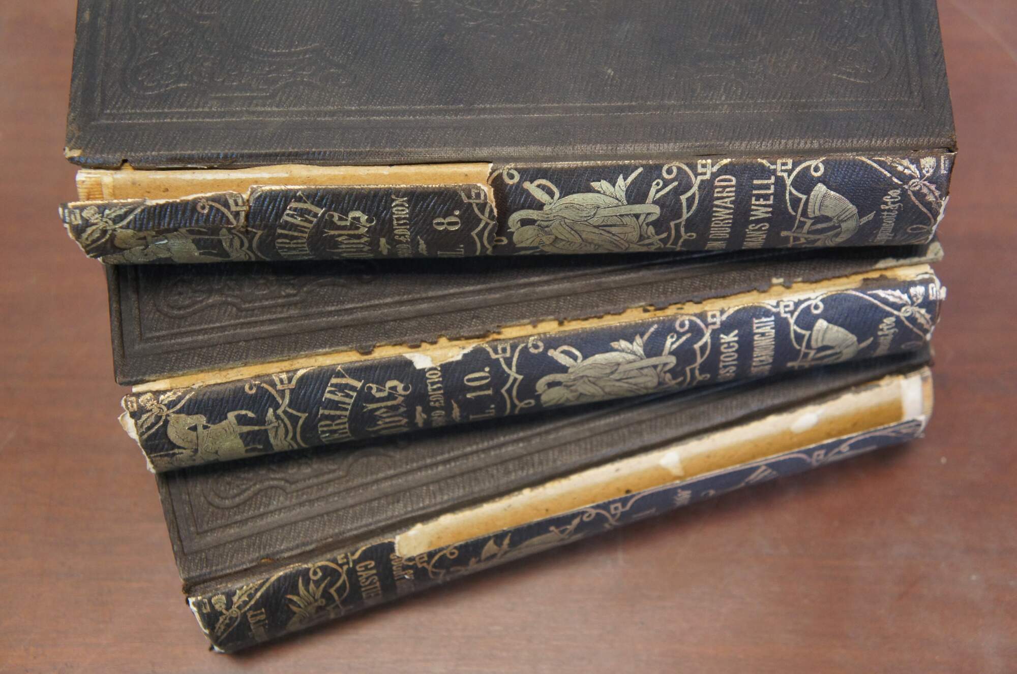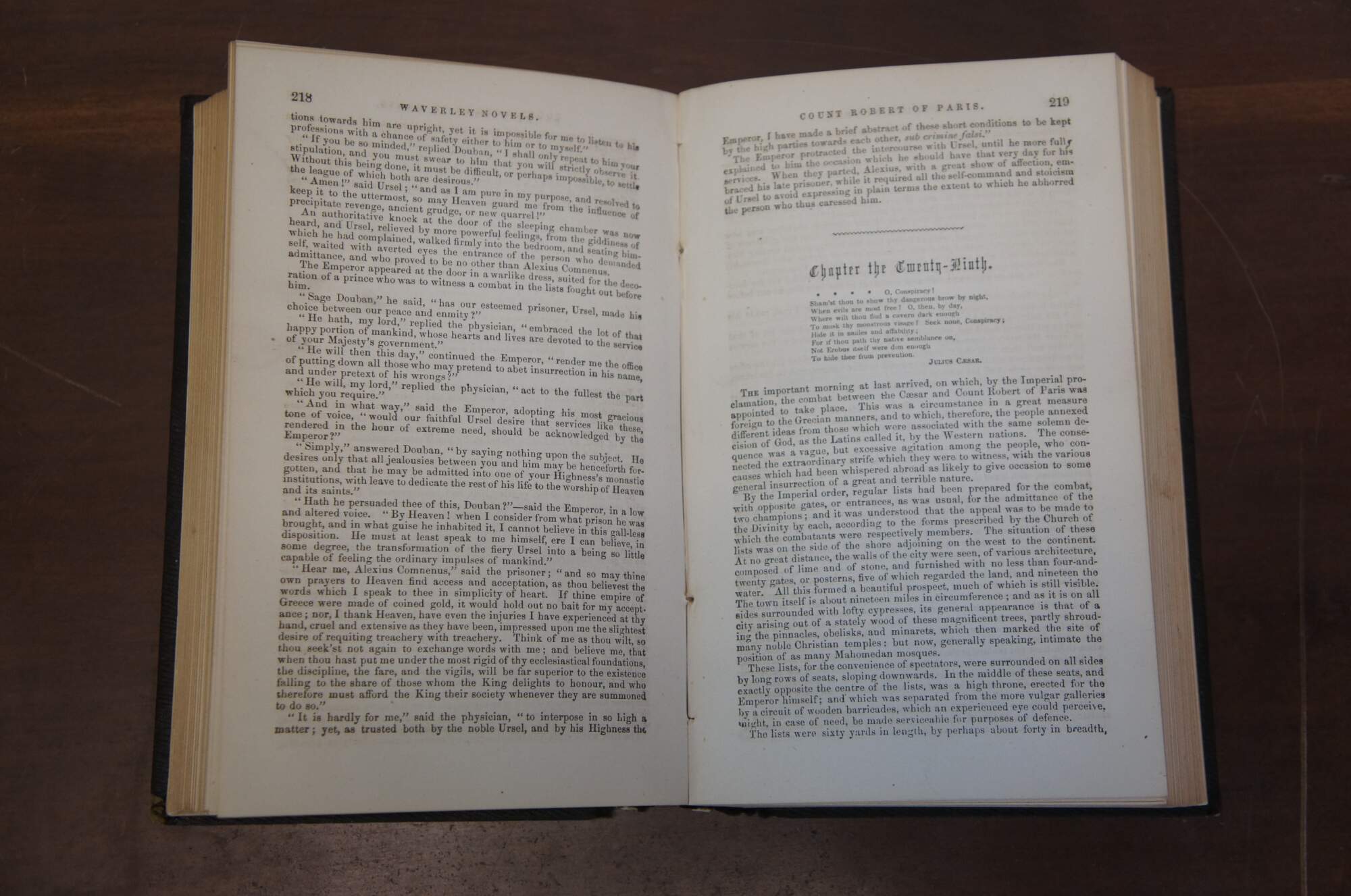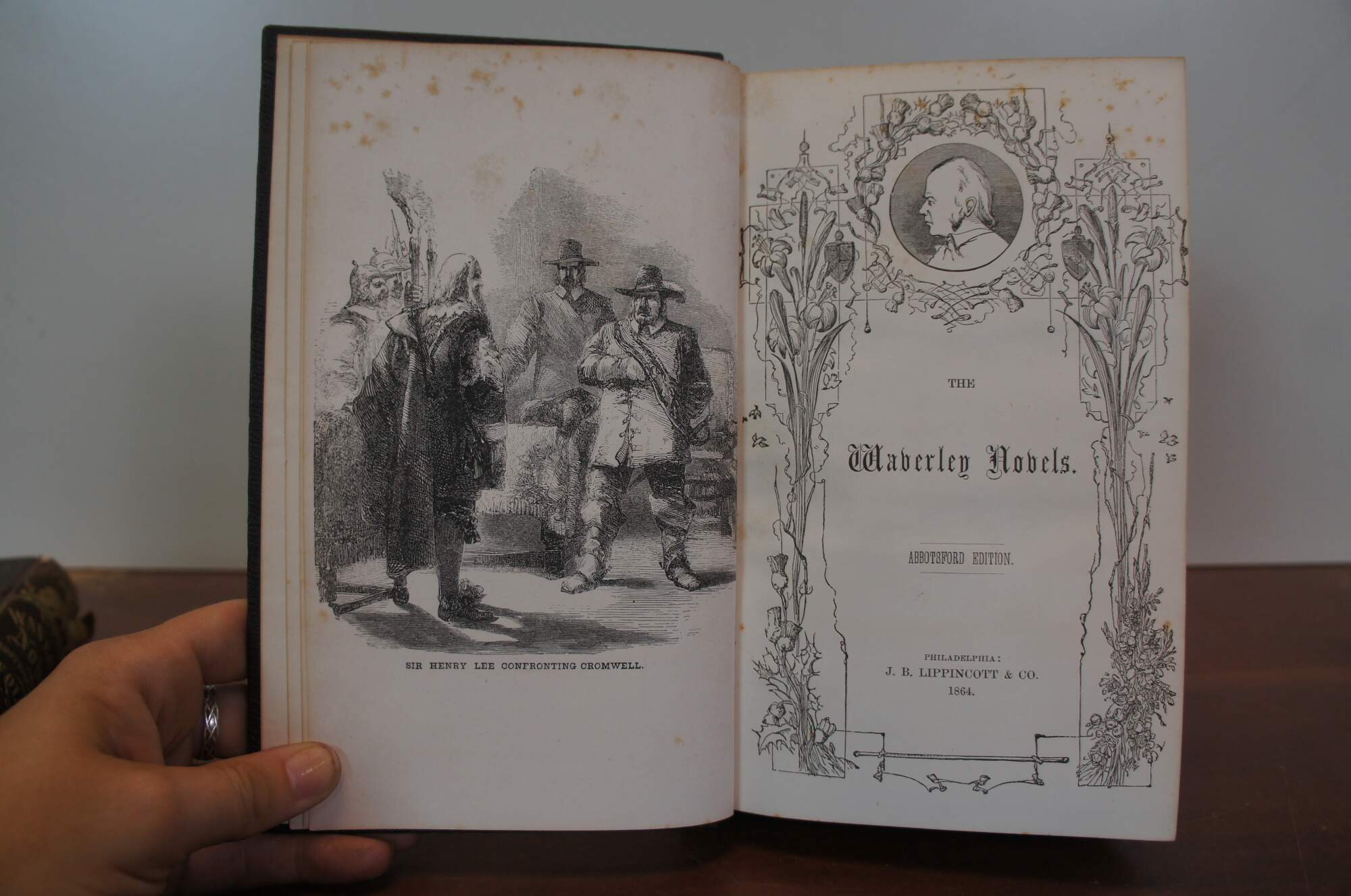 The Waverly Novels" by Sir Walter Scott - Abbotsford Edition - Vol. VIII : Quentin Durward / St. Ronan's Well - Vol X : Woodstock / Chronicles of Canongate - Vol XII : Count Robert of Paris / Castle Dangerous / My Aunt Margaret's Mirror, Etc - Published by J.B. Lippincott & Co 1864, 1865. Brown embossed leather bound with knight and horse crest, hard back / hard cover.