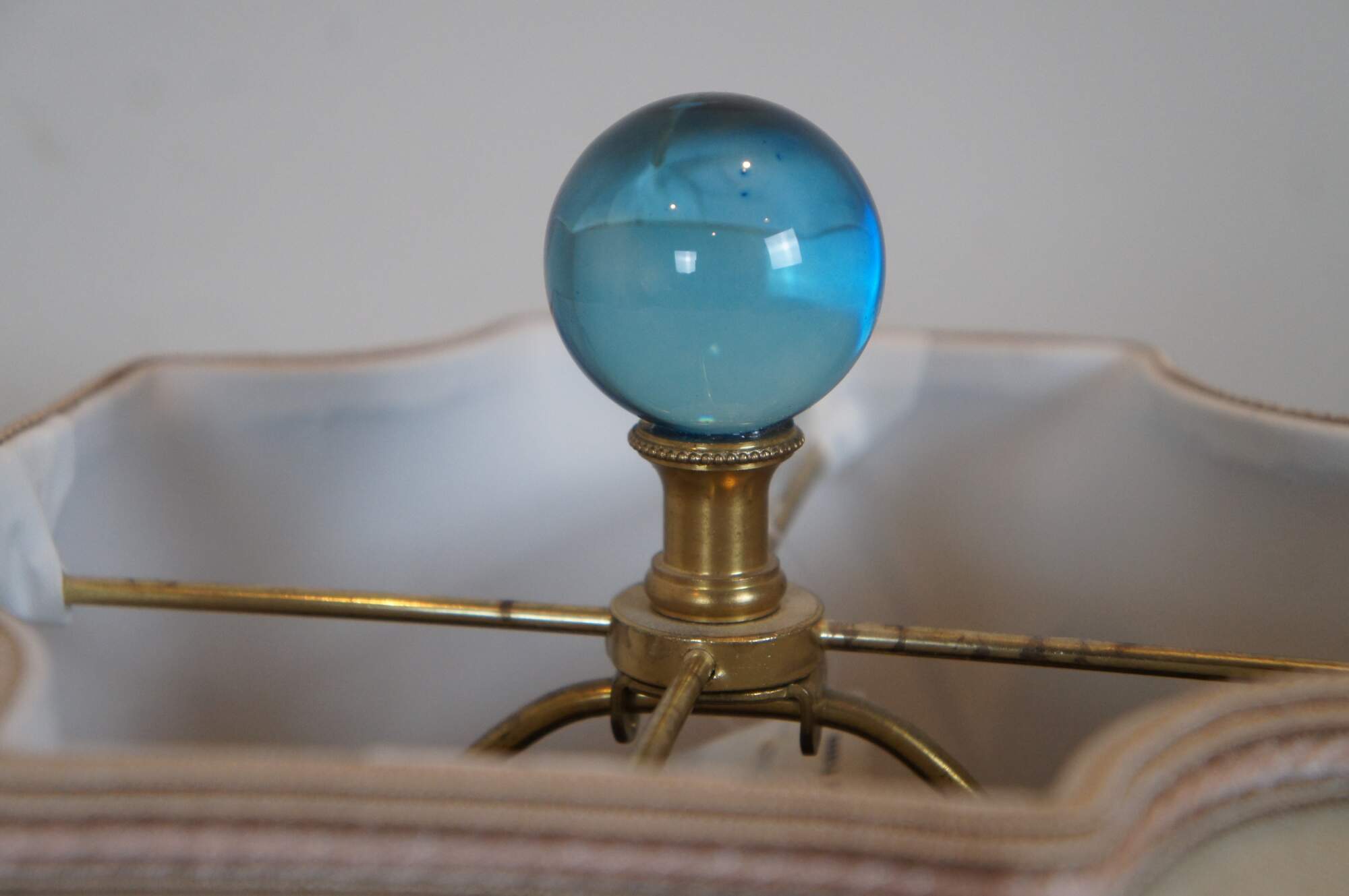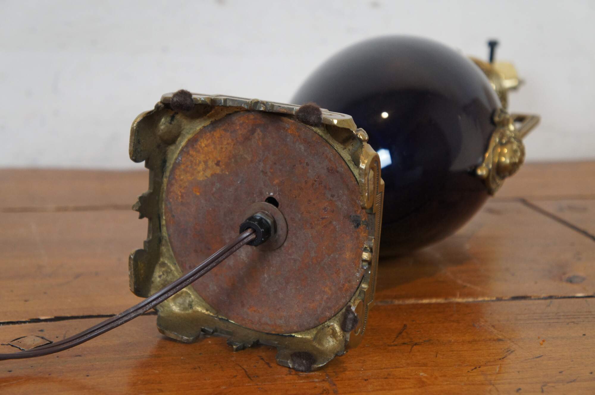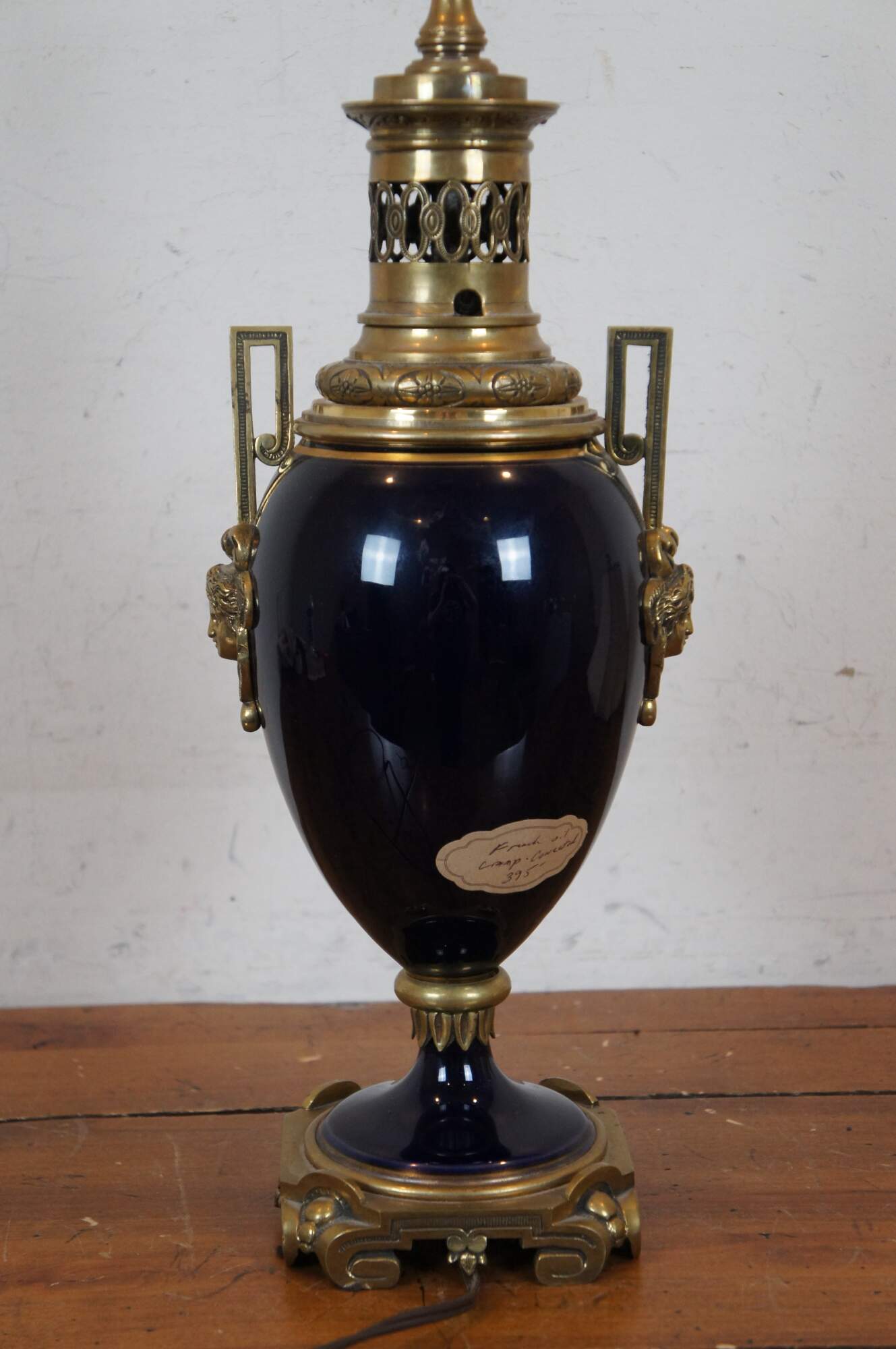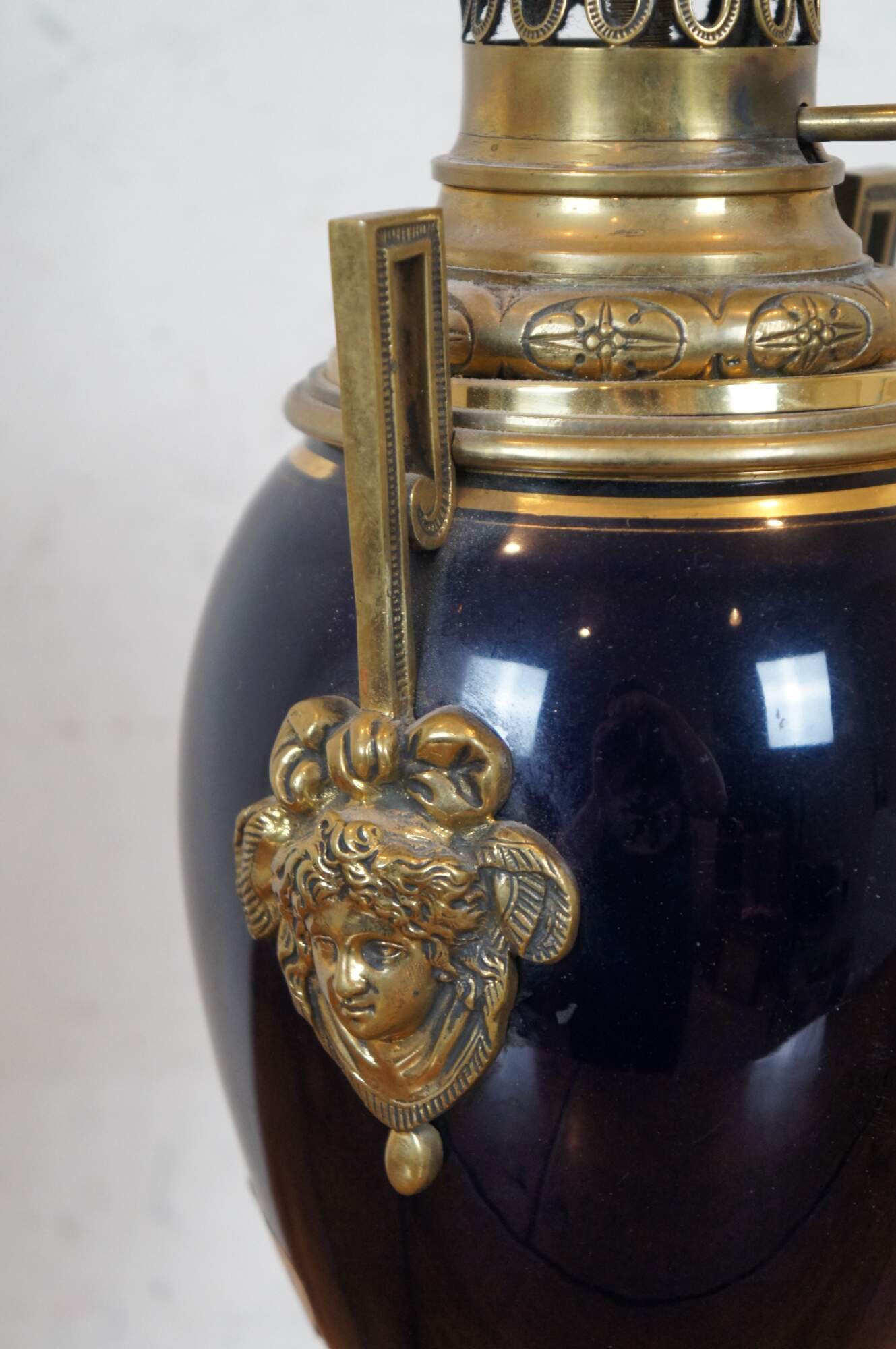 Antique French Empire Sevres style oil lamp converted to electric - deep cobalt blue glass vase / trophy / mantel urn shaped with brass base, pierced top, and handles decorated with fabric swags / bows / and faces. Includes harp, blue glass ball finial and scalloped edge bell shaped shade; beige fabric with braided trim by Allure Shades Inc.