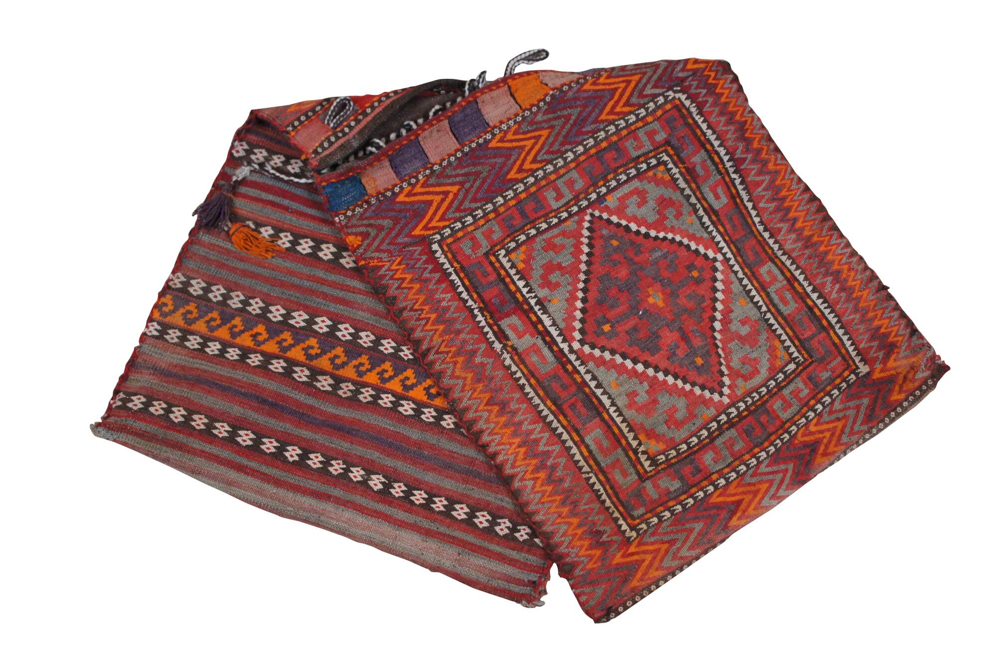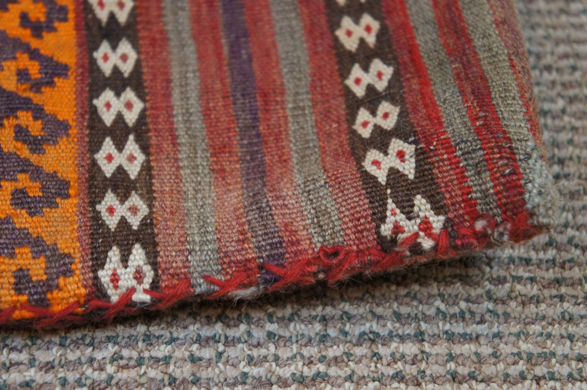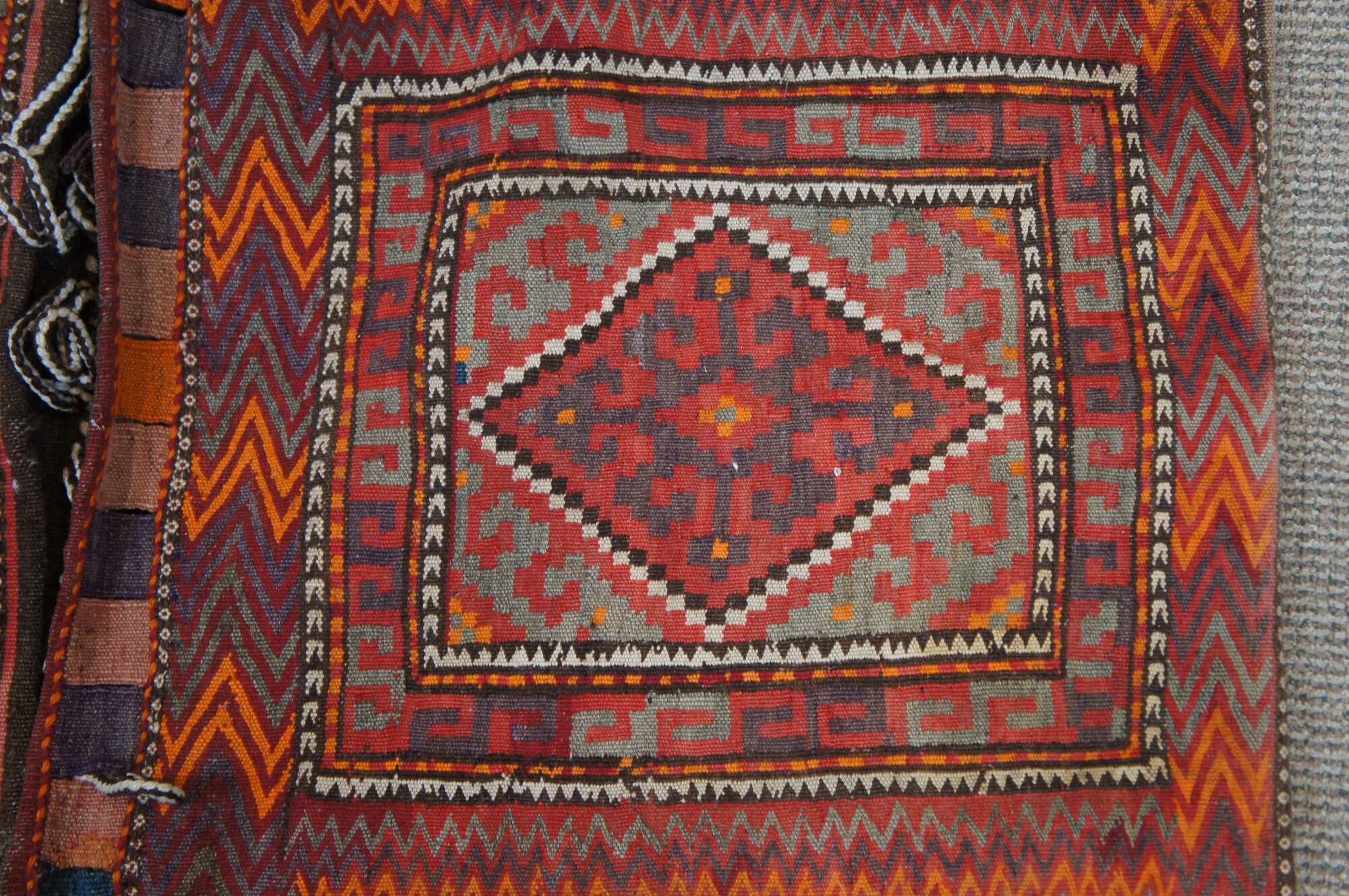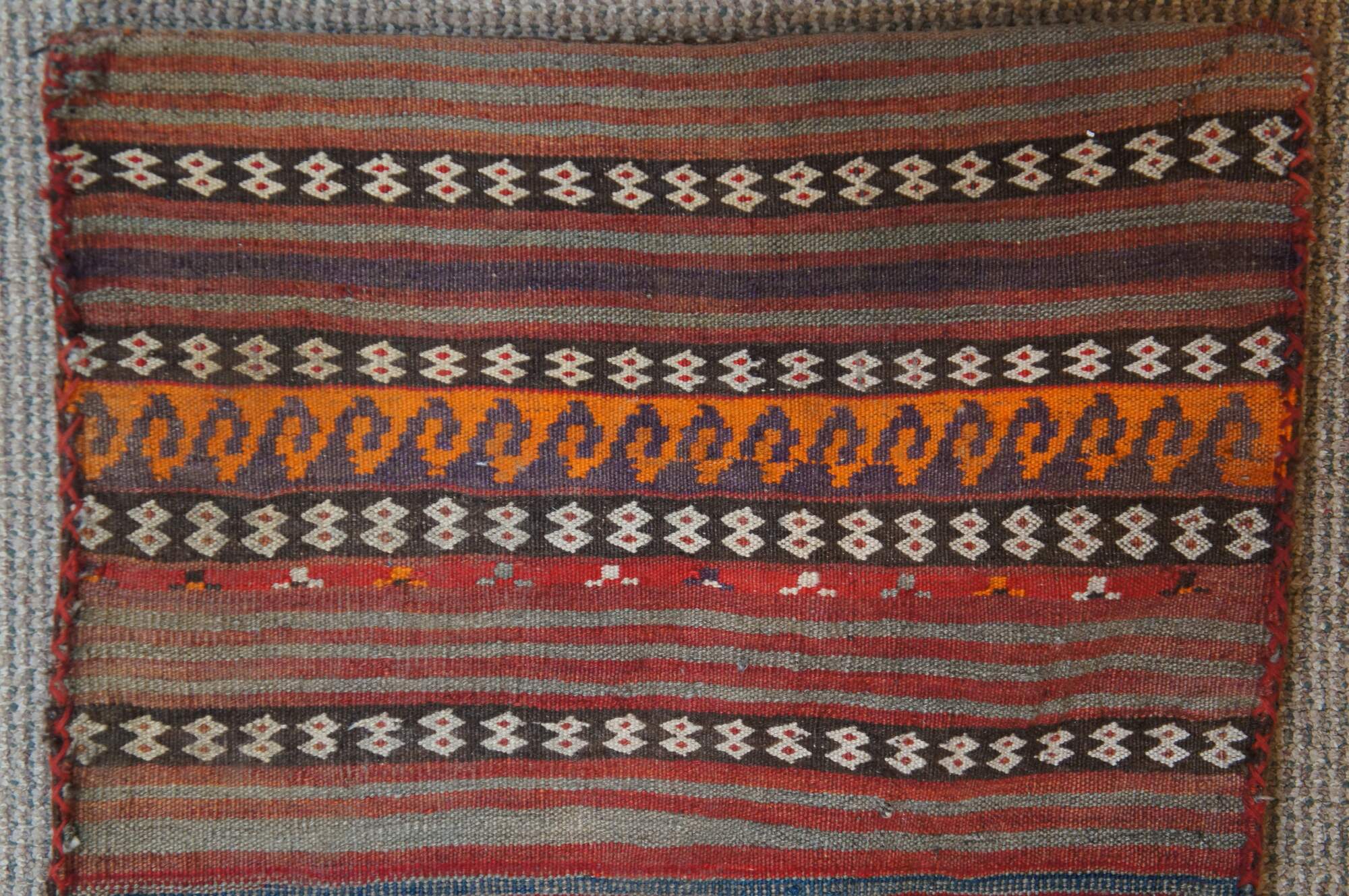 Antique Turkish / Middle Eastern wool saddle bag, woven with a red, purple, orange and gray striped motif on the back and a geometric kilim tapestry rug design of diamonds, chevrons and Greek key-like meanders on the front. Structured with two large pockets on either side and a flat section in the middle.