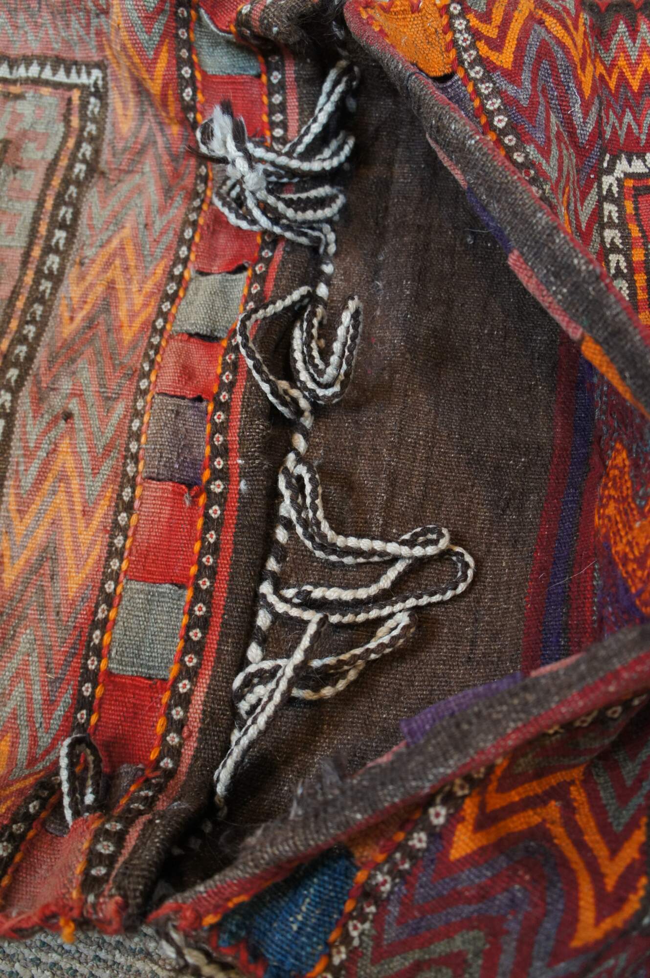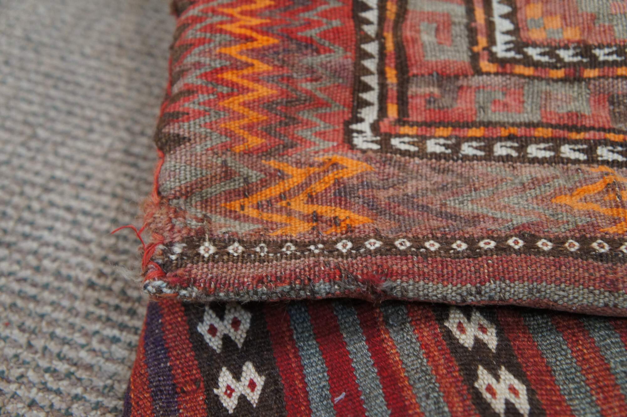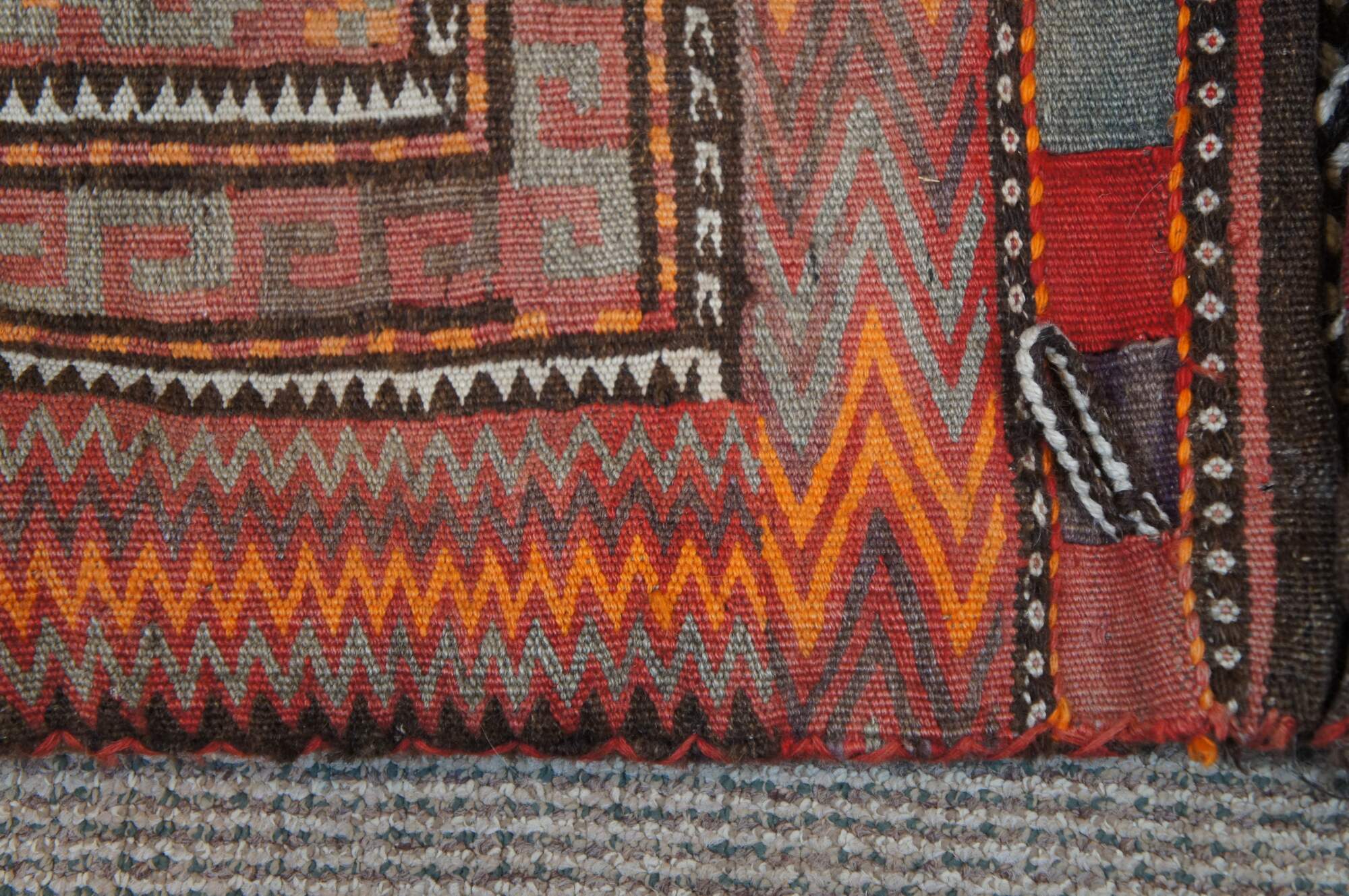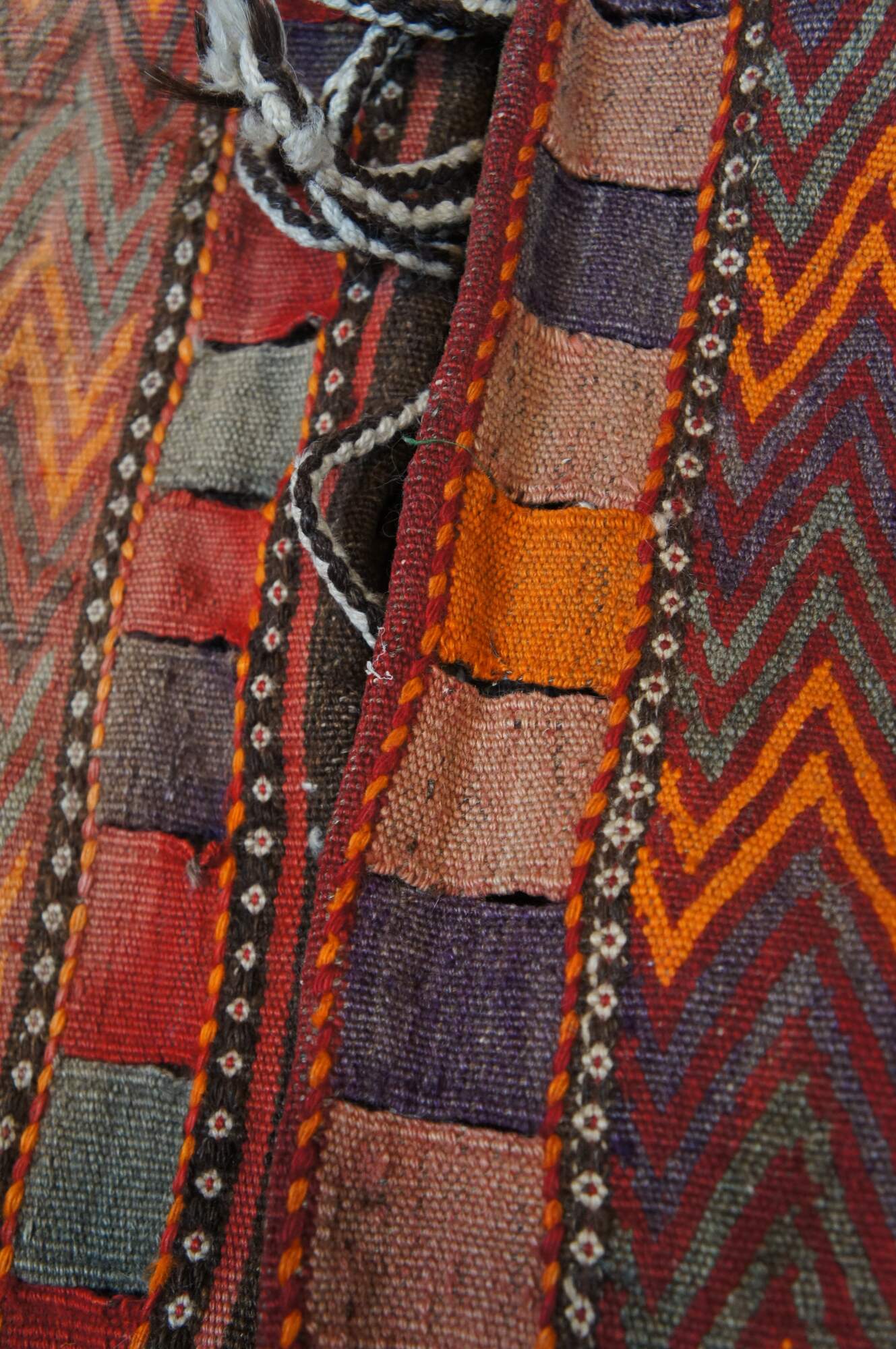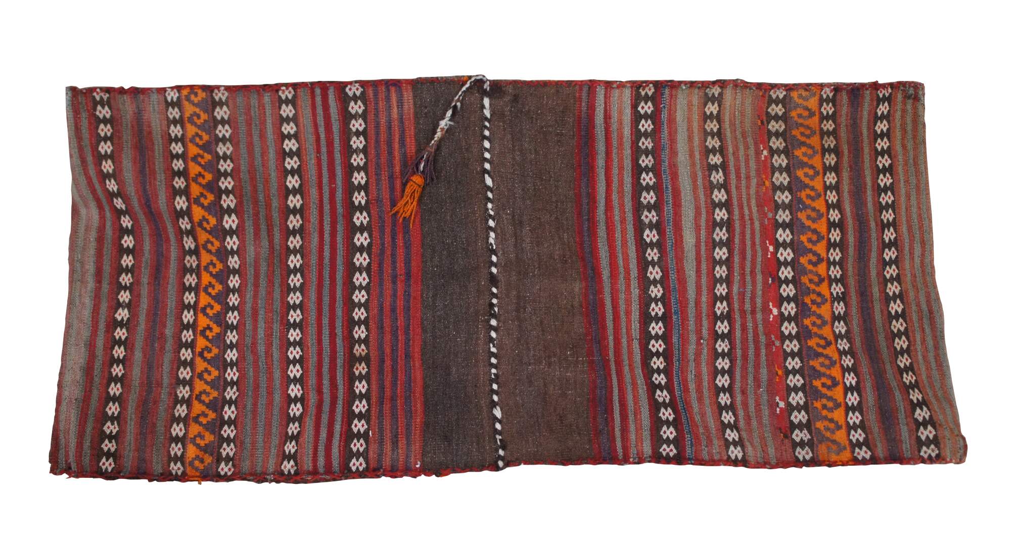 Antique Turkish / Middle Eastern wool saddle bag, woven with a red, purple, orange and gray striped motif on the back and a geometric kilim tapestry rug design of diamonds, chevrons and Greek key-like meanders on the front. Structured with two large pockets on either side and a flat section in the middle.