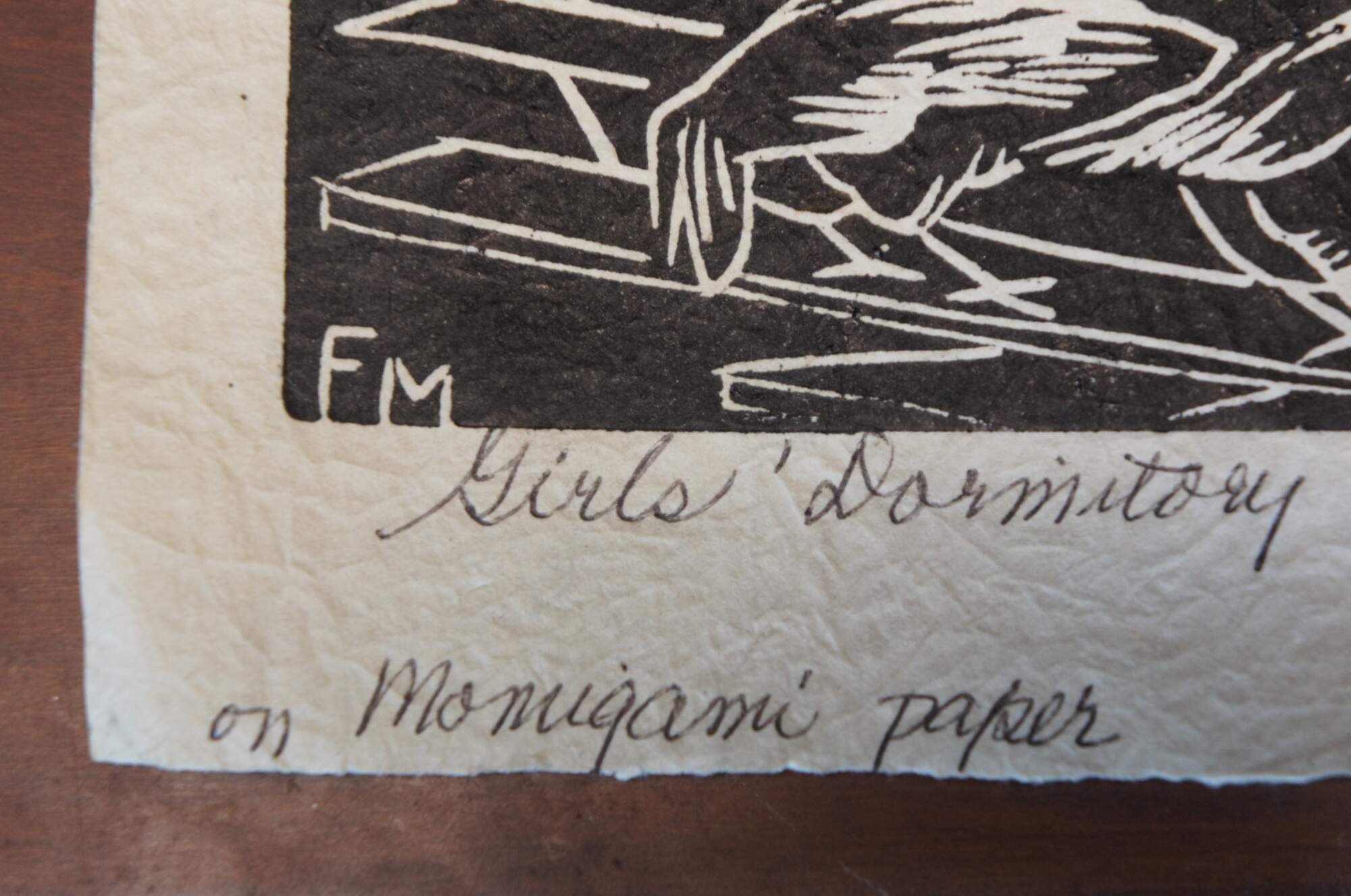 Mid 20th century folk art woodblock print titled "Girls' Dormitory," depicting a flock of chickens at their nesting boxes and feeding trough in a coop. Black ink on Momigami paper. Titled and signed by Fannie Mennen.