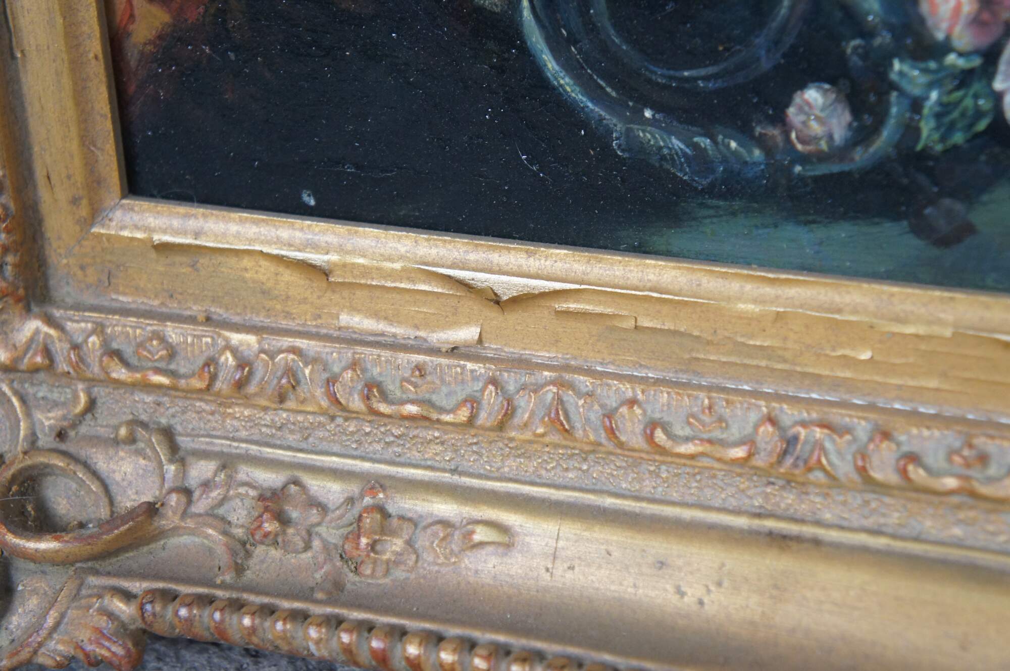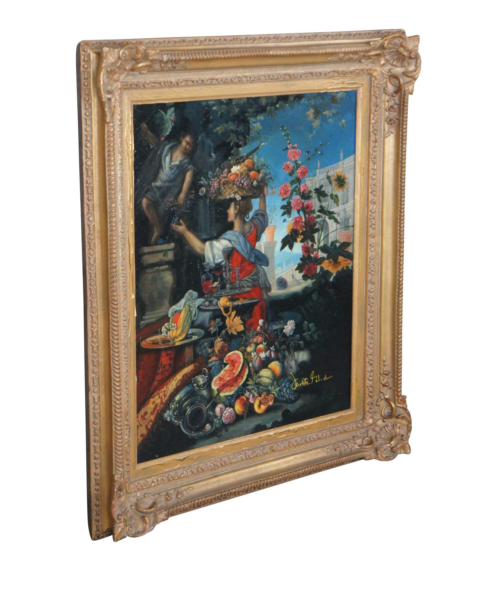 Flowers, Fruit with a Woman Picking Grapes, After Christian Berentz. The reproduction painting is on a naturally aged canvas and signed lower right. Framed in baroque manner with scalloped corners