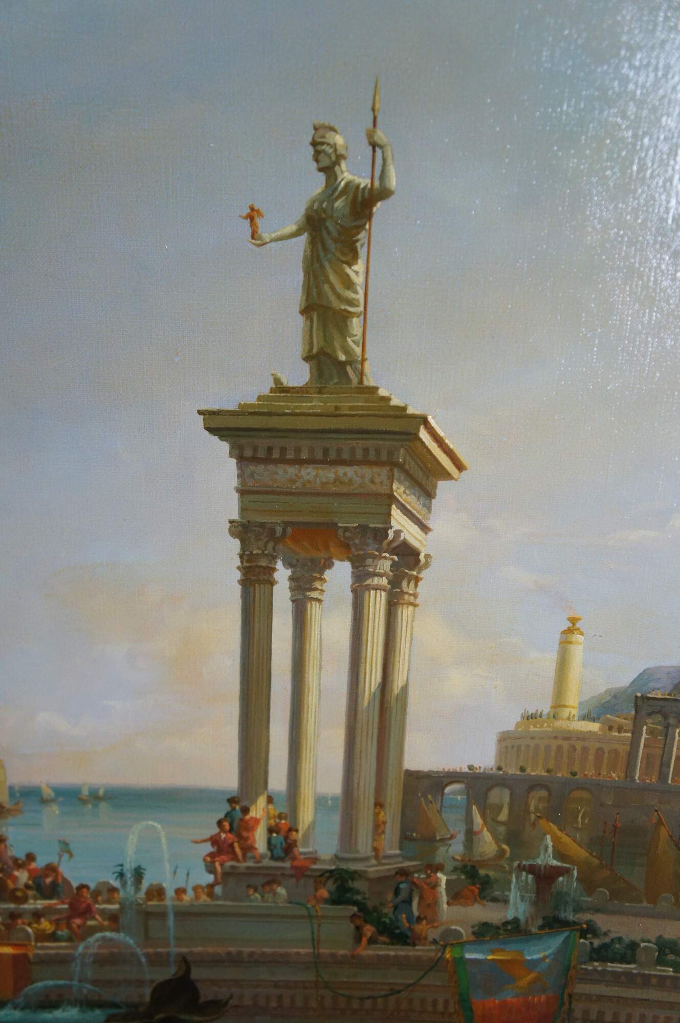 A large reproduction oil painting of Thomas Cole's The Course of Empire The Consummation of Empire. Features a Romanesque cityscape in its completed phase with celabrations taking place. Features vibrant color, animals, boats, figures and beautiful archictecture. Framed in wood with Baroque styling finished in gold.