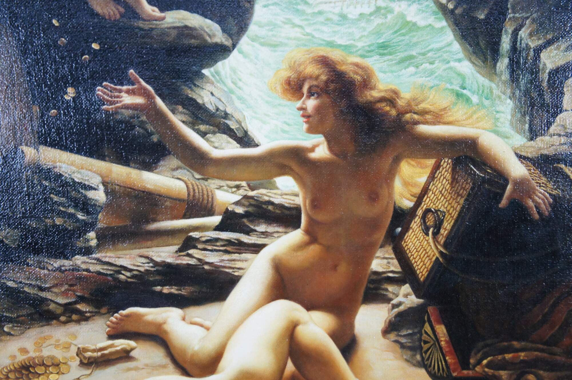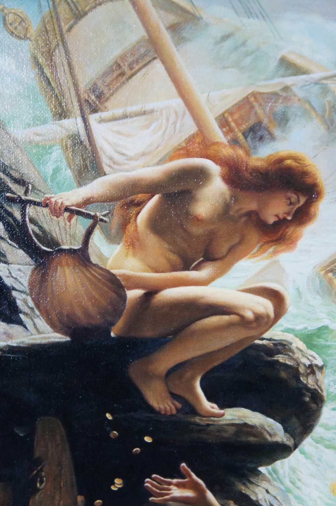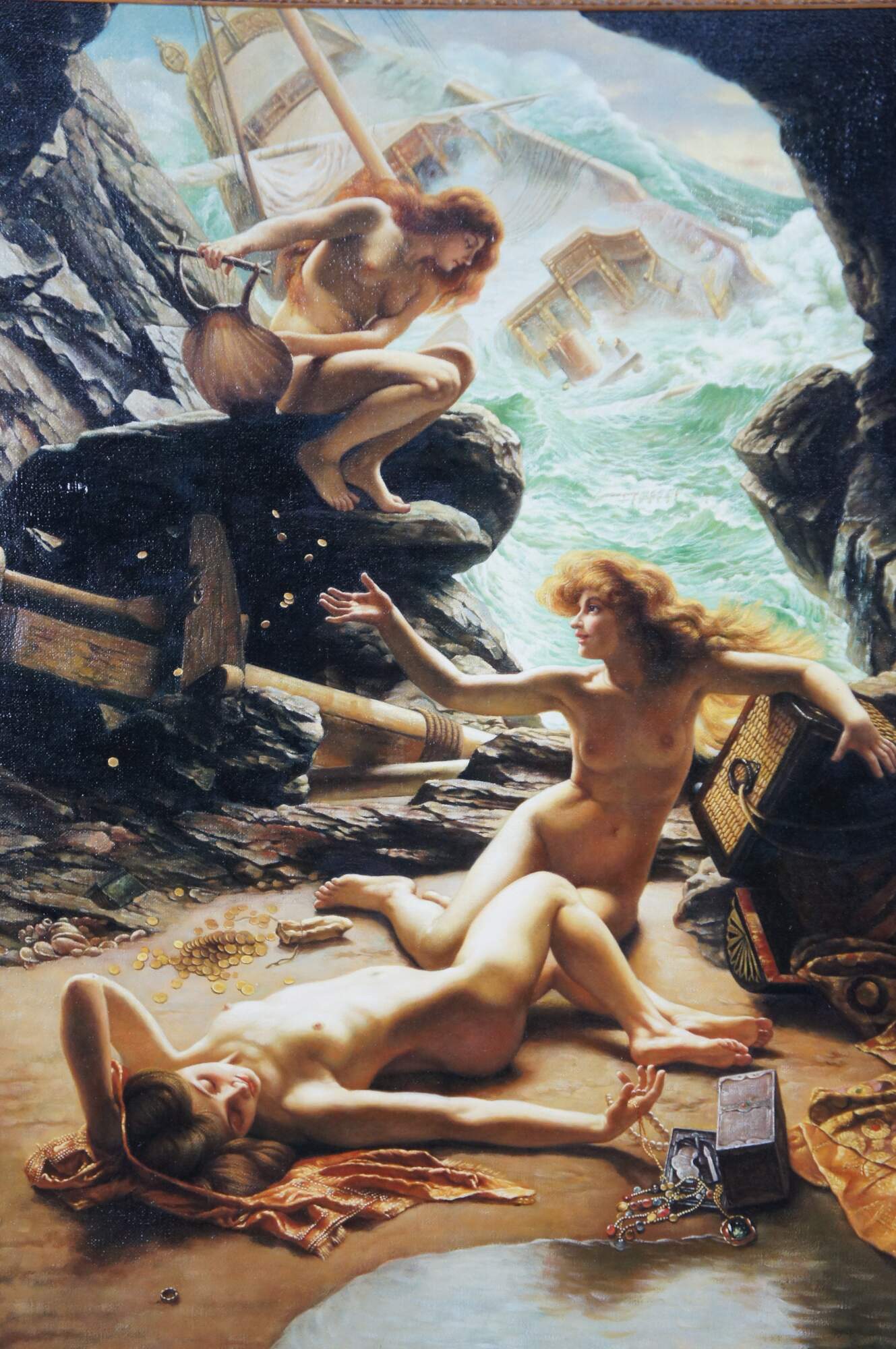 The Cave of the Storm Nymphs is a painting by British artist Edward Poynter, depicting three nude sirens or nymphs from Greek mythology that lure sailors to their deaths. Poynter painted two versions, one in 1902 and the other in 1903, with minor differences. The former is housed in the Norfolk, Virginia Hermitage Museum, and the latter is in the private collection of Sir Andrew Lloyd Webber. One of the depicted sirens is playing a golden stringed, scallop-shell lyre, while the other two sirens rejoice amid the foundering ship, expecting to add to the cave’s treasure.