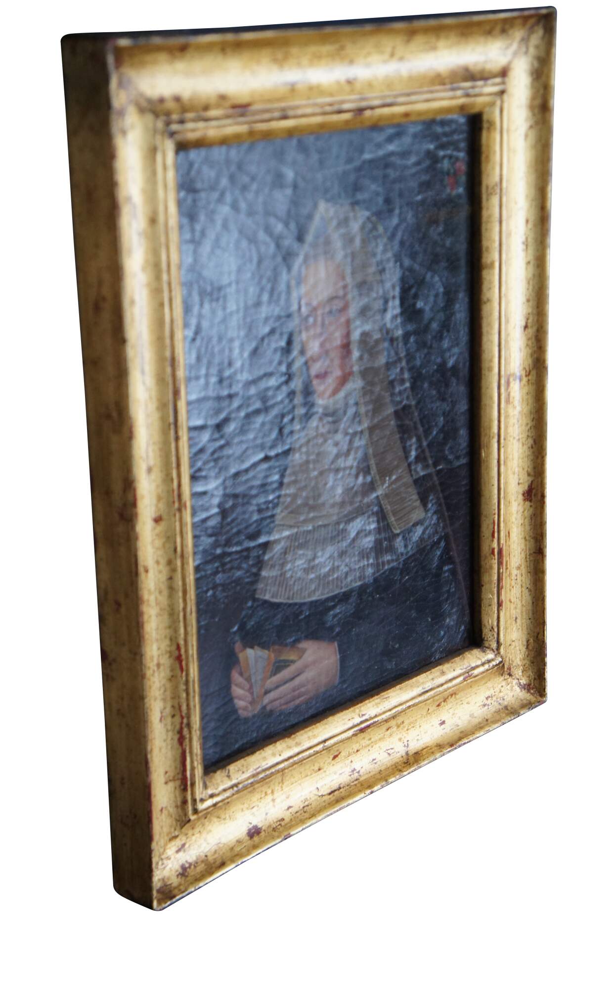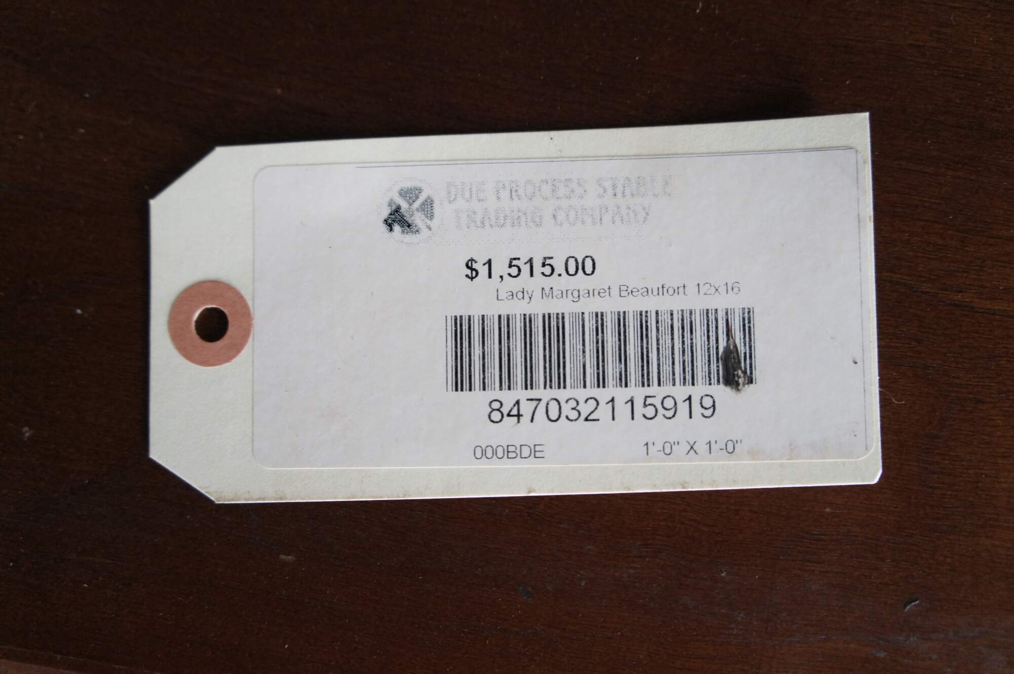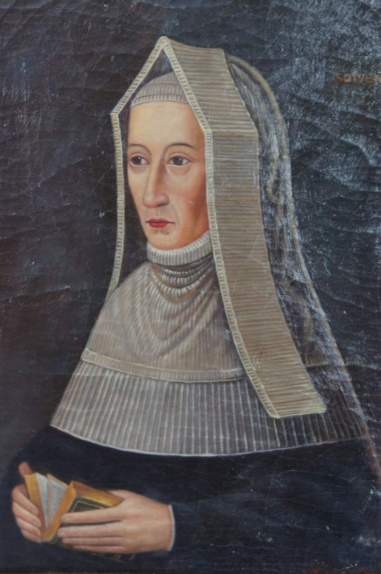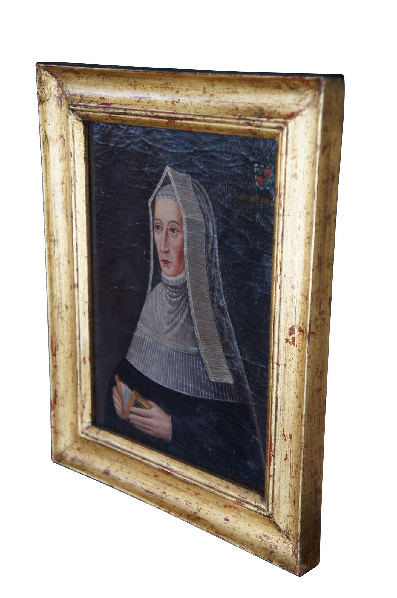 An oil painting of Lady Margaret Beaufort Countess of Richmond and Derby by Trevor James Company. The original painting is from the late 17th cetnury and in a private collection in London.