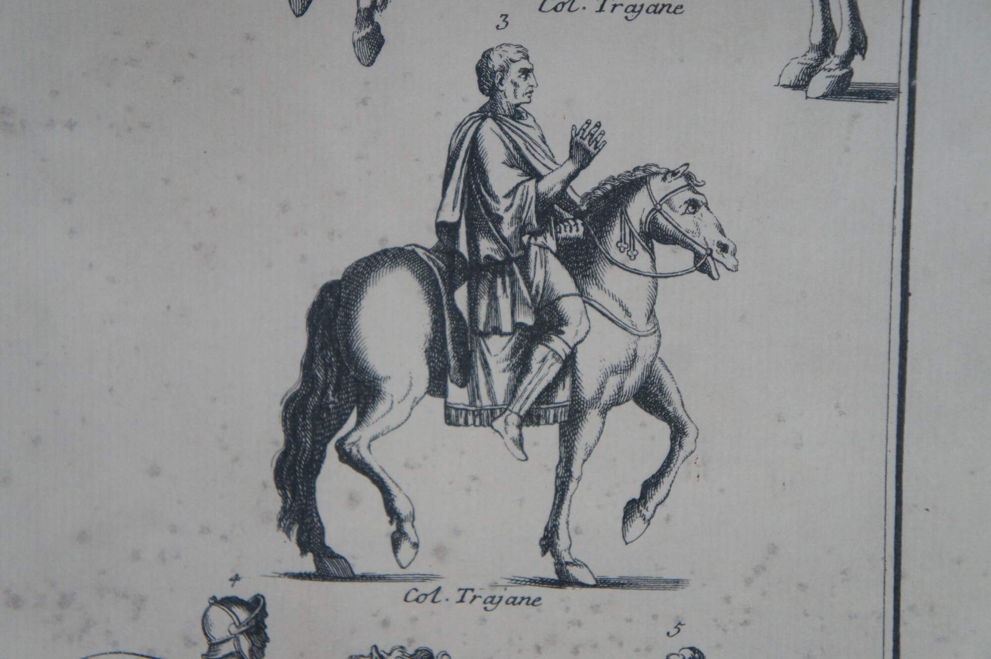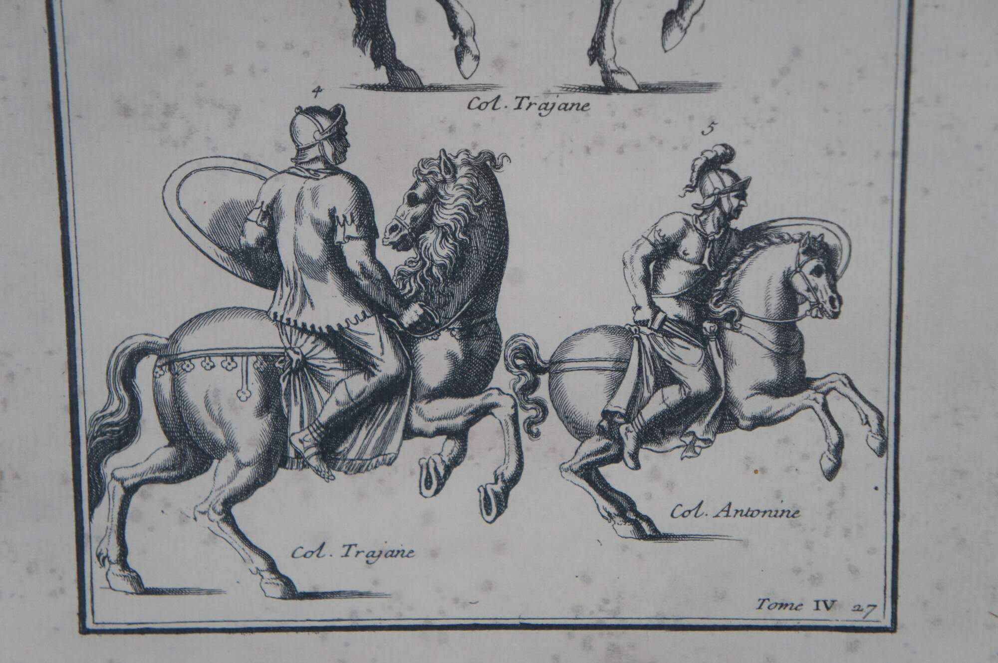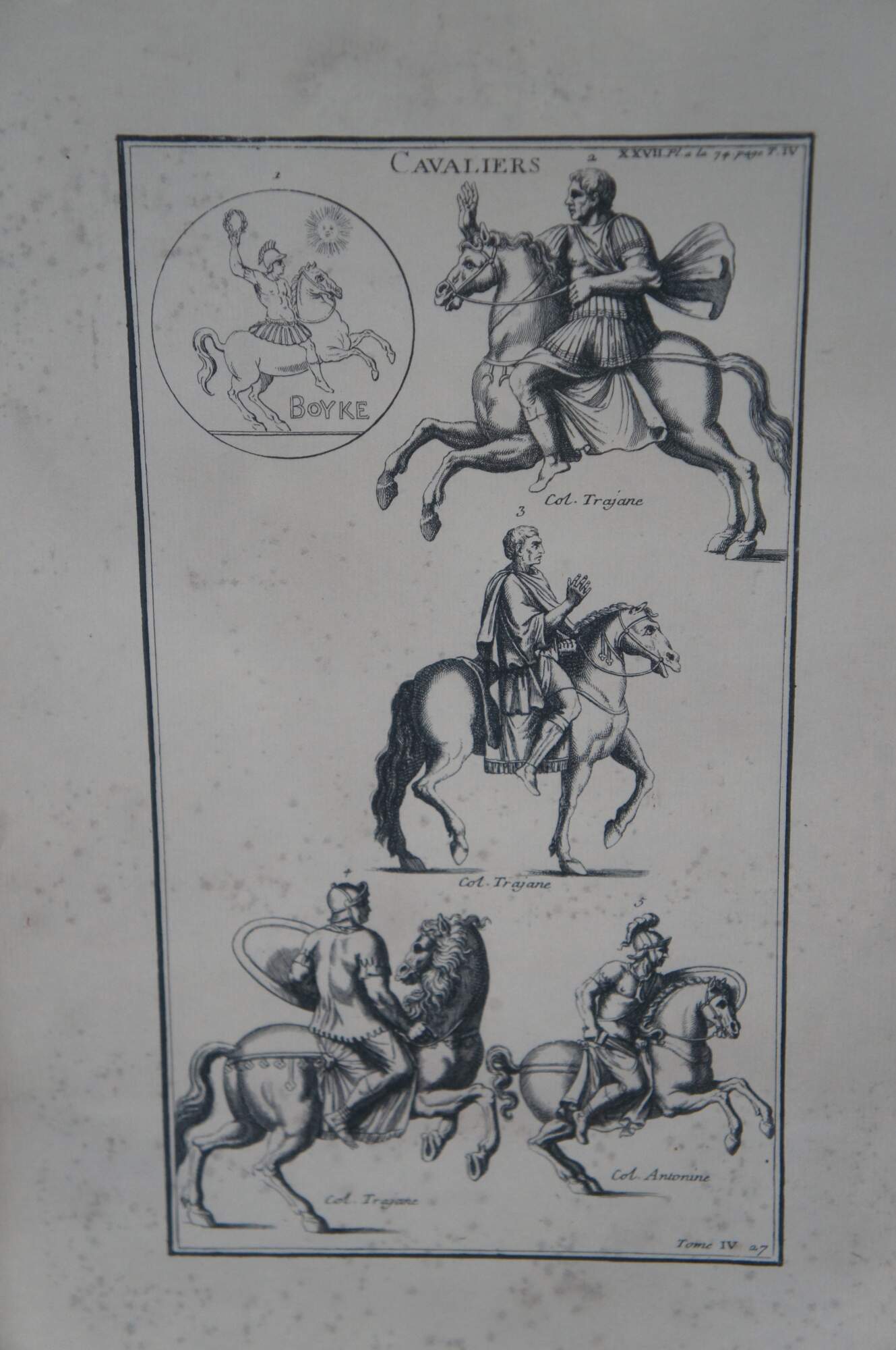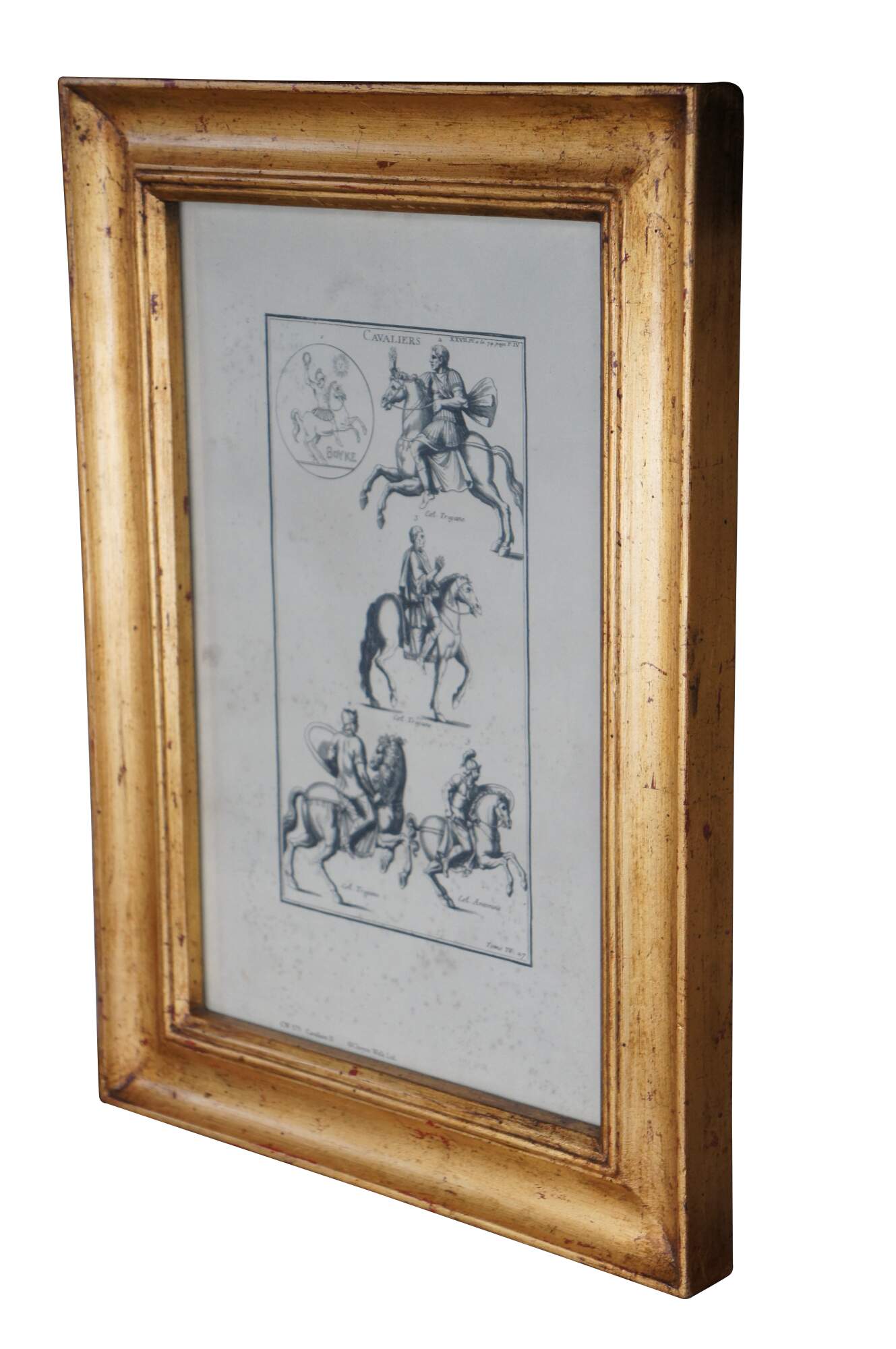 Cavaliers II antiqued print by Trevor James Company. Features a sequence of Roman men on horses. Framed in a beveled wood with a golf finish
