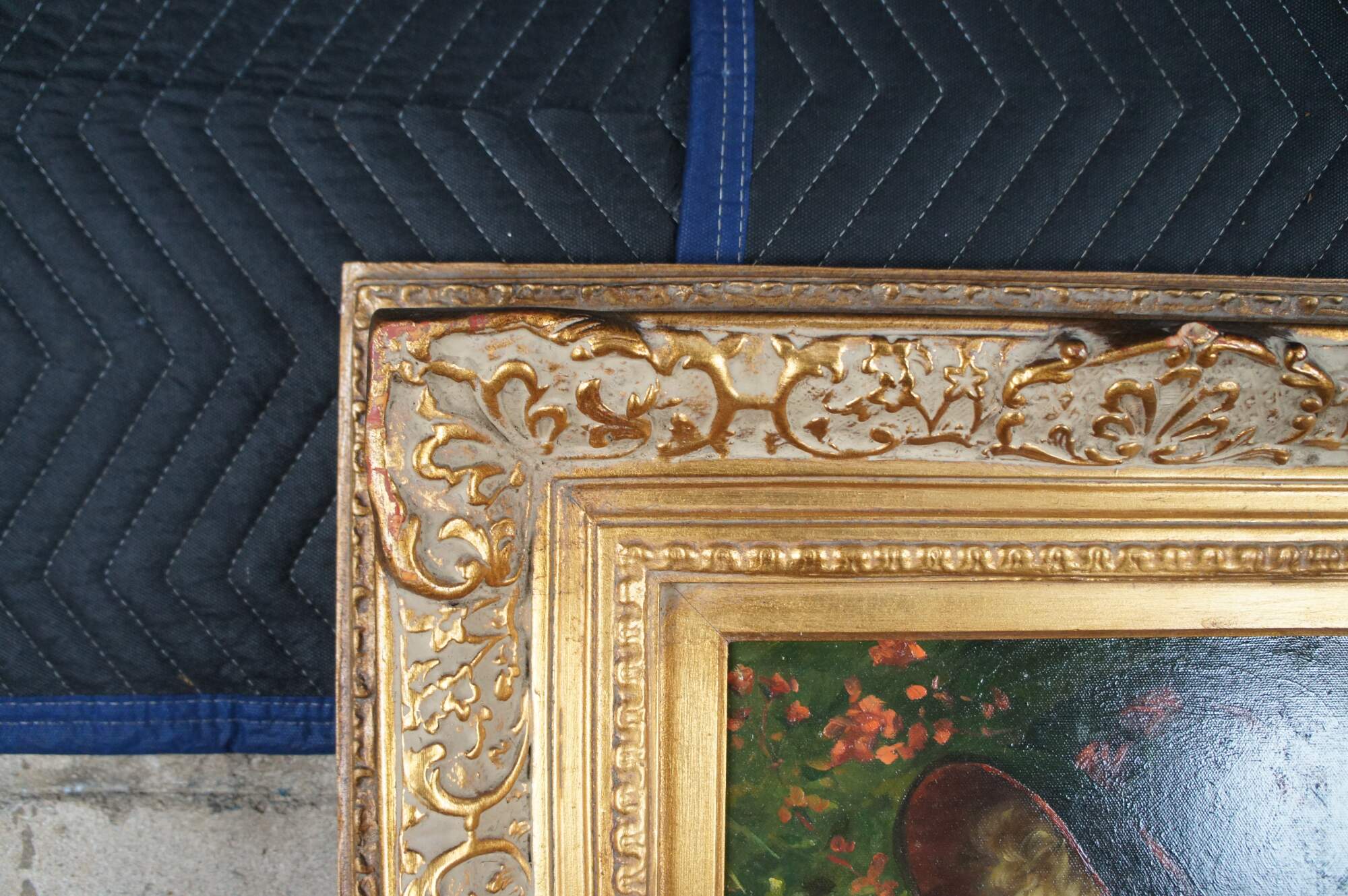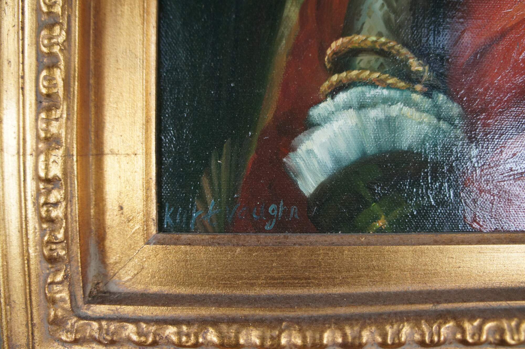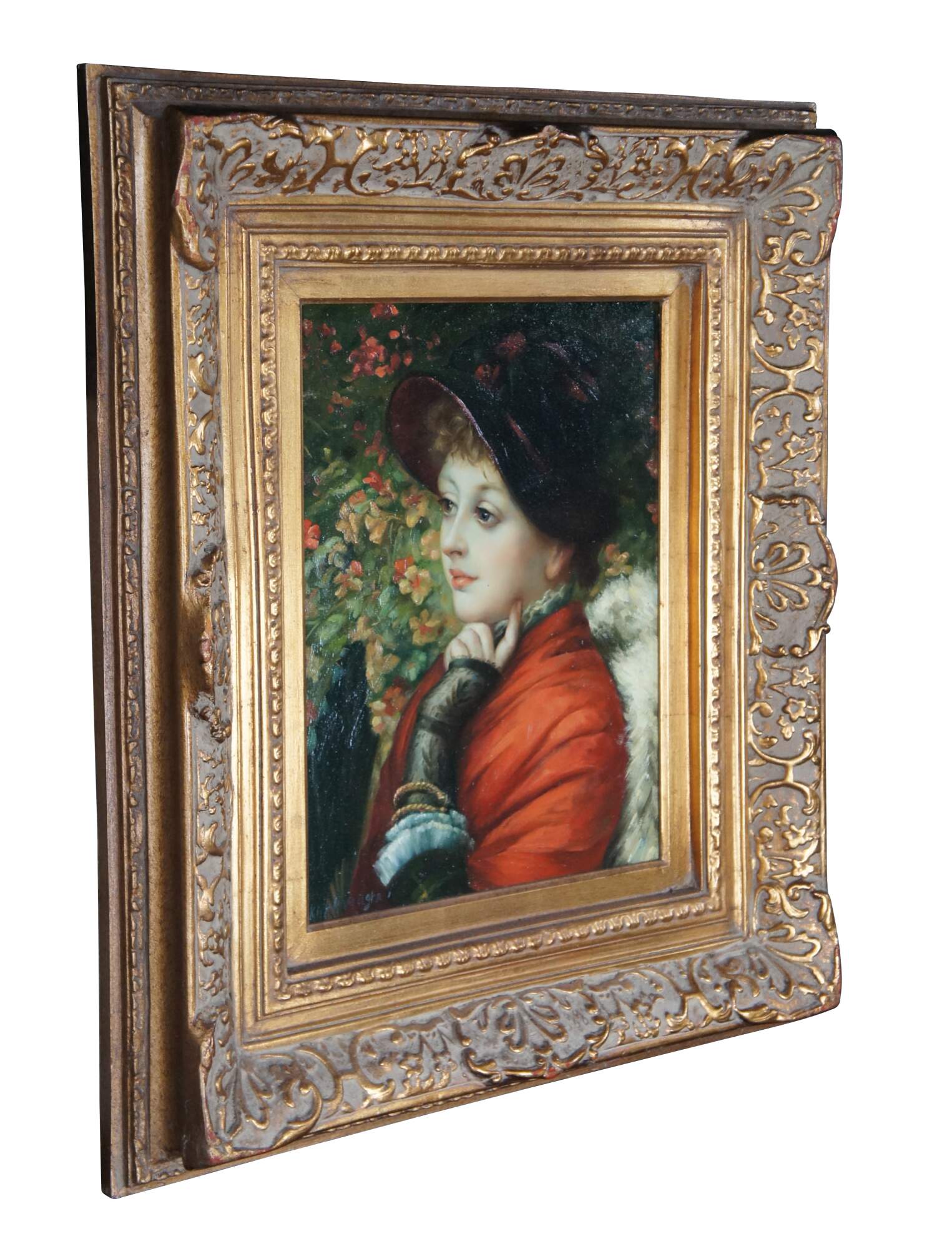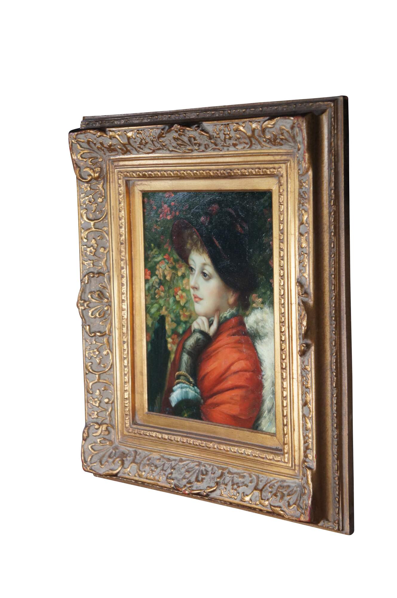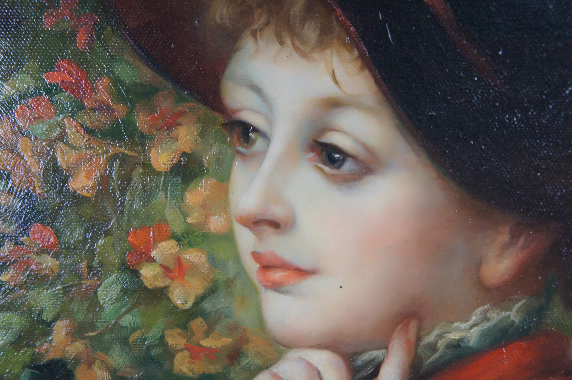 A beautiful late 20th Century Oil Painting of Mrs Kathleen Newton, after James Tissot. Signed lower left by Kurt Vaughn. The oil painting elegantly displays the French Aristrocrat dressed in red in front of flowers resting her hand against her chin. Framed in wood with gold finish in Baroque manner.