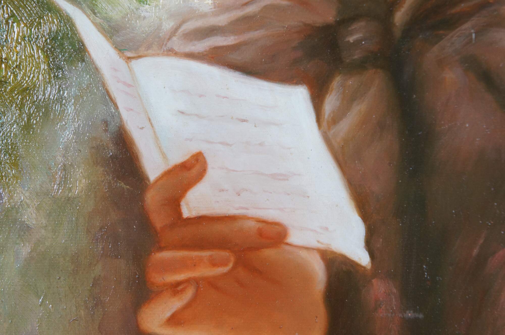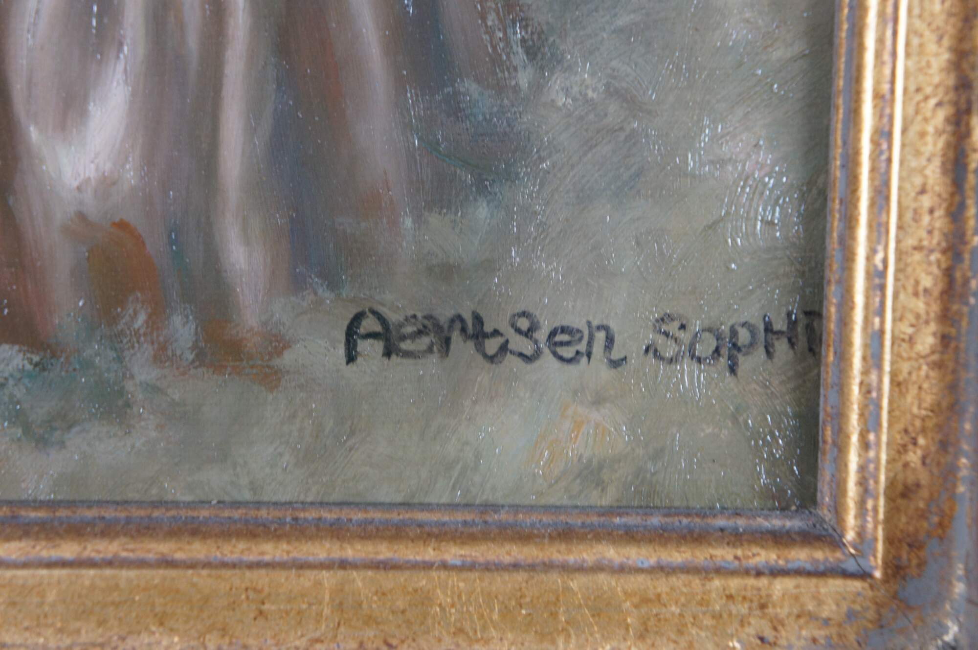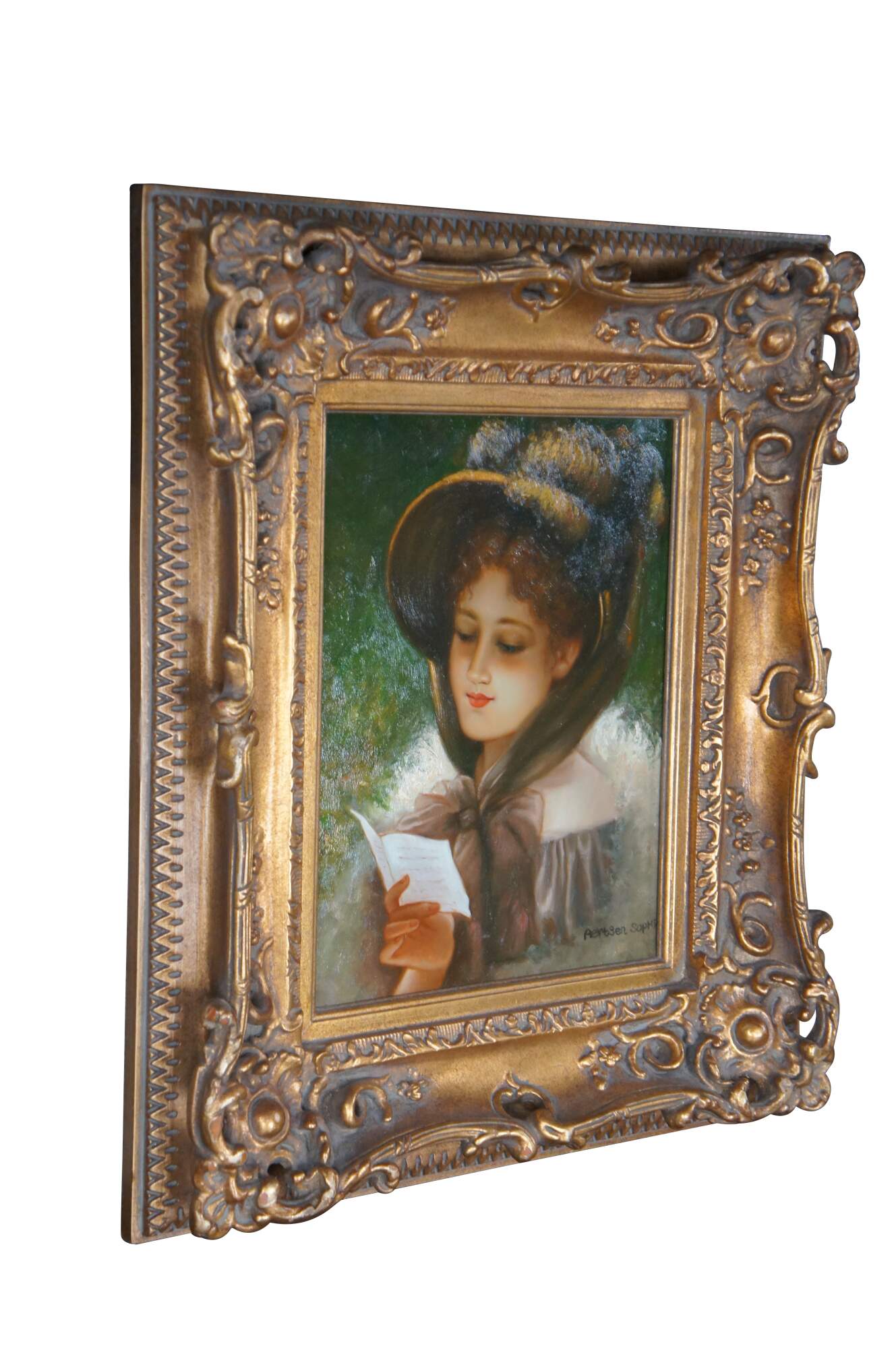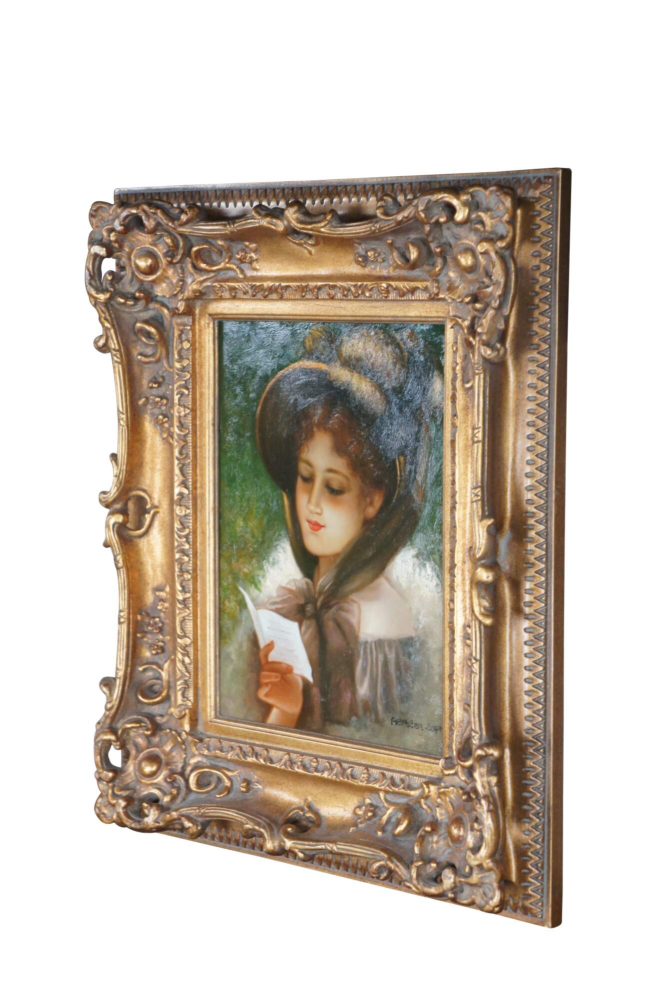 Late 20th Century Portrait After Pieter Aertsen, aptly titled Sophie. Features a young woman with bonnet and letter in hand. Framed in wood, French Style with a gold finish The oil painting is on canvas and signed lower right.