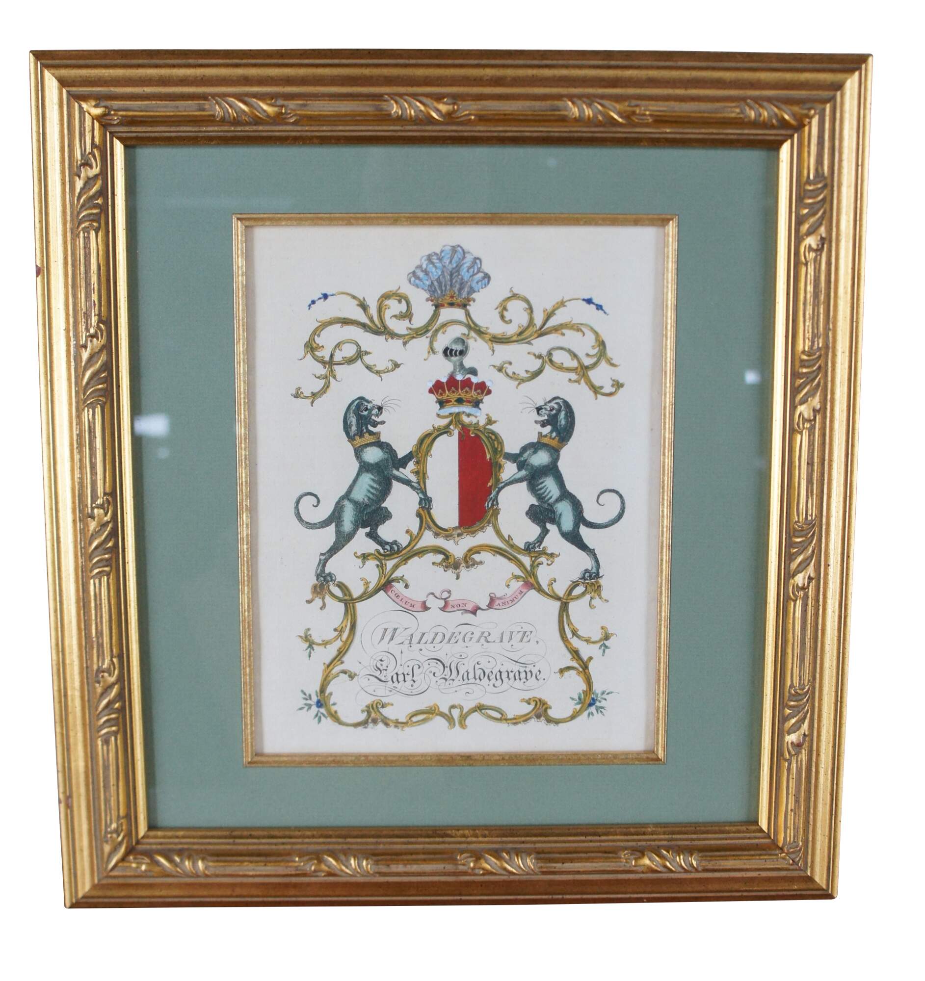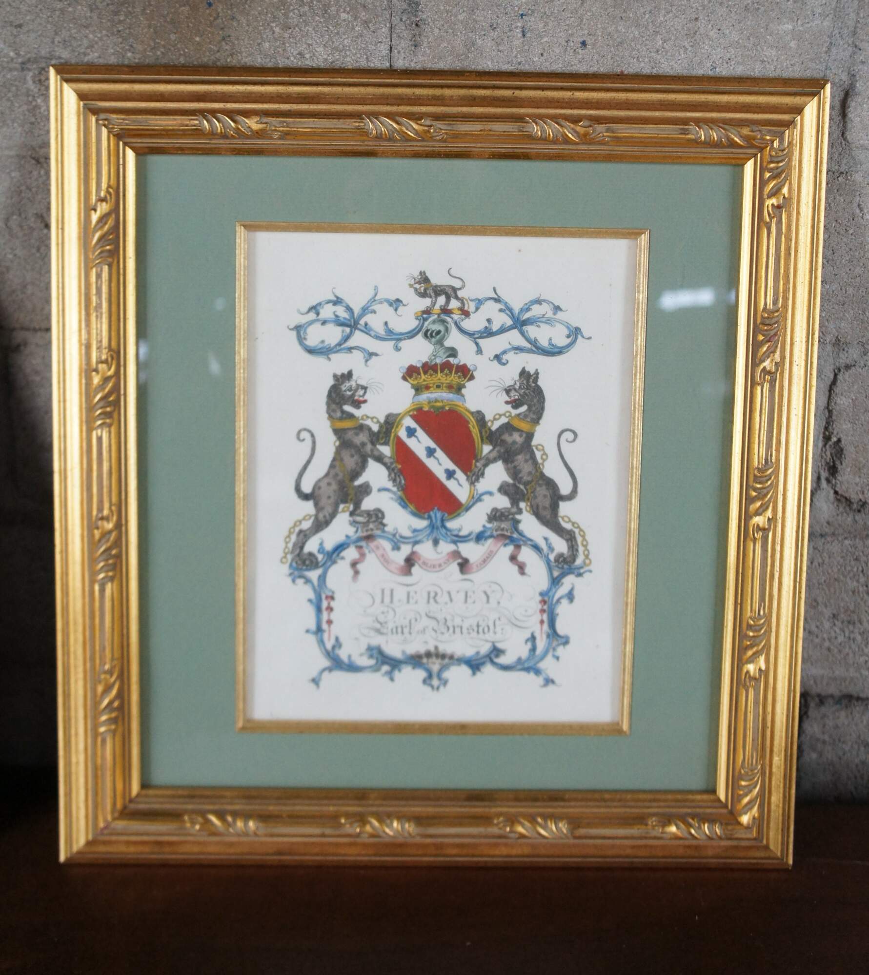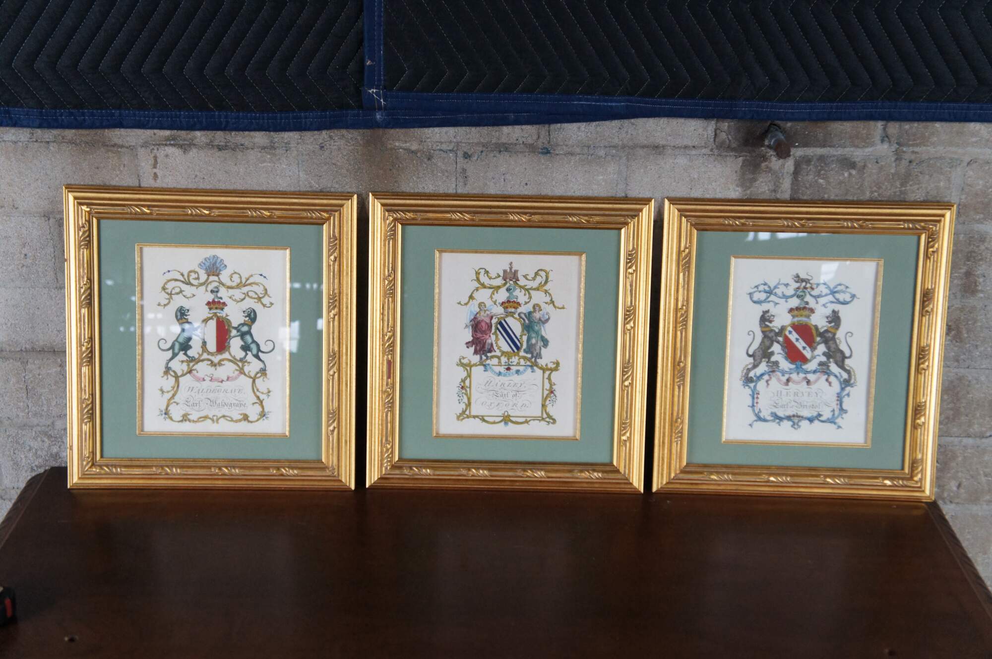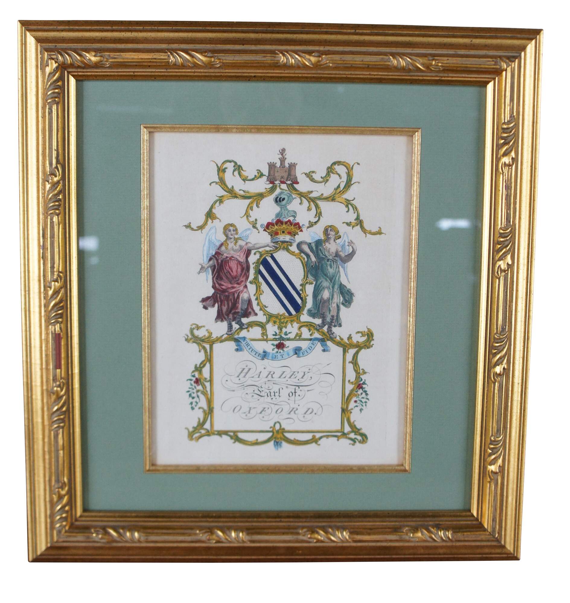 Set of three Armorial Colored Engravings. Each showcases a different family crest / coat of Arms. Features Harley Earl of Oxford, Wal of Waldegrave Earl of Waldegrave and Hervey Earl of Bristol. Each engraving is ornately framed with a Green Mat and Gold Finish.
