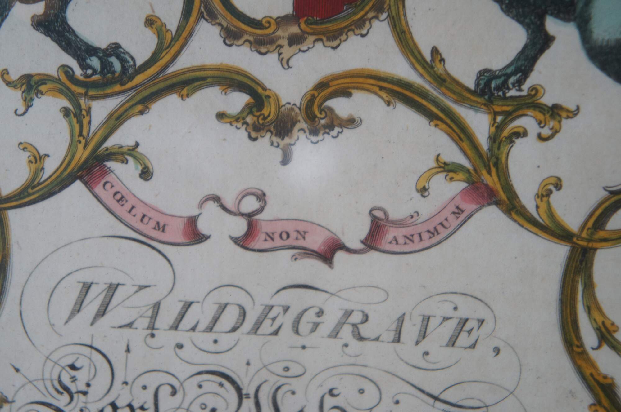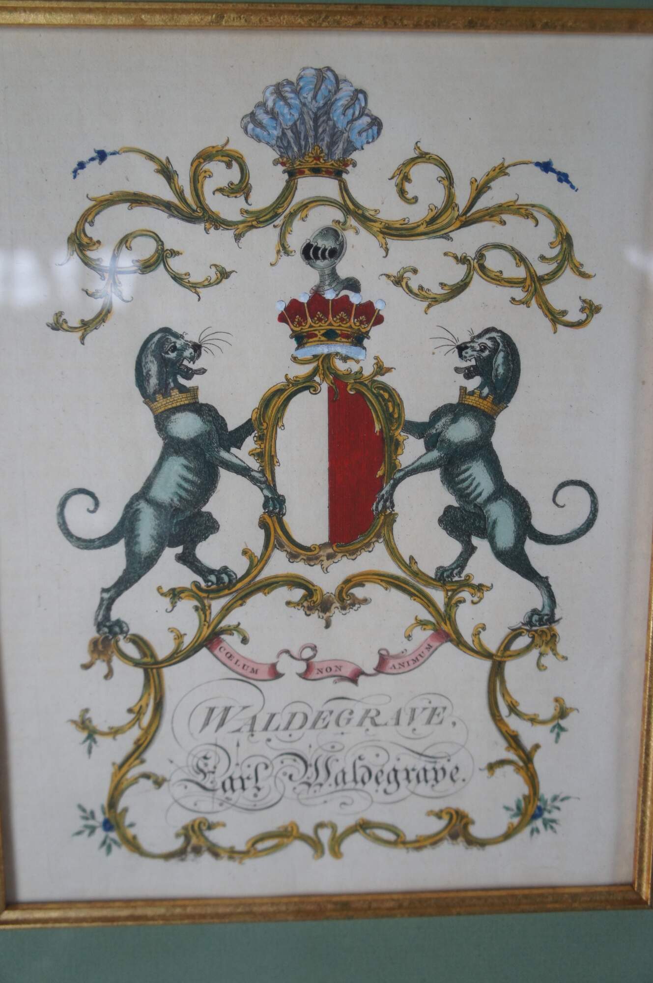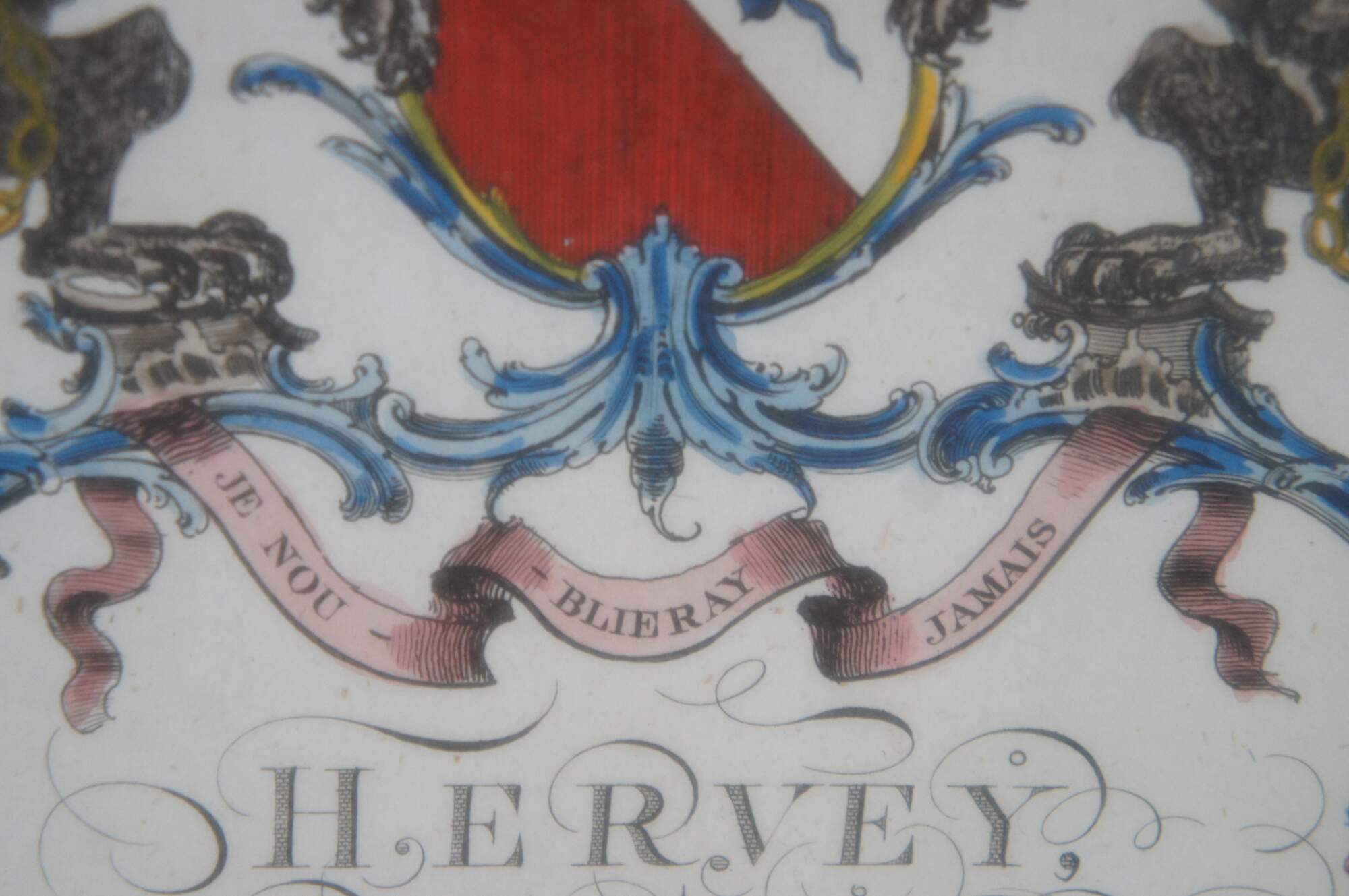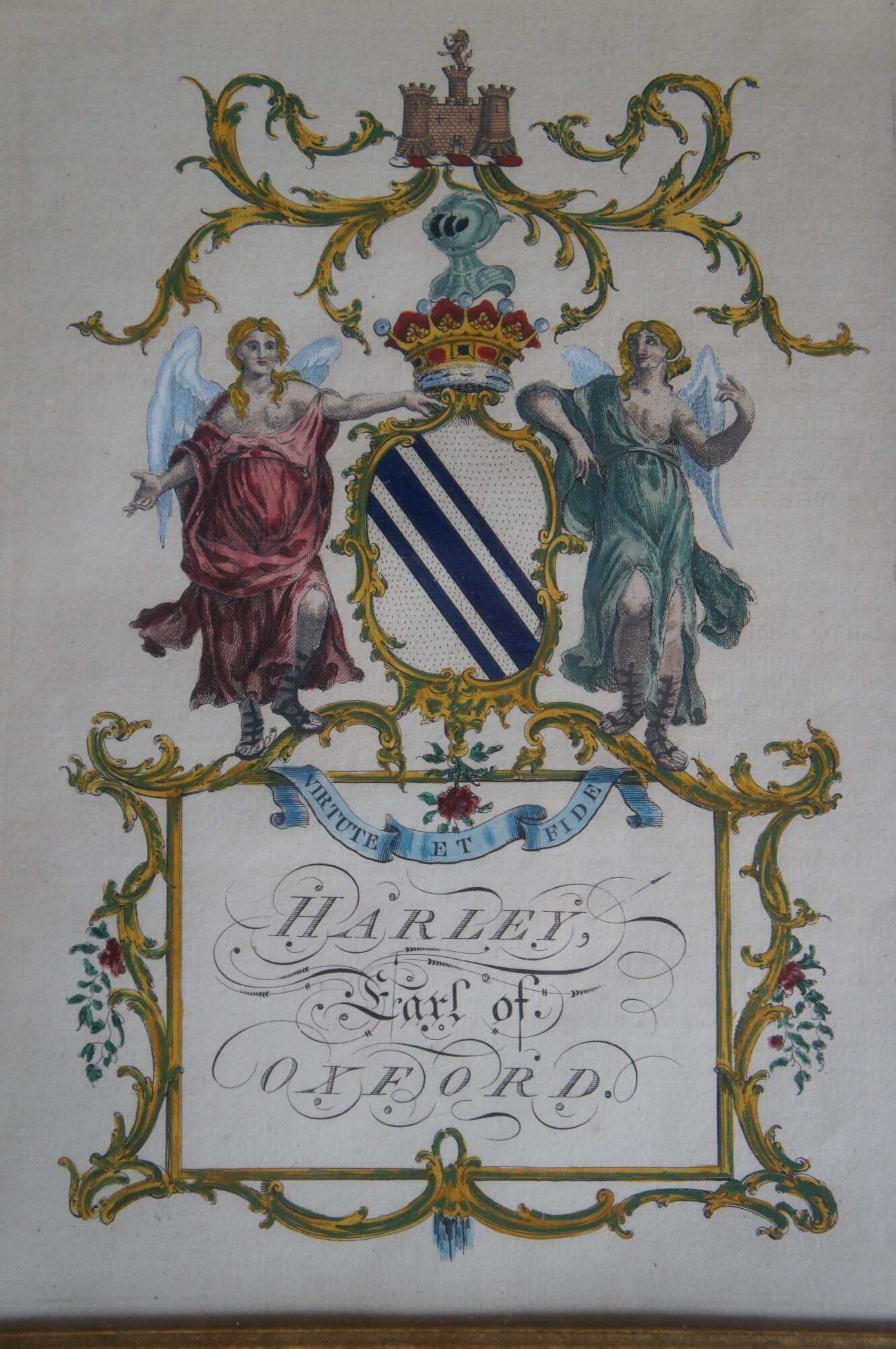 Set of three Armorial Colored Engravings. Each showcases a different family crest / coat of Arms. Features Harley Earl of Oxford, Wal of Waldegrave Earl of Waldegrave and Hervey Earl of Bristol. Each engraving is ornately framed with a Green Mat and Gold Finish.