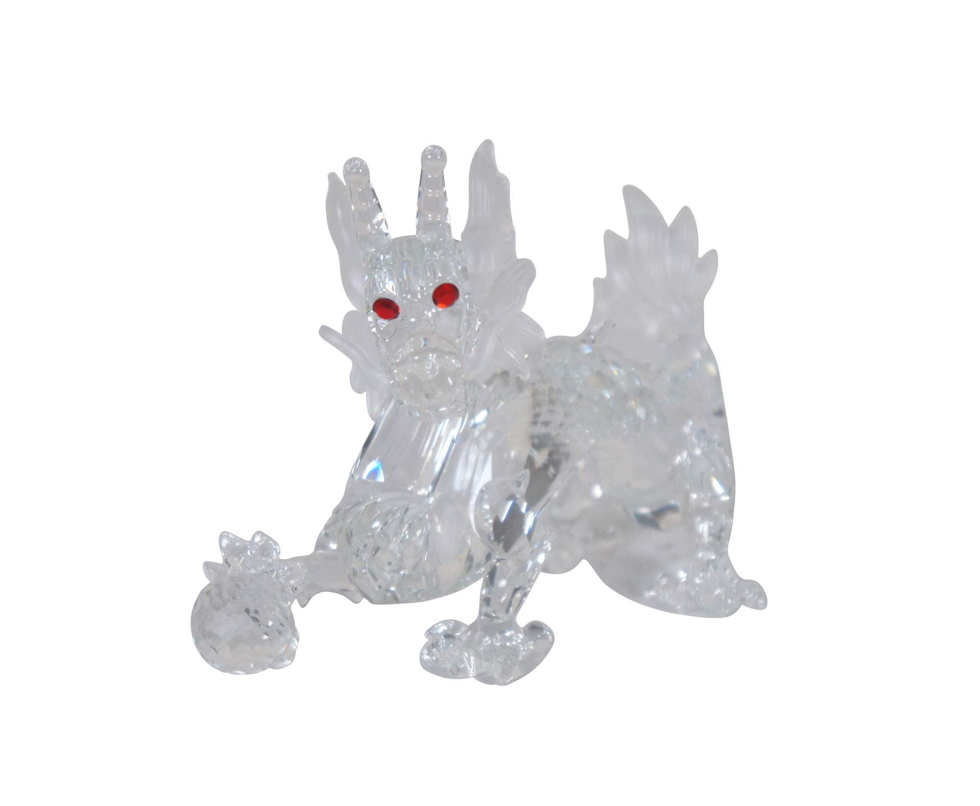Swarovski Collectors Society 1997 Annual Edition, Fabulous Creatures series, The Dragon. Clear crystal figurine in the shape of a Chinese dragon with frosted accents, red eyes, and an orb under one claw. Includes original packaging. Made in Austria.
