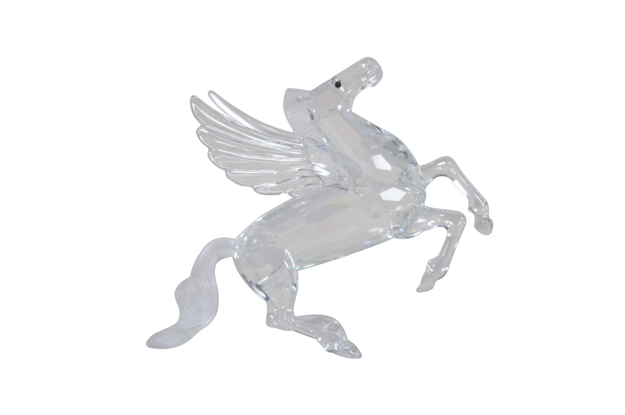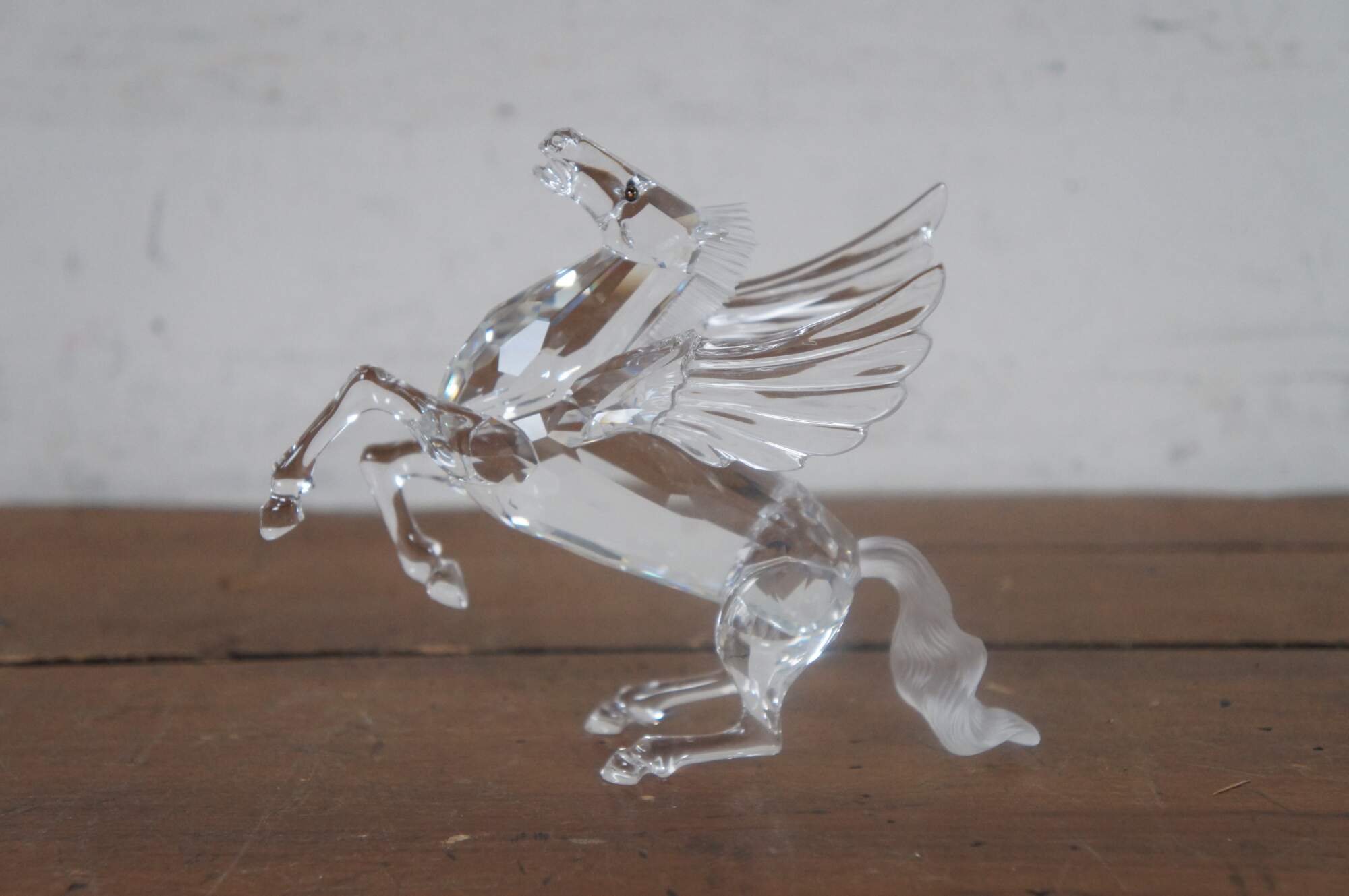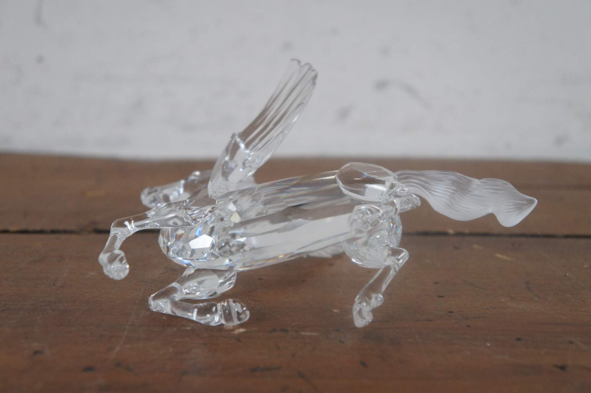Swarovski Collectors Society 1998 Annual Edition, Fabulous Creatures series, The Pegasus Horse. Clear crystal figurine in the shape of a Greek pegasus with frosted mane / tail, and dark eyes. Includes original packaging. Made in Austria.