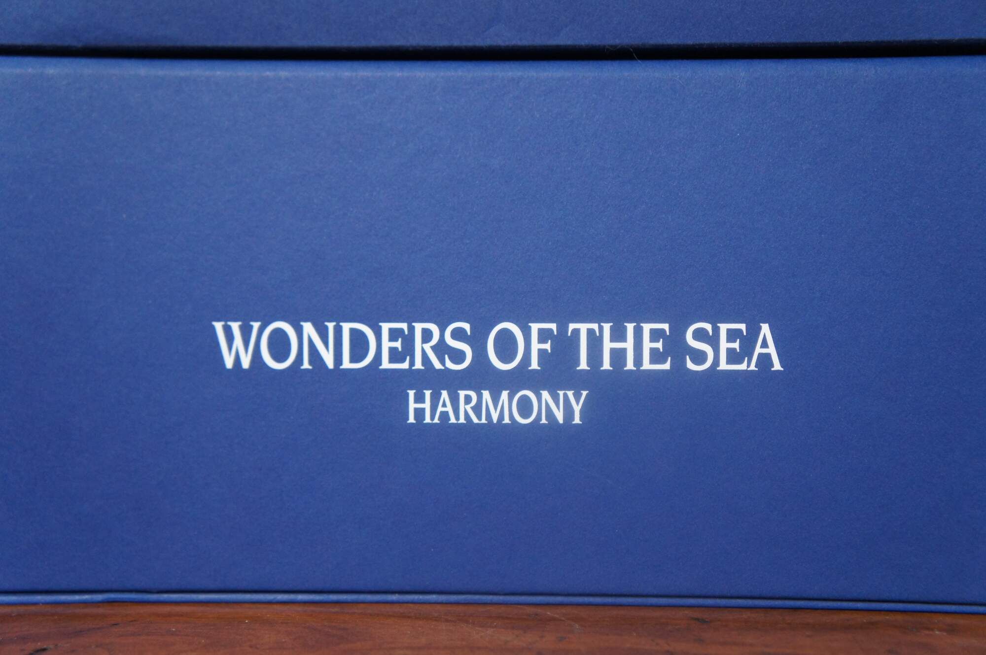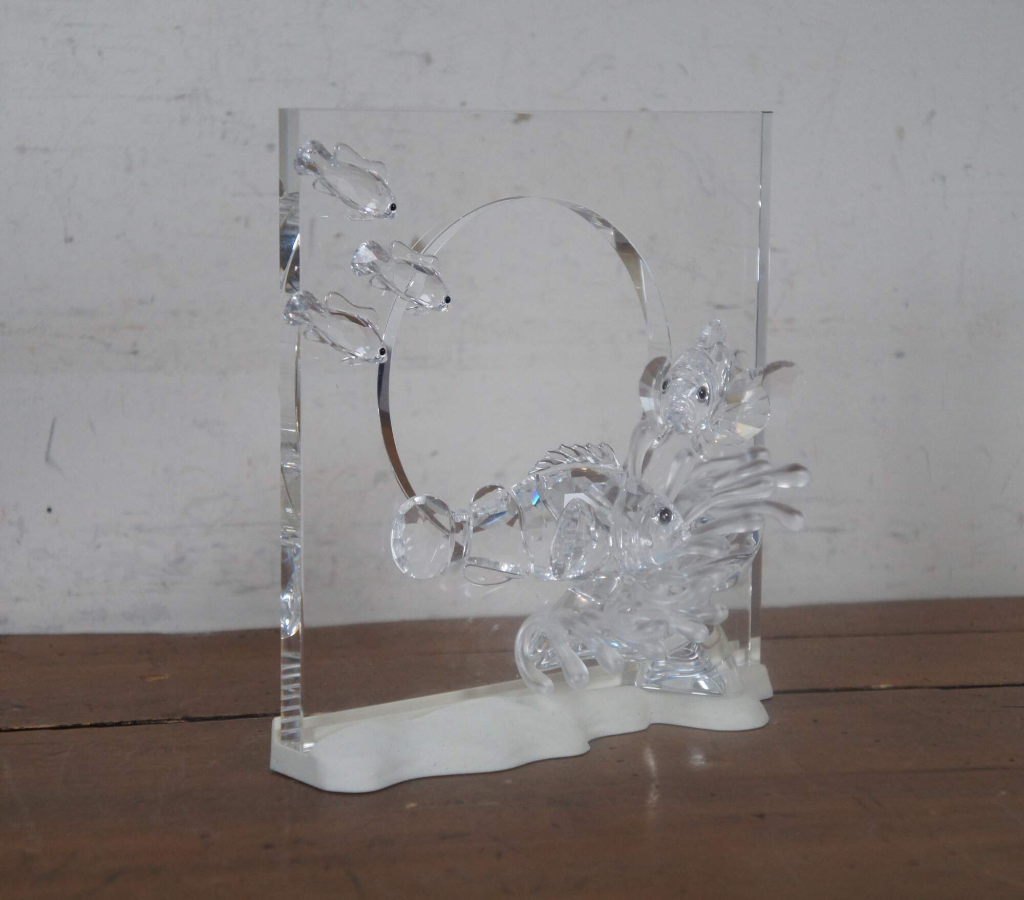Swarovski Collectors Society 2005, the first piece of the triology Wonders of the Sea, Harmony. Clear crystal figurine depicting clown fish and coral on a circle pierced crystal block, and including sand shaped base / stand, mirror, and ocean backdrop for multiple display possibilities. Includes Certificate of Authenticity and original packaging. Made in Austria.