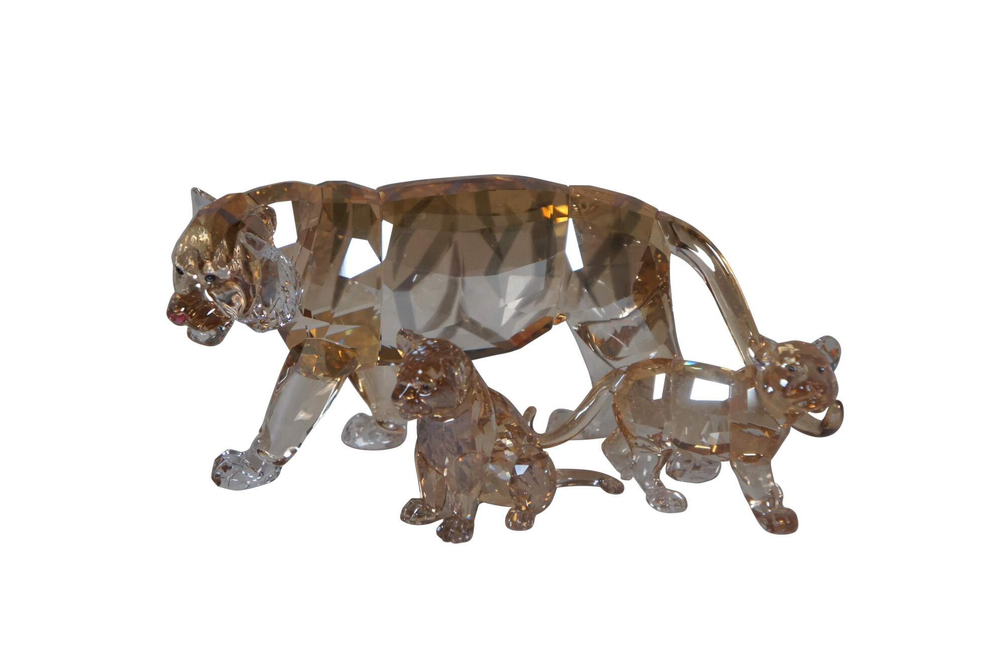 Swarovski Collectors Society 2010 Annual Edition Endangered Wildlife series, Tiger and Companions cubs. Trio of golden brown crystal figurines in the shape of a mother / adult Bengal tiger and pair of cubs, with translucent black stripes , pink nose, and black eyes. Includes Certificate of Authenticity and original packaging for adult tiger. Made in Austria.