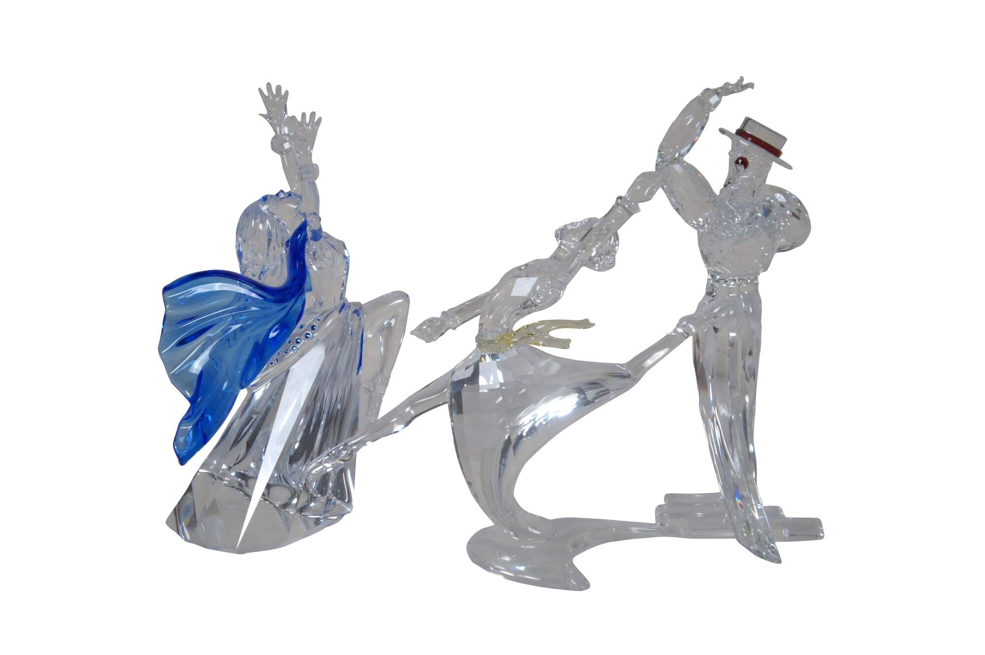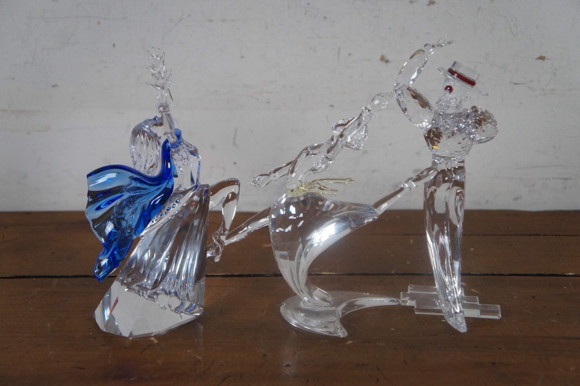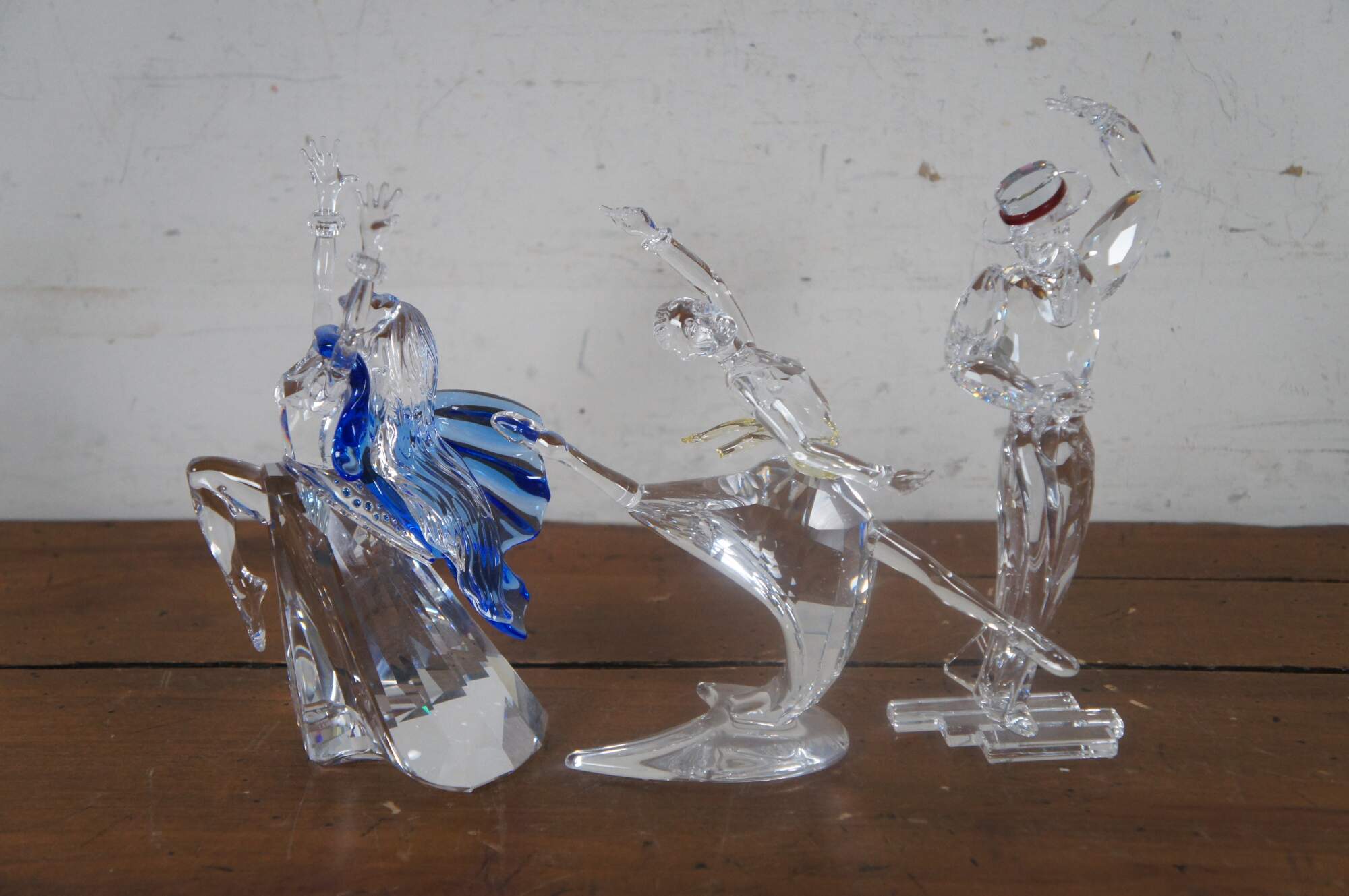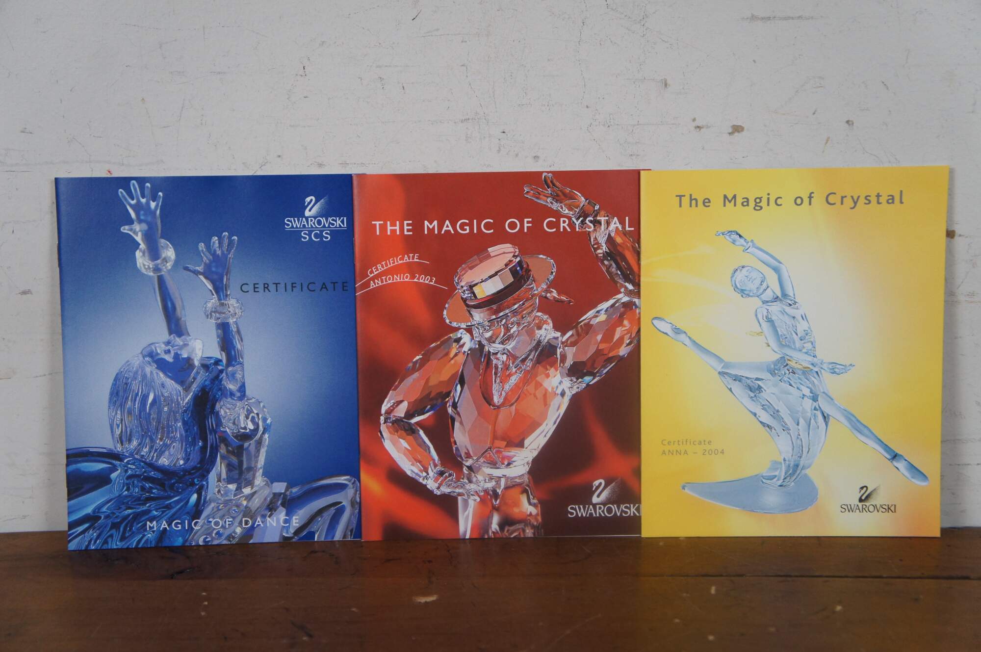 Swarovski Collectors Society Magic of Dance (Magic of Crystal) series trilogy including 2002 - Isadora, 2003 - Antonio, 2004 - Anna. Clear crystal figurines depicting pioneer of modern contemporary dance Isadora Duncan, flamenco dancer Antonio Luis Soler, and ballerina Anna Pavlova, each with a colored accent. Includes Certificates of Authenticity and original packaging. Made in Austria.