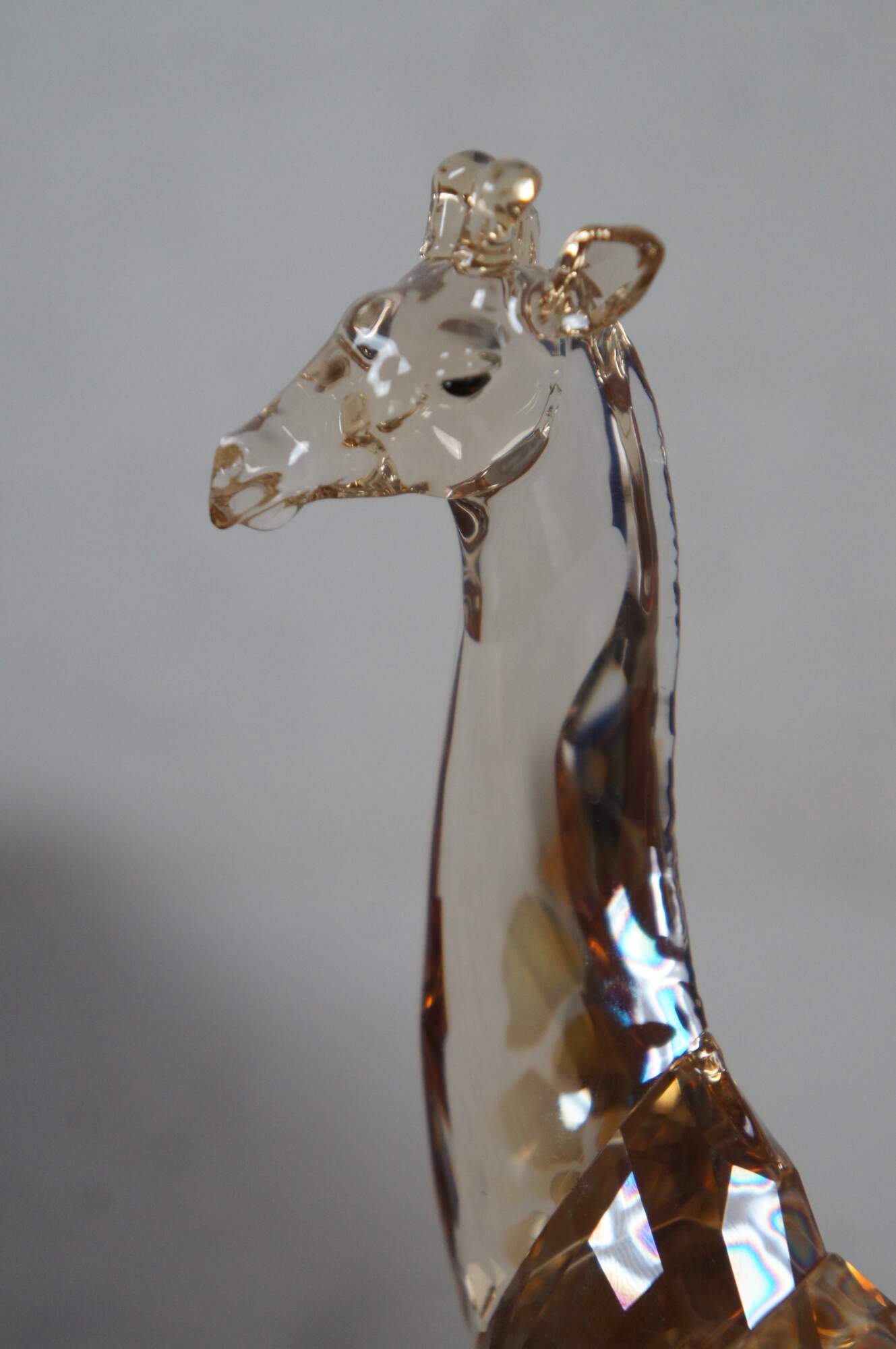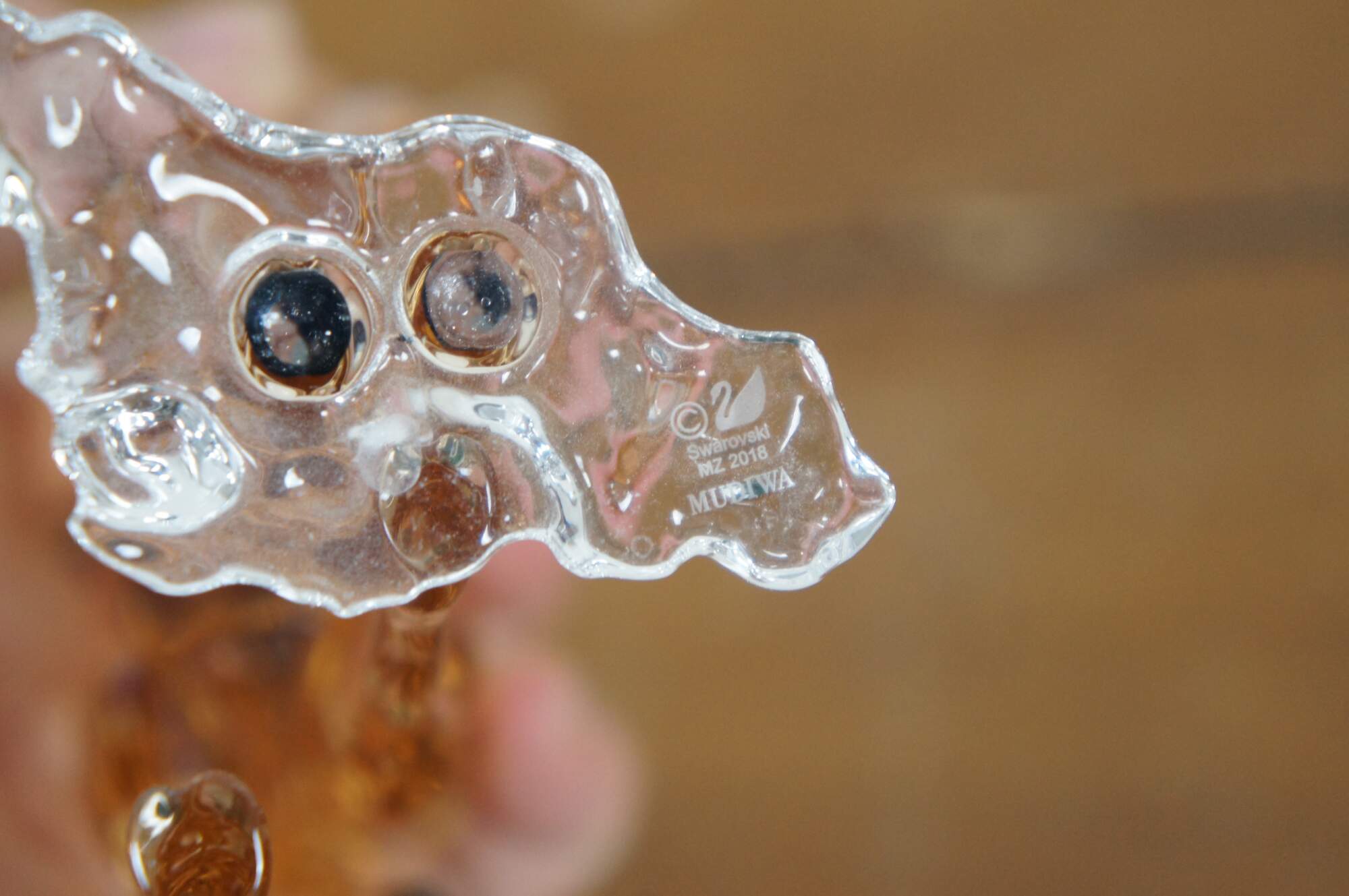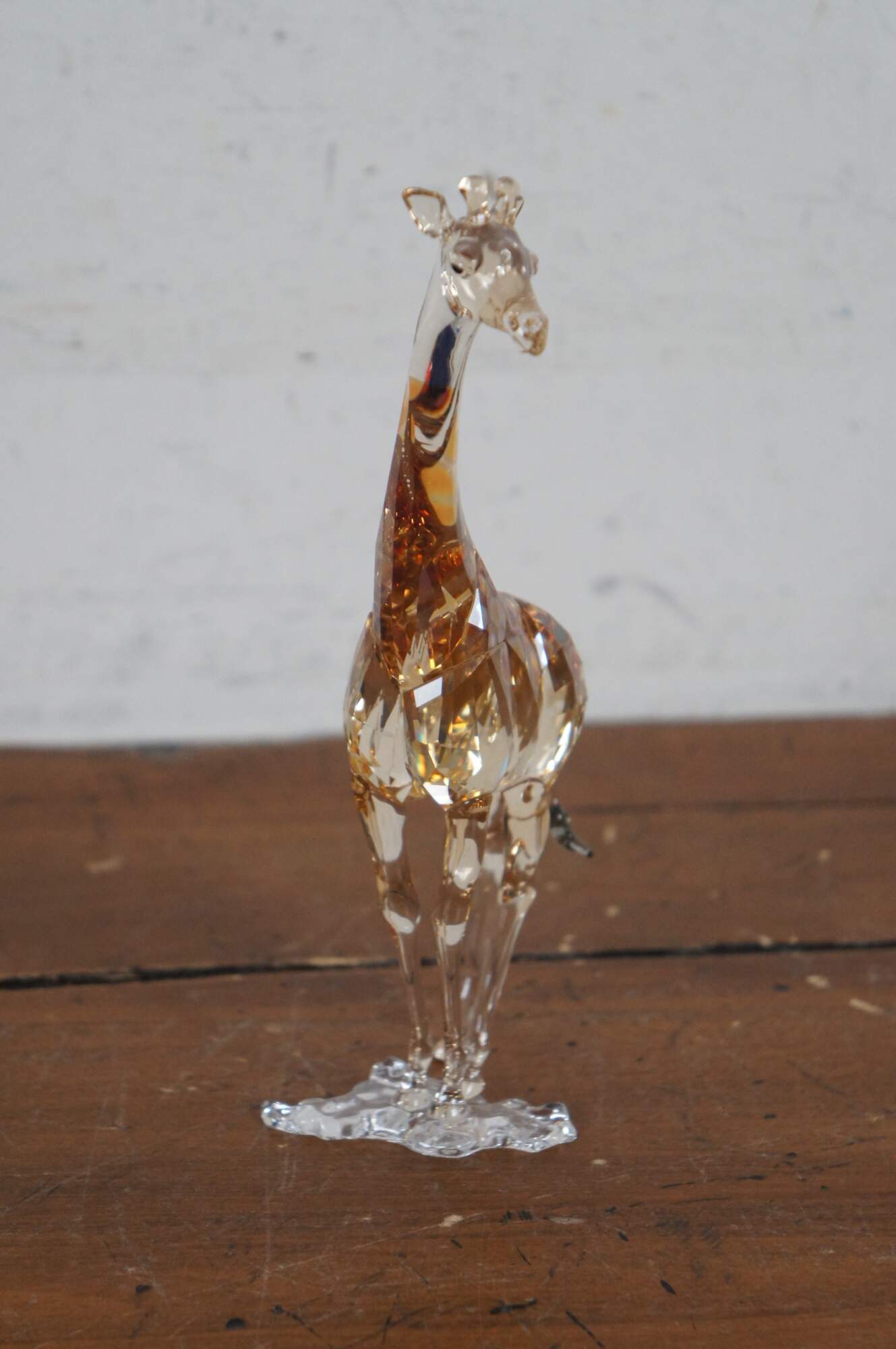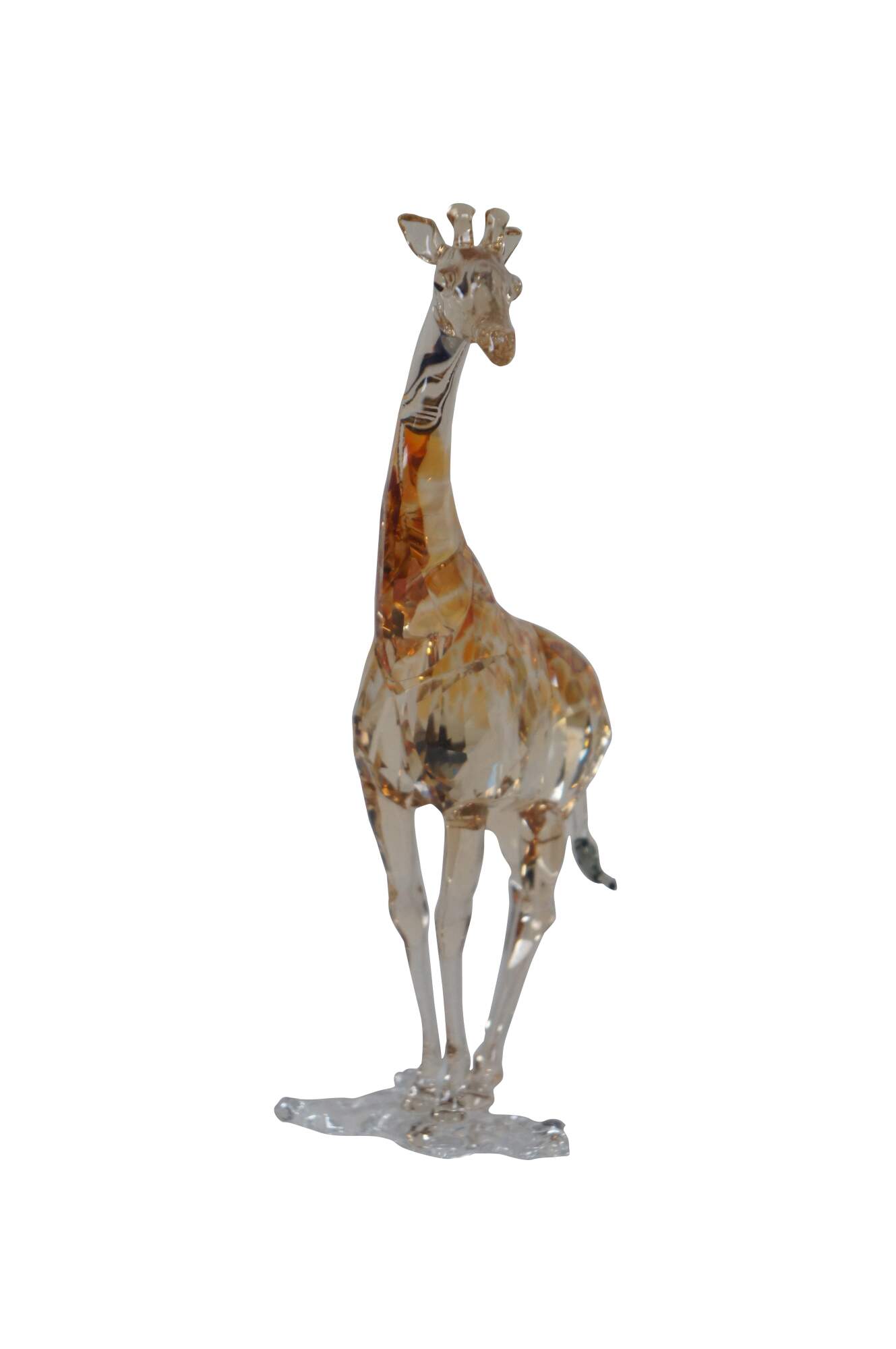 Swarovski Collectors Society 2018 Annual Edition, Mudiwa. Light brown crystal figurine in the shape of a giraffe with clear base, translucent spots, and black eyes / tail tuft. Includes original packaging. Made in Austria.