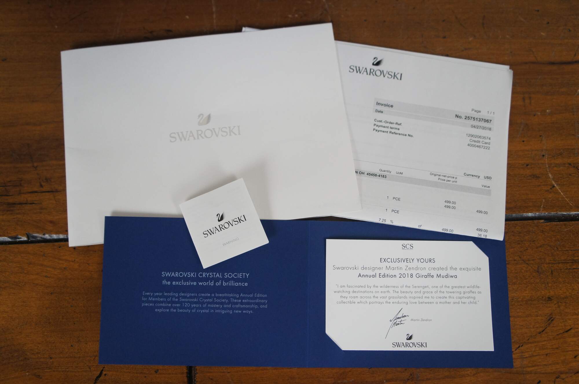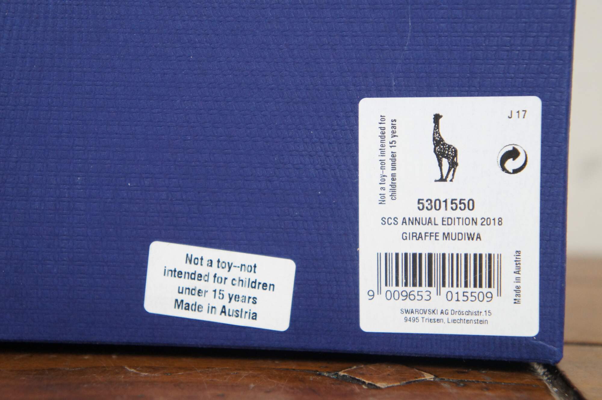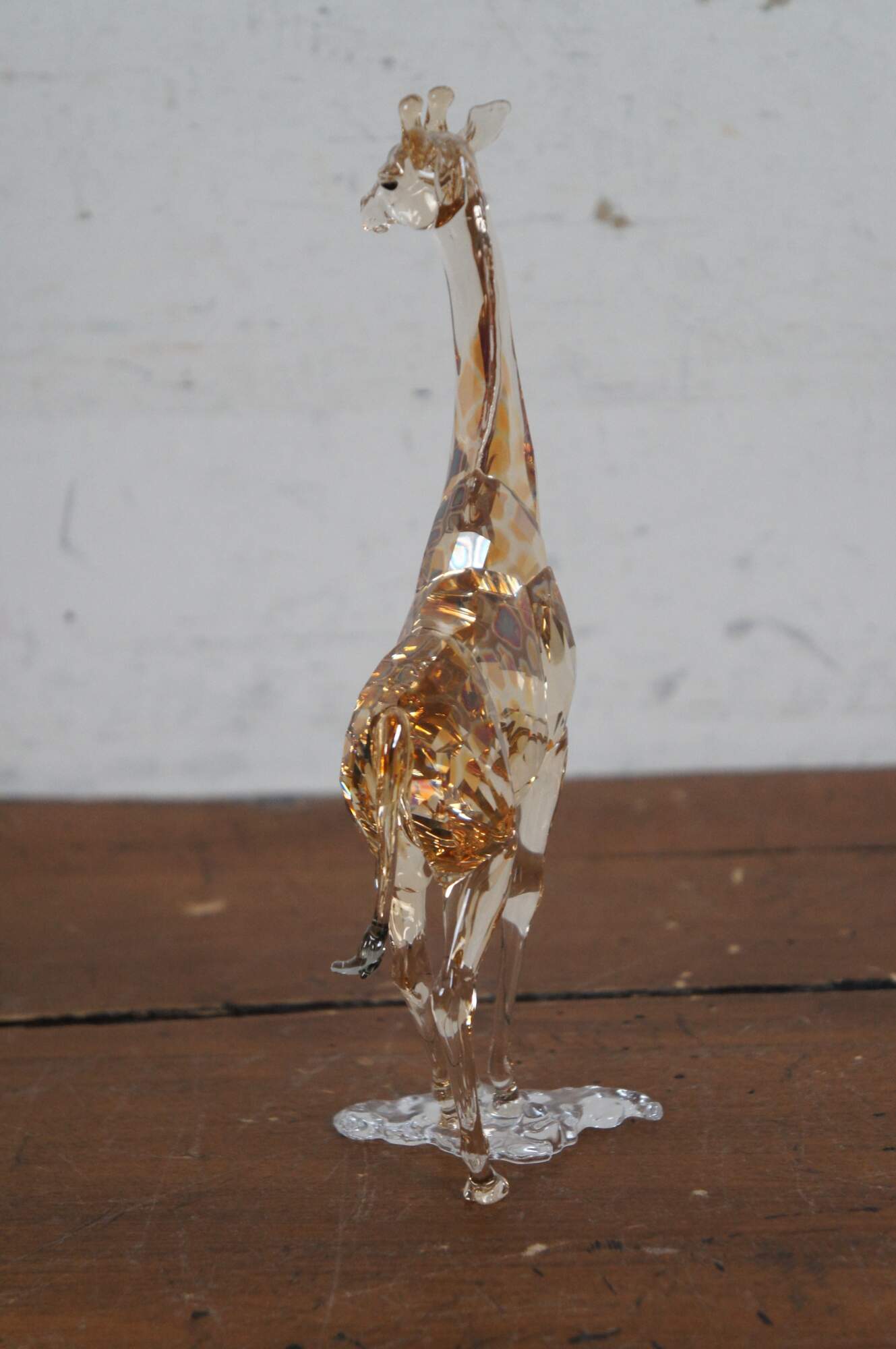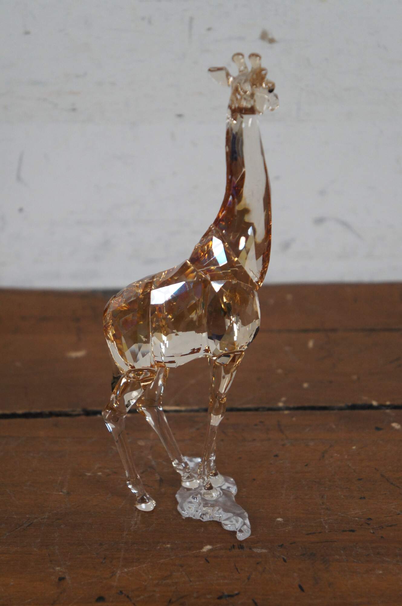Swarovski Collectors Society 2018 Annual Edition, Mudiwa. Light brown crystal figurine in the shape of a giraffe with clear base, translucent spots, and black eyes / tail tuft. Includes original packaging. Made in Austria.